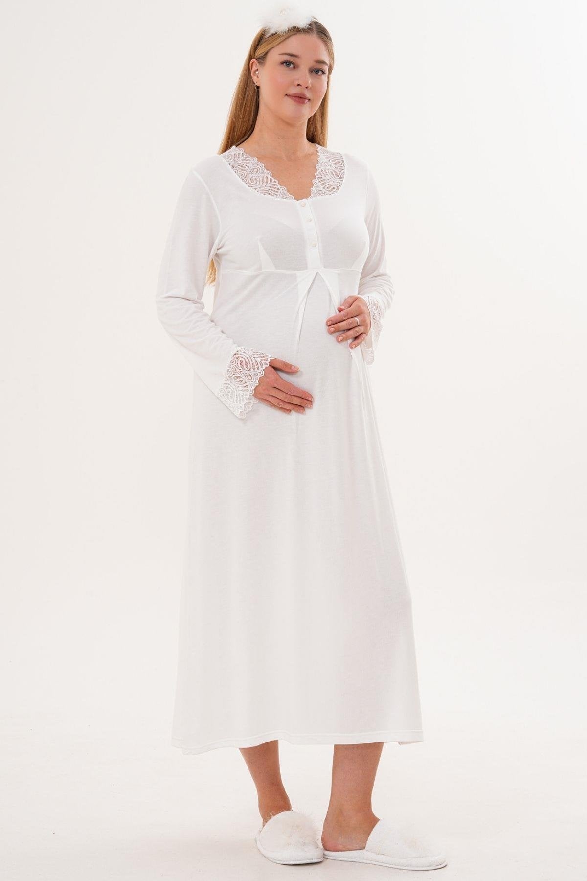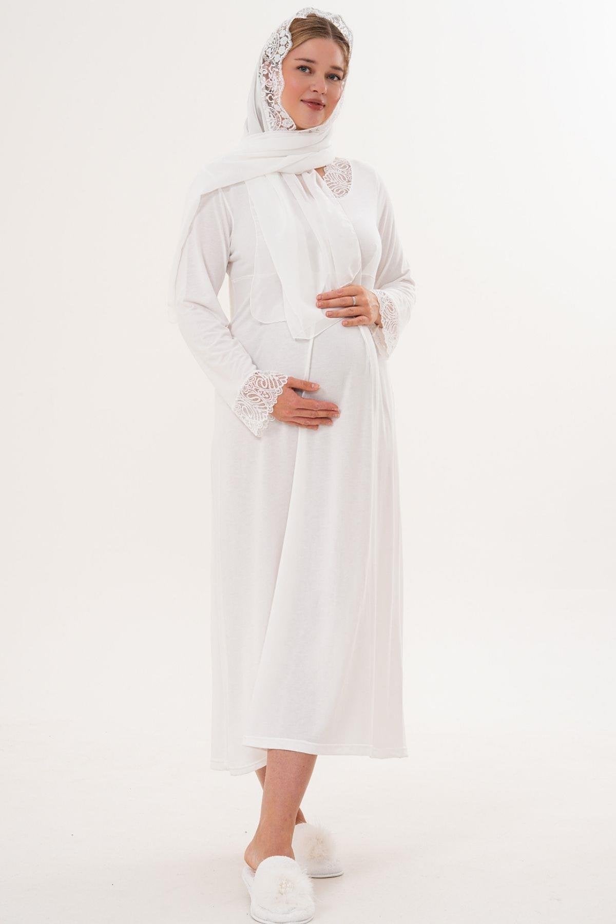 2’Li Sabahlık Gecelik Takımı - Dantel Detay Lohusa Hamile Takım Ekru- 6331