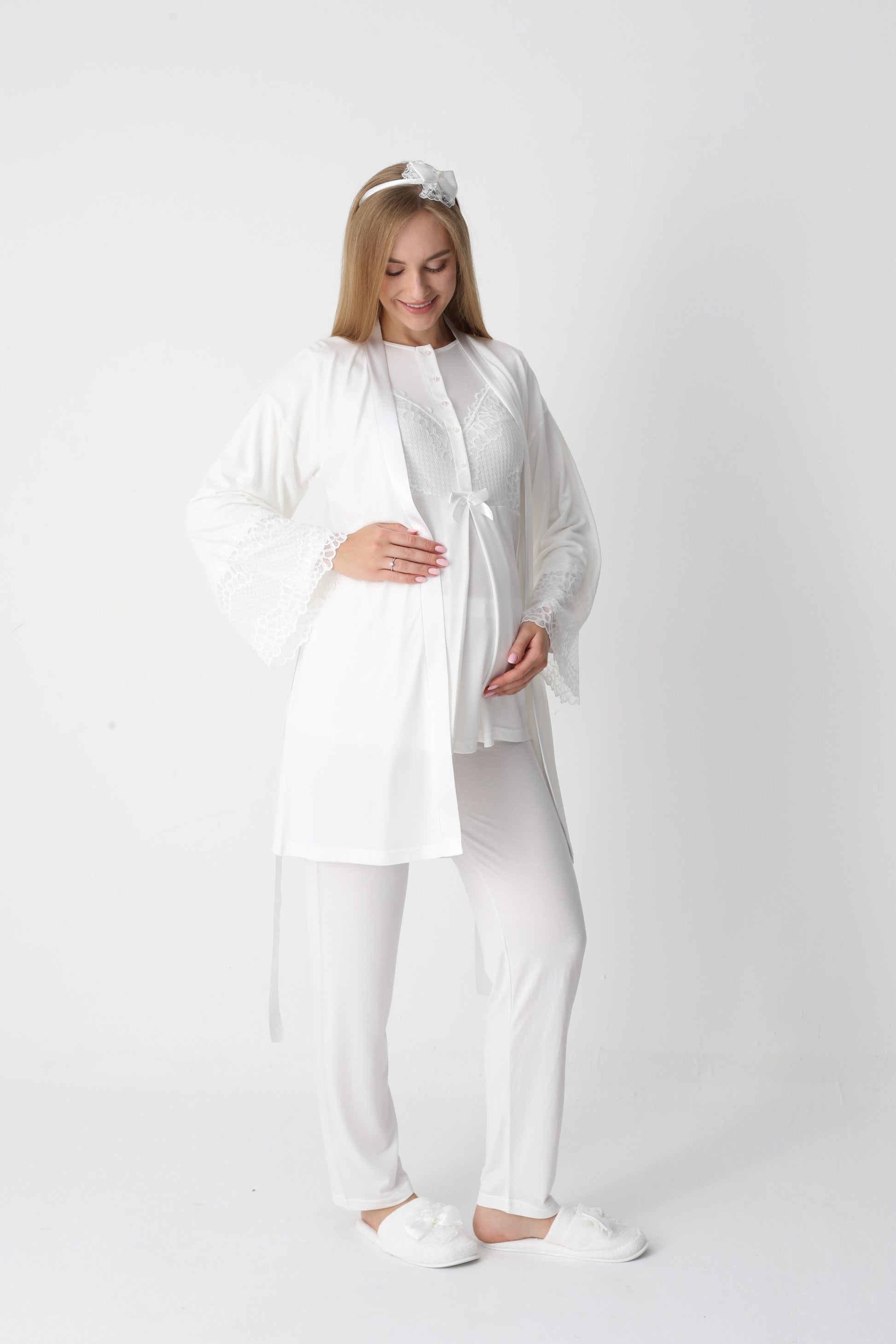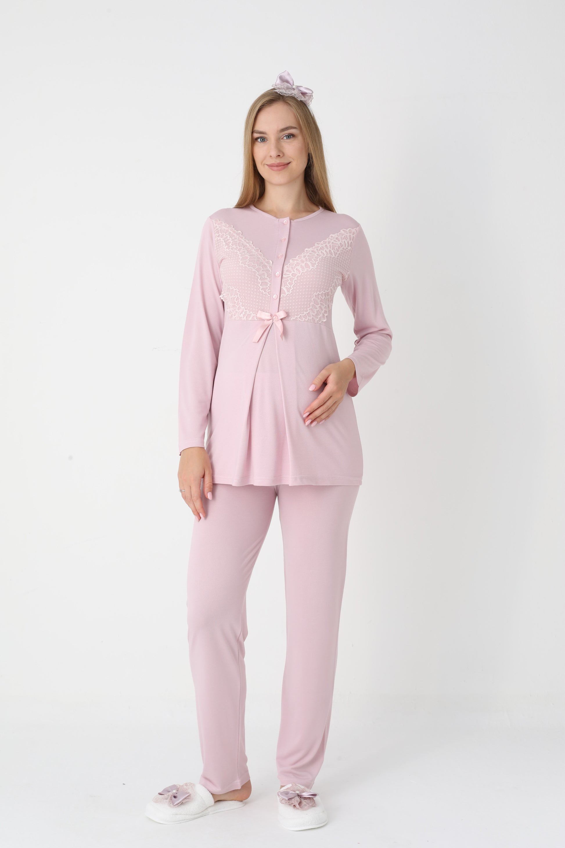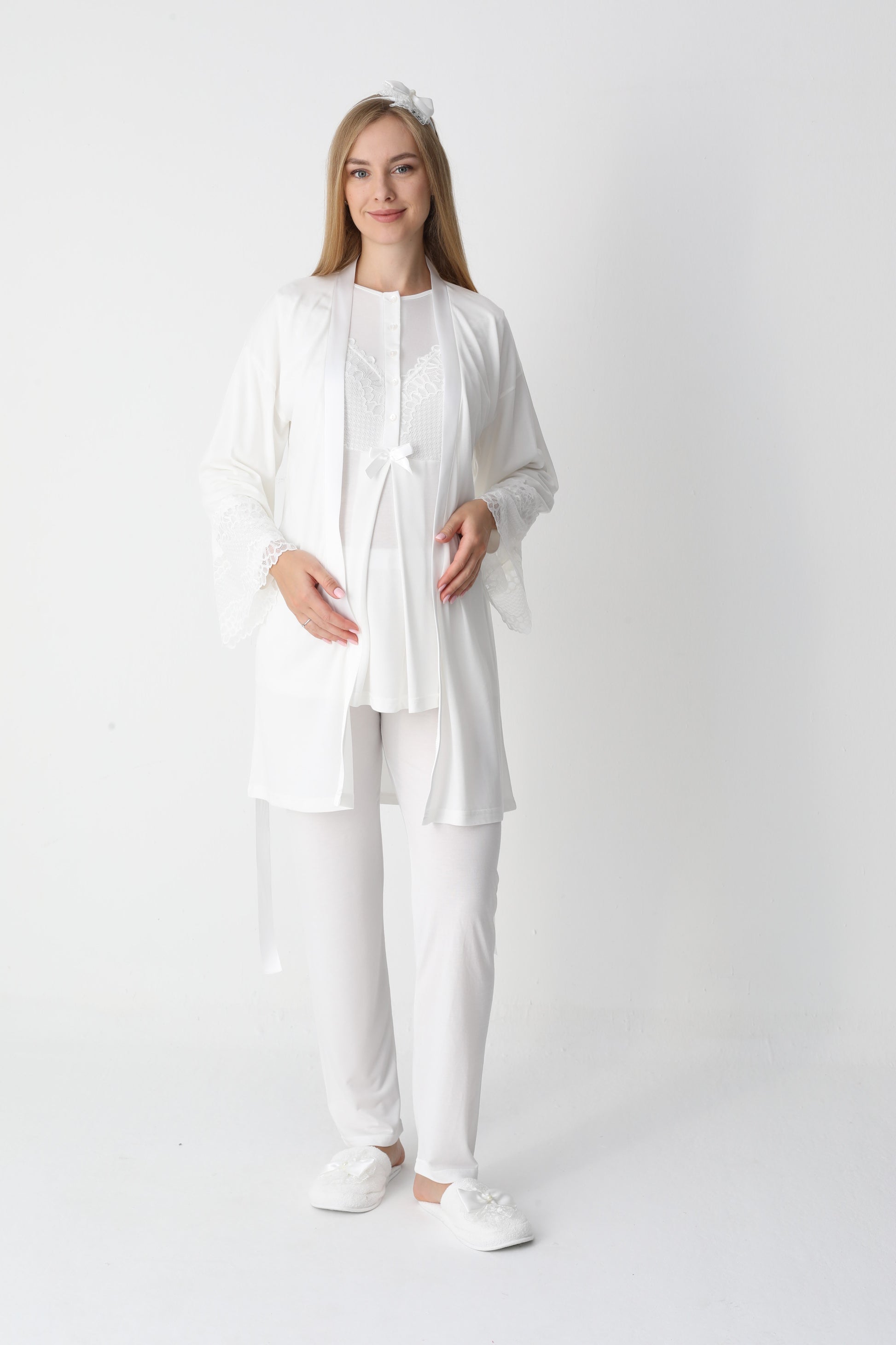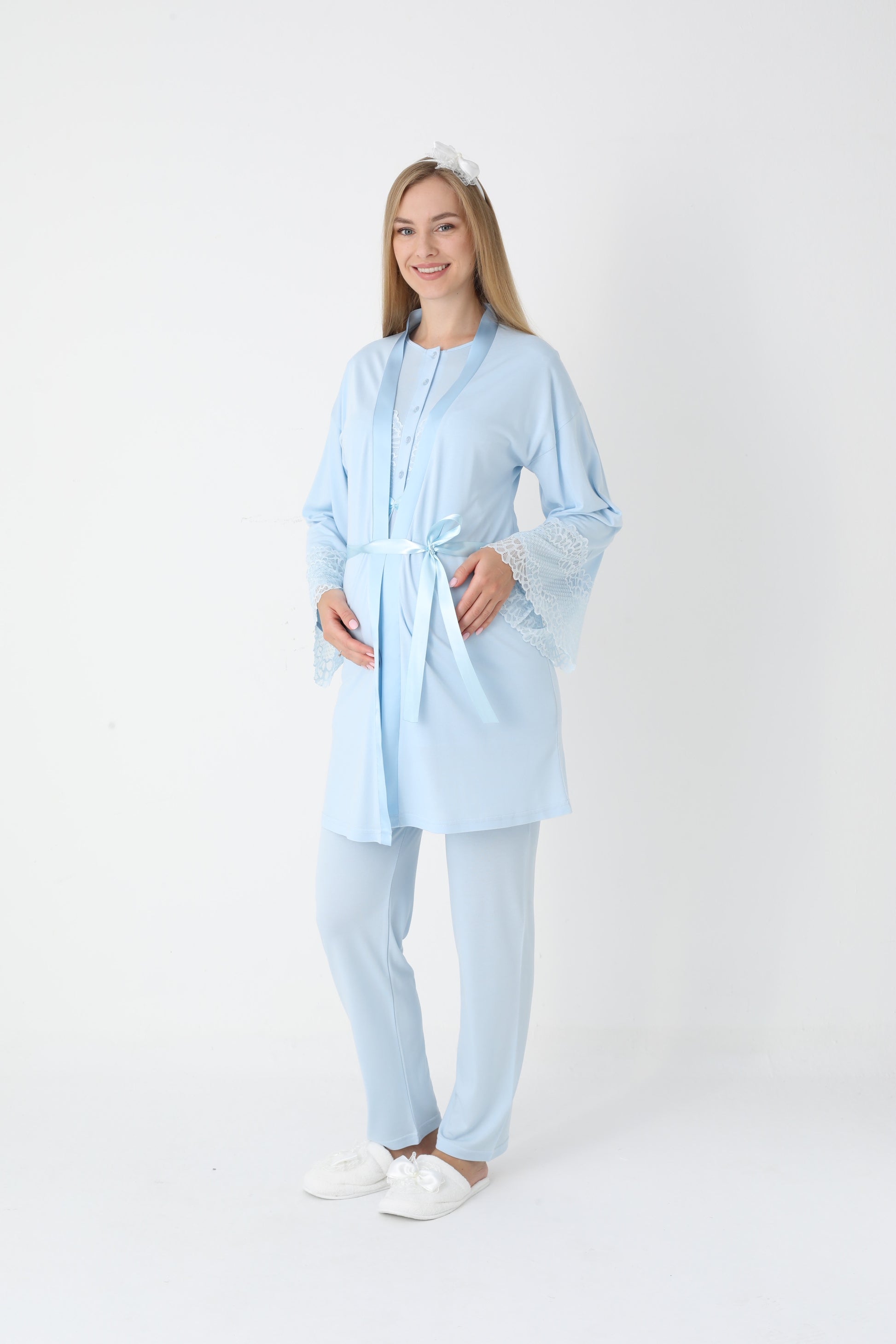 Yumuşacık dokusu ve şıklığı ile her anne adayının ve yeni annenin dolabını süsleyecek olan bu takım, hem rahatlık hem de estetik bir görünüm sunuyor. Anne adaylarına özel olarak tasarlanmış bu pijama ve sabahlık kombinasyonu, benzersiz detaylarıyla fark yaratıyor.