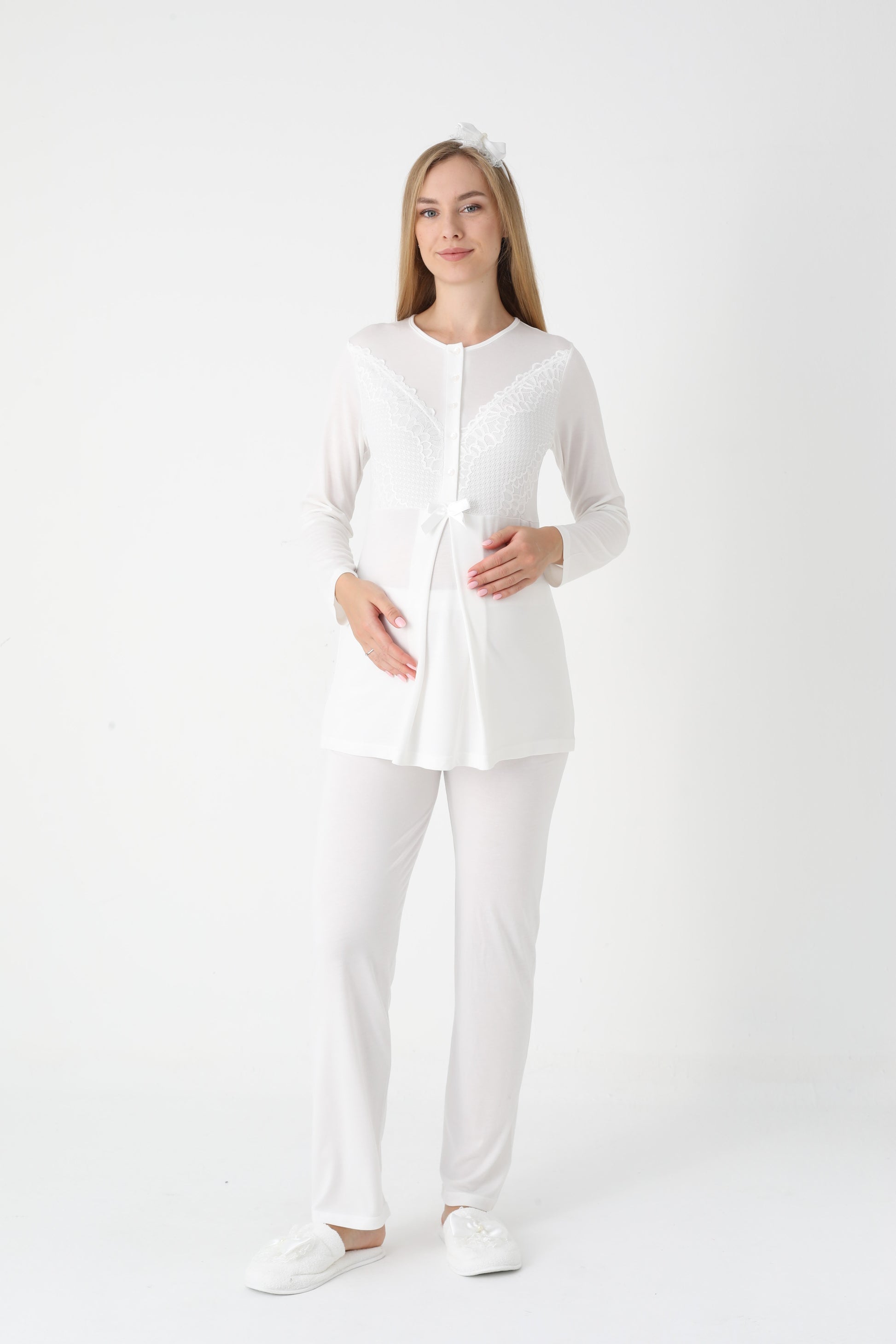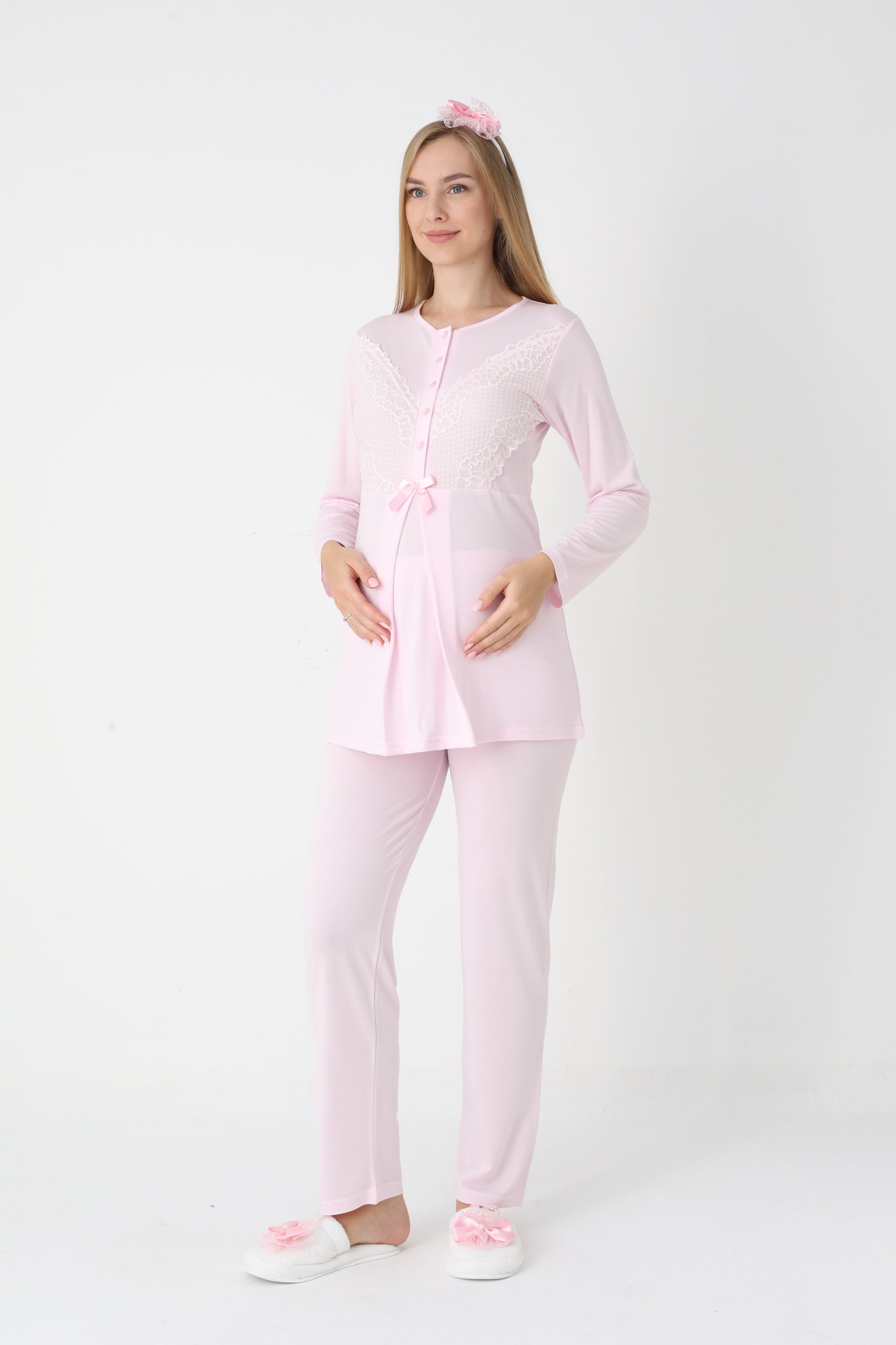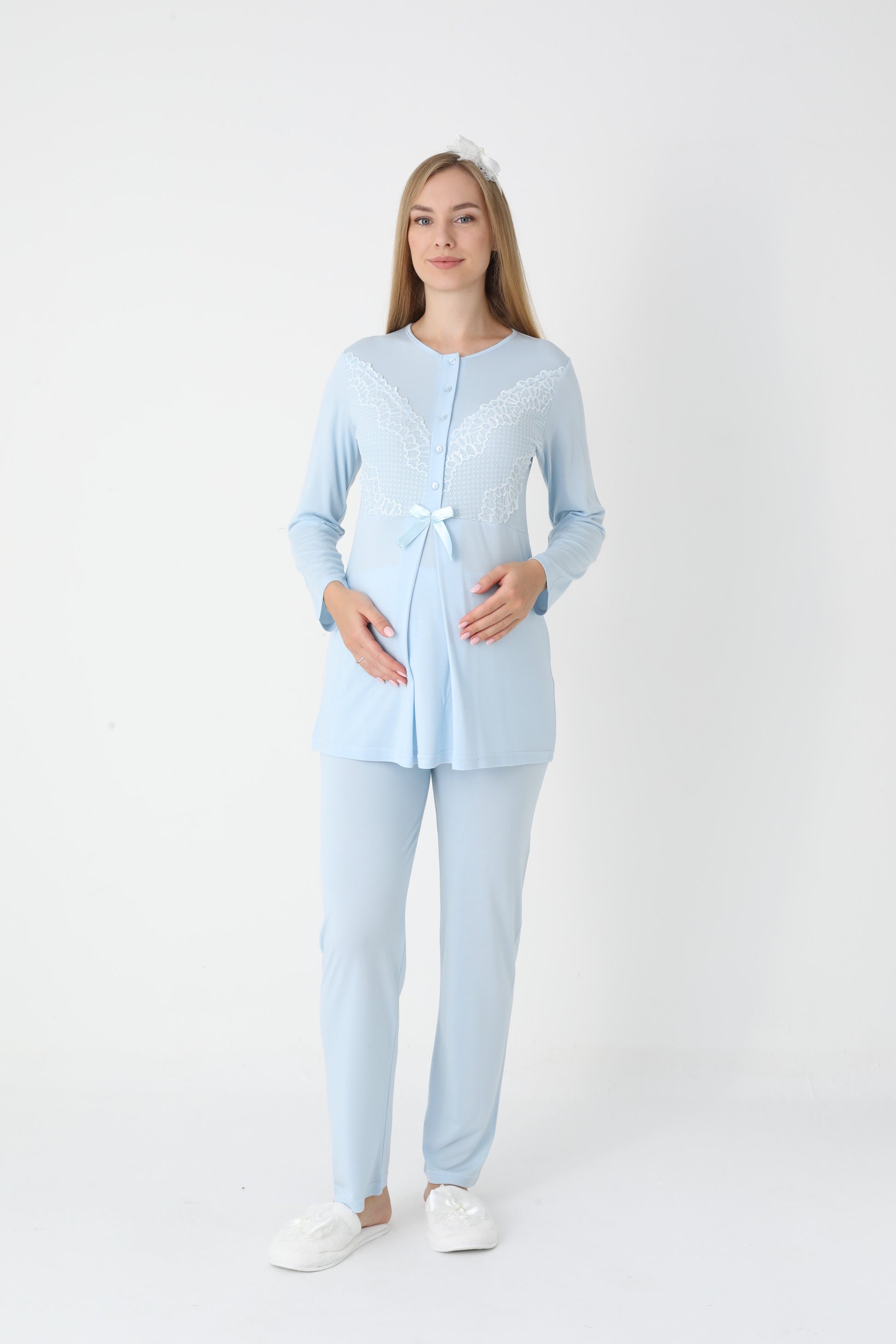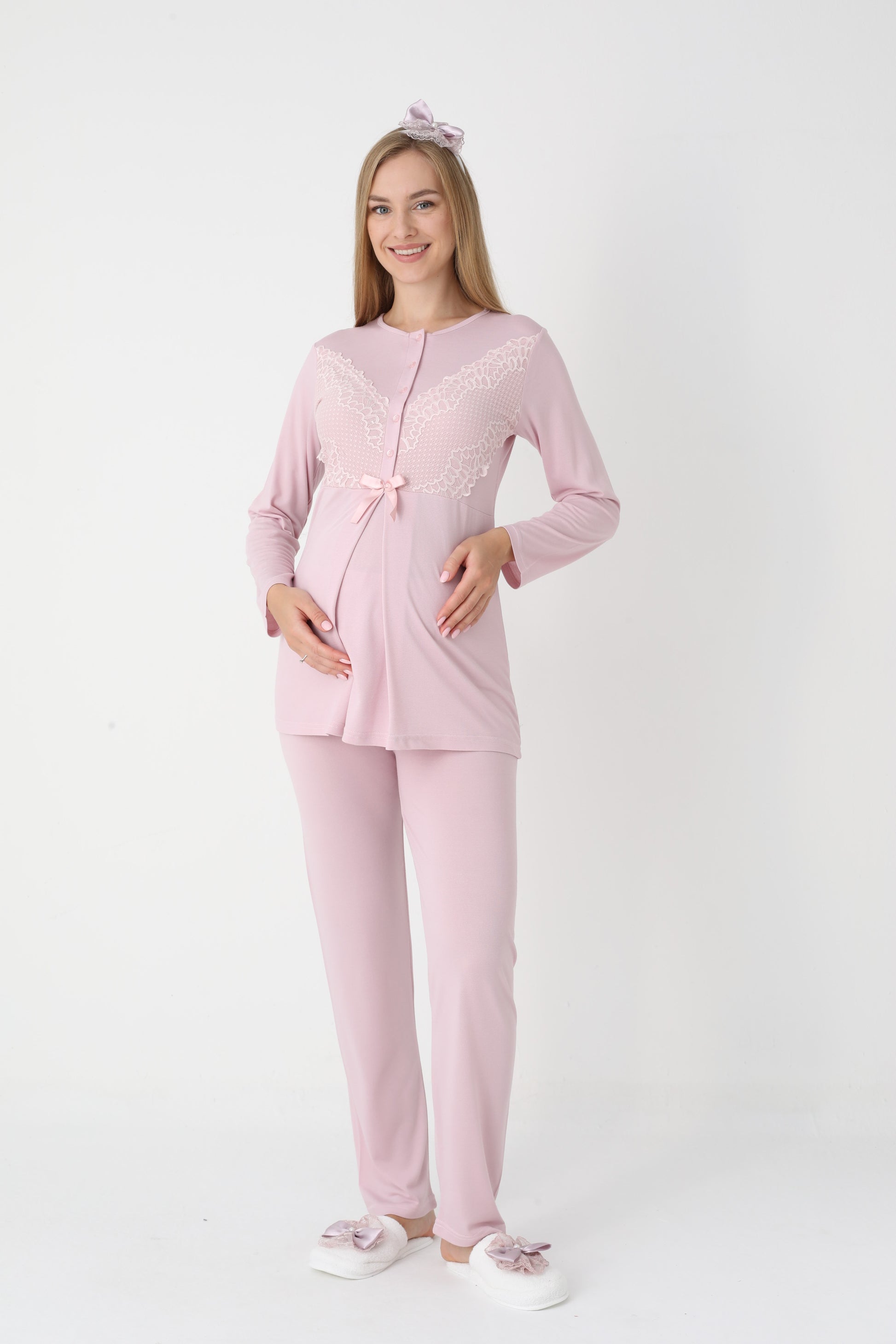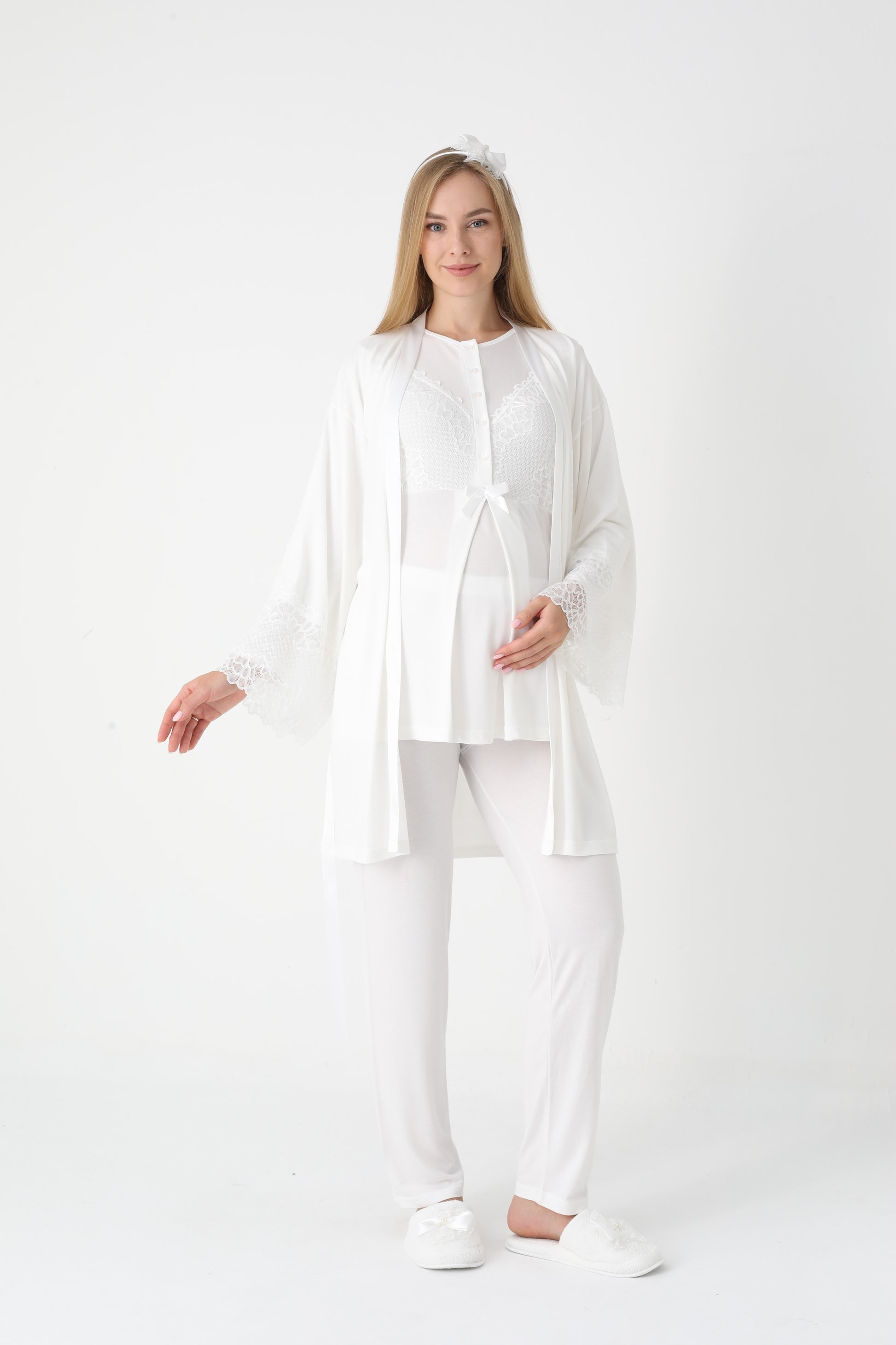 Yumuşacık dokusu ve şıklığı ile her anne adayının ve yeni annenin dolabını süsleyecek olan bu takım, hem rahatlık hem de estetik bir görünüm sunuyor. Anne adaylarına özel olarak tasarlanmış bu pijama ve sabahlık kombinasyonu, benzersiz detaylarıyla fark yaratıyor.