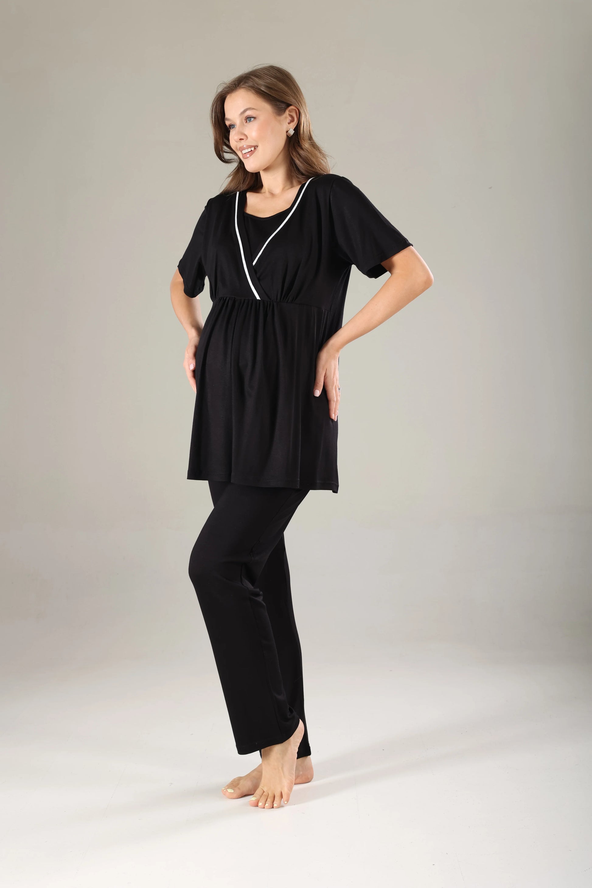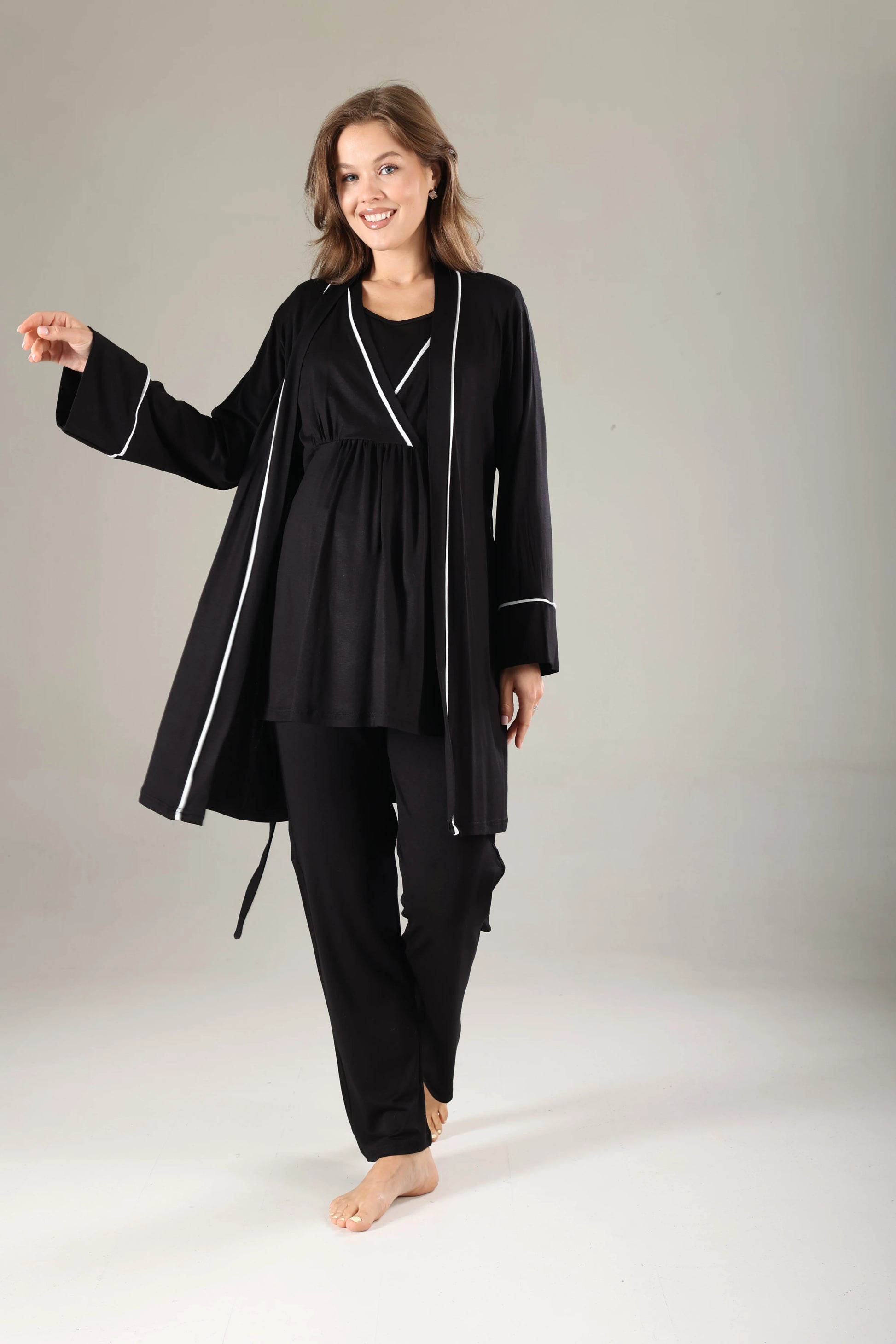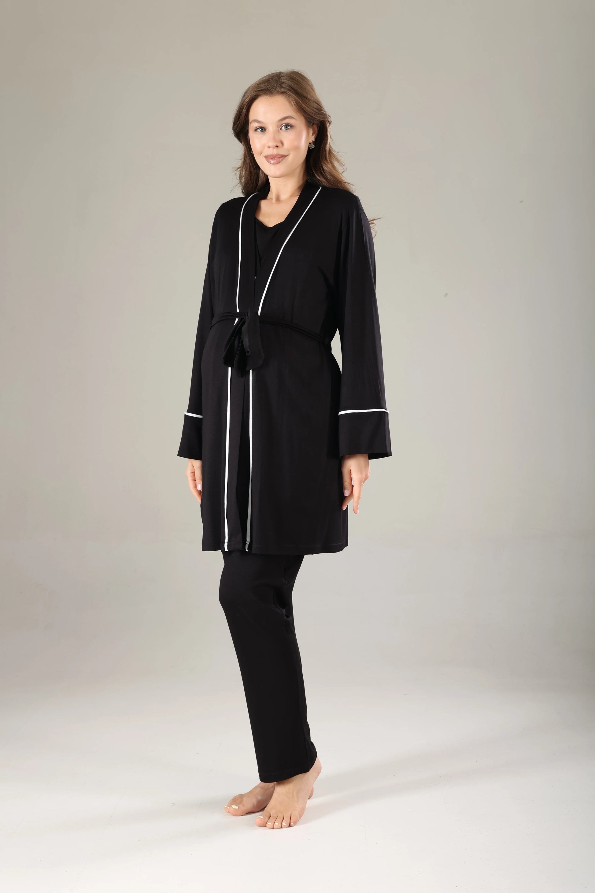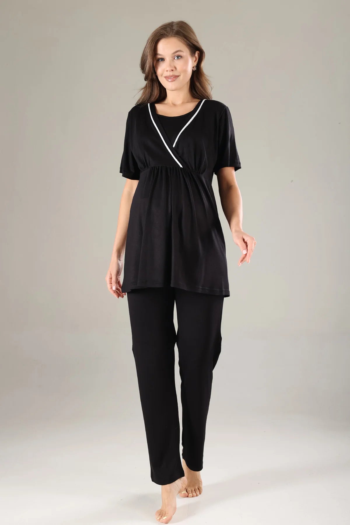 Biyeli Gizli Emzirme Özellikli Sabahlıklı Lohusa Pijama Takımı Siyah - 808
