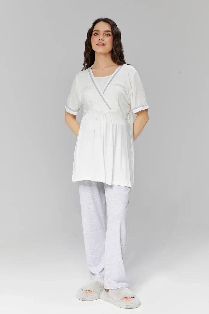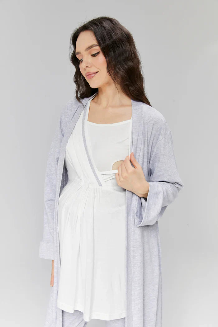 Biyeli Kruvaze Sabahlıklı Lohusa Hamile Pijama Takımı Gri- 503
