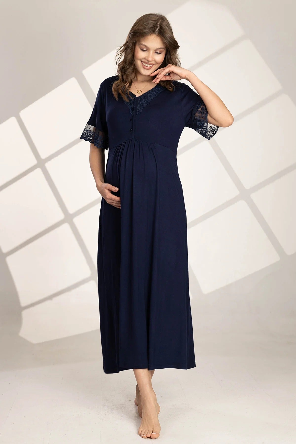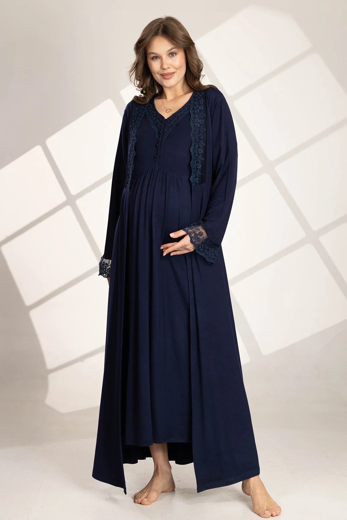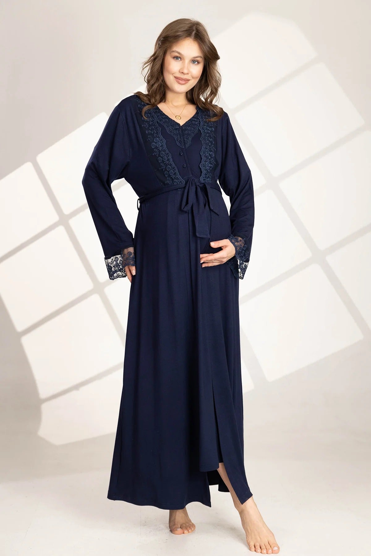 Dantel Detaylı Önden Düğmeli Sabahlıklı Lohusa Hamile Gecelik Lacivert - 562