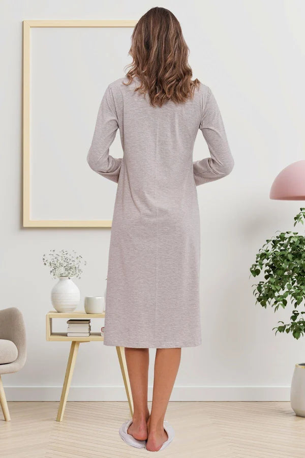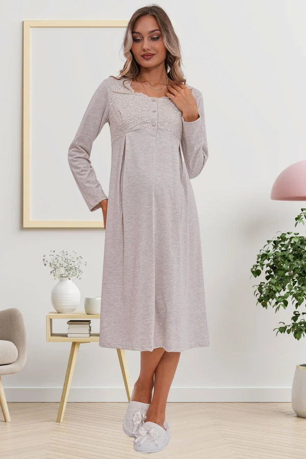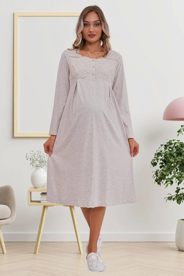 Dantel Kol Önden Düğmeli Hamile Lohusa Gecelik Vizon - 6103