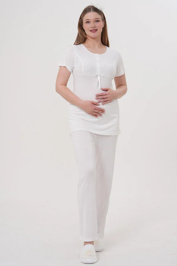 Dantel Kol Önden Düğmeli Lohusa Hamile Sabahlıklı Pijama Takımı Ekru - 1541