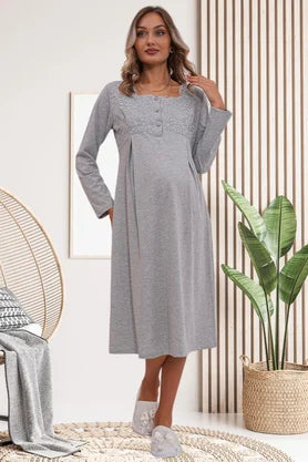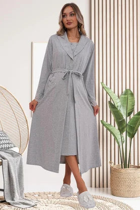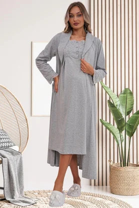 Dantel Kol Önden Düğmeli Sabahlıklı Lohusa Hamile Gecelik Takımı Gri- 6171