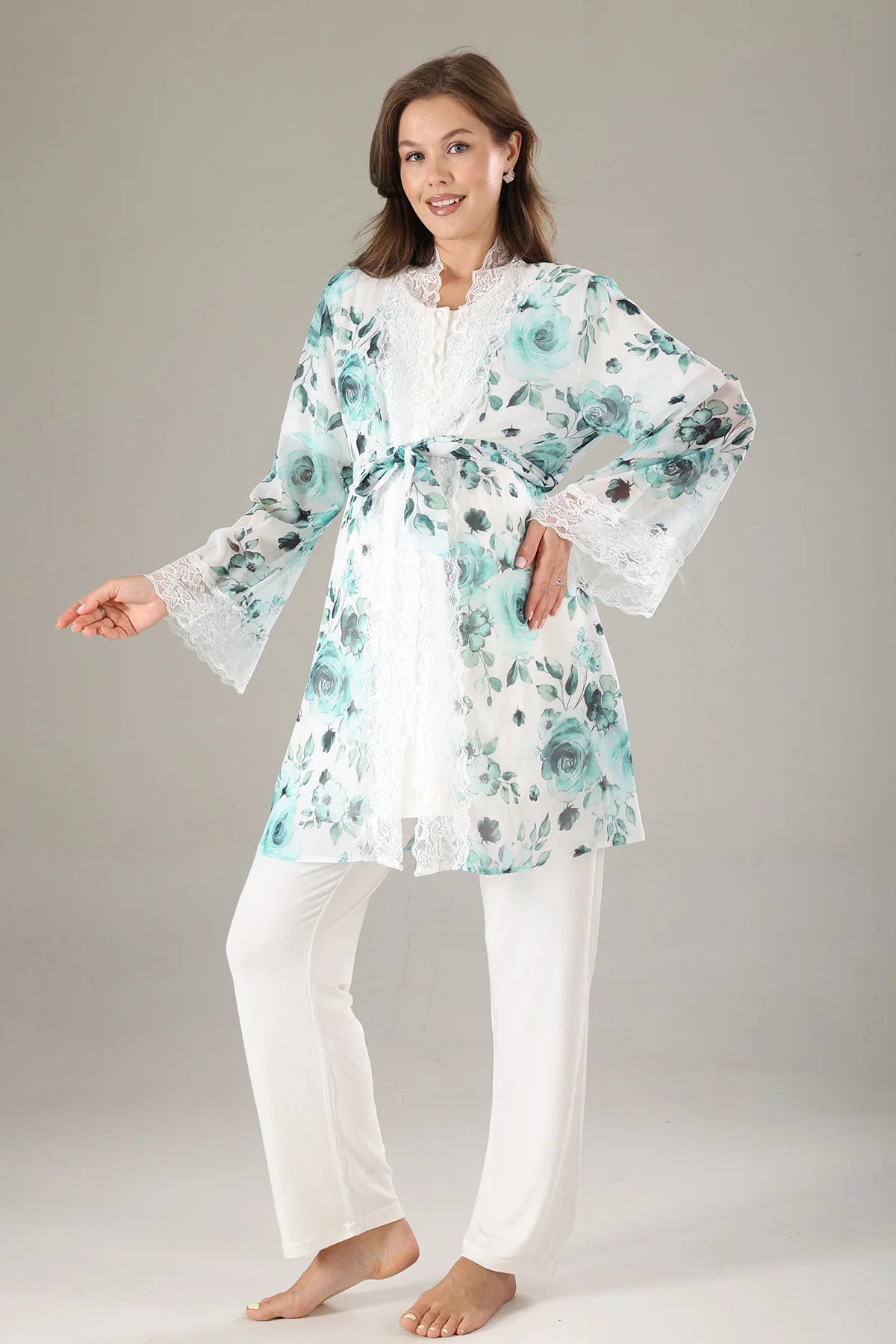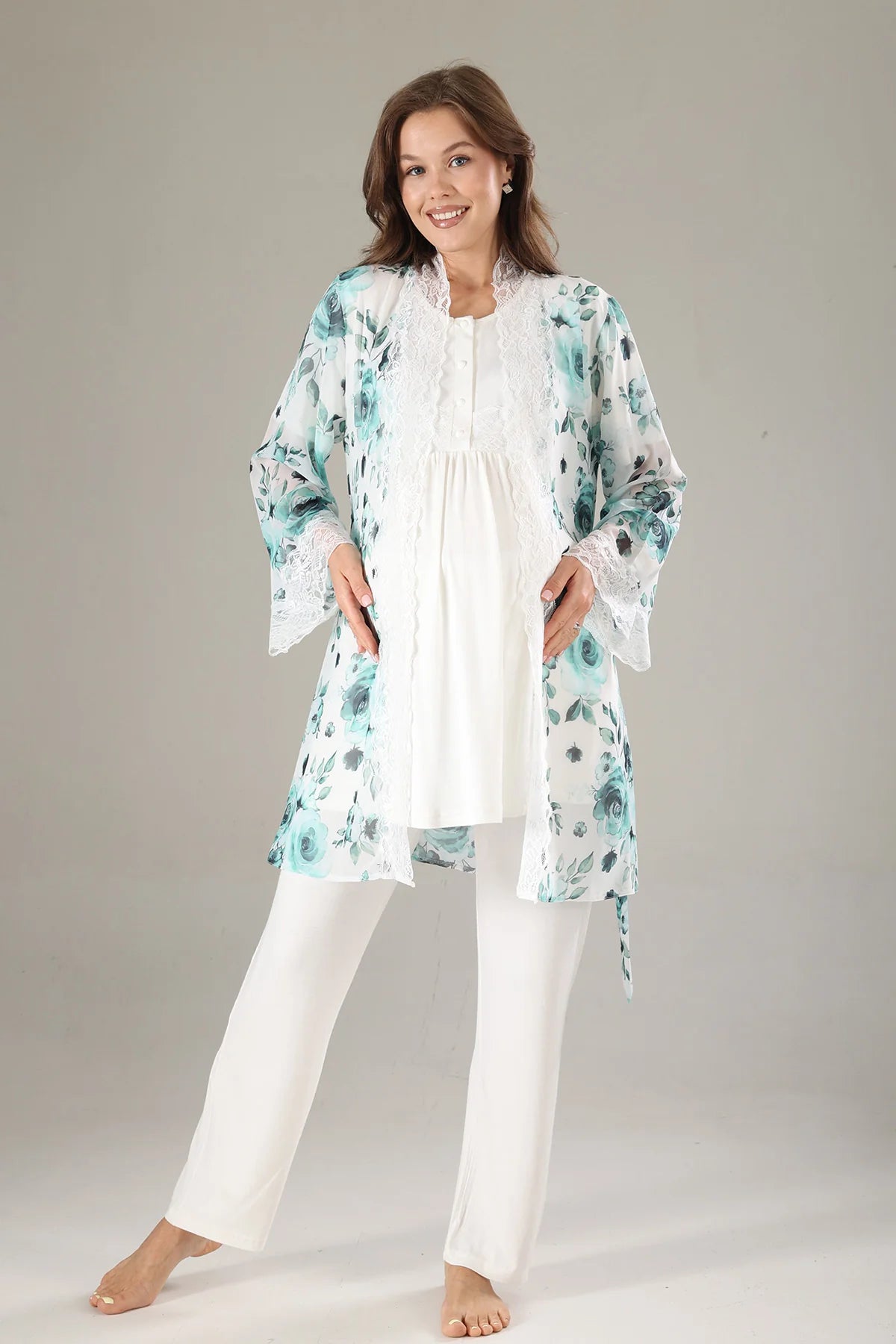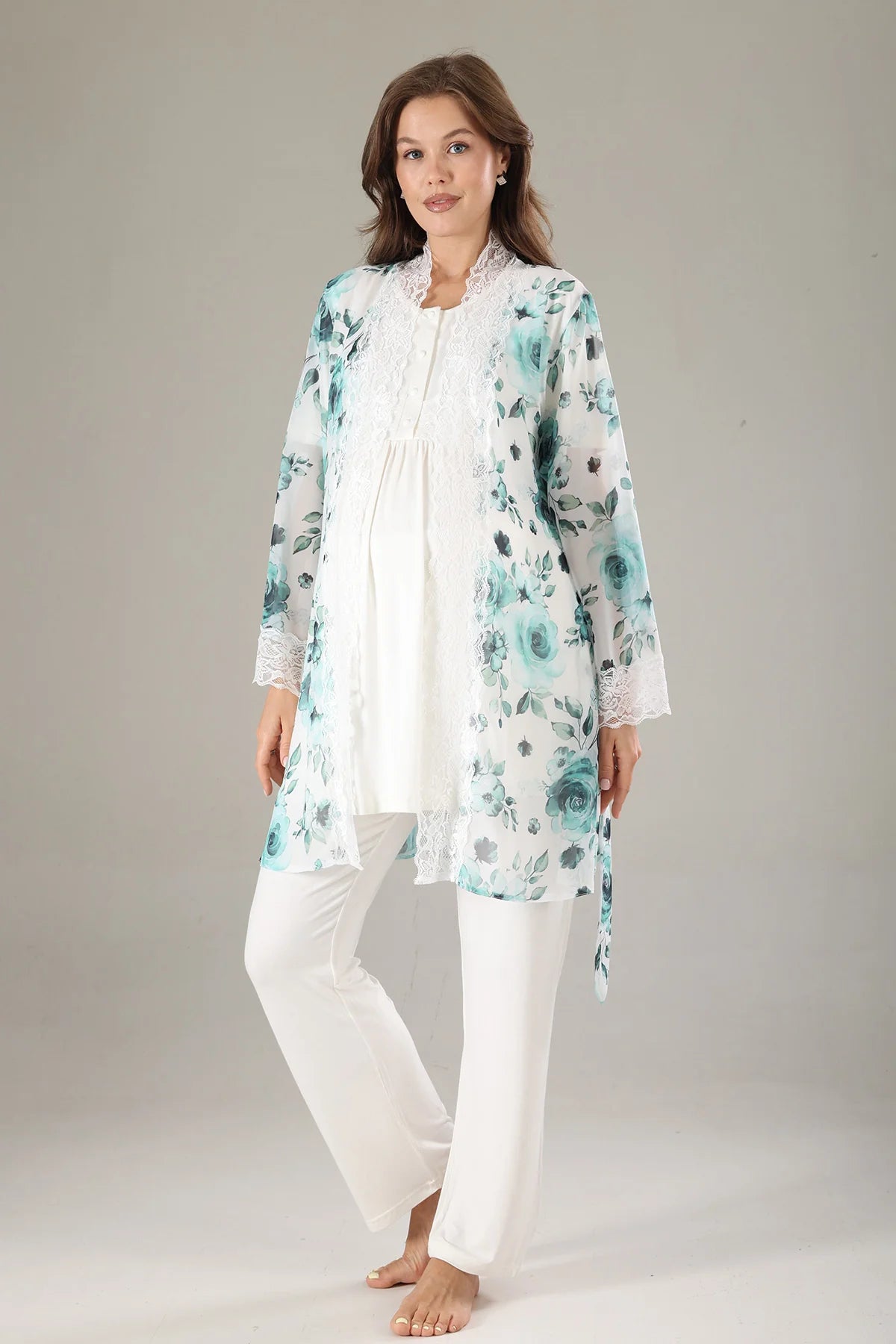 Dantel Yaka Şifon Sabahlıklı Lohusa Hamile Pijama Takımı Mavi - 811