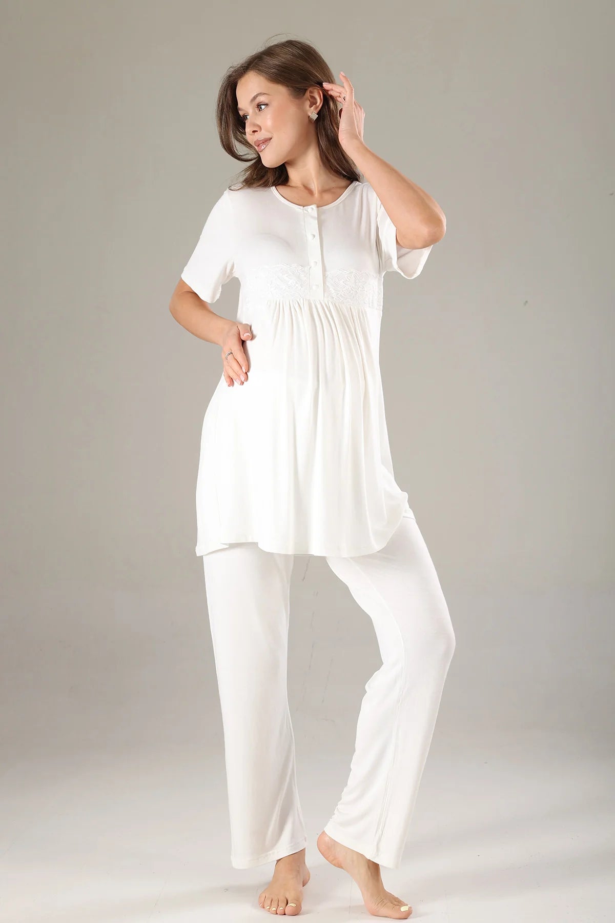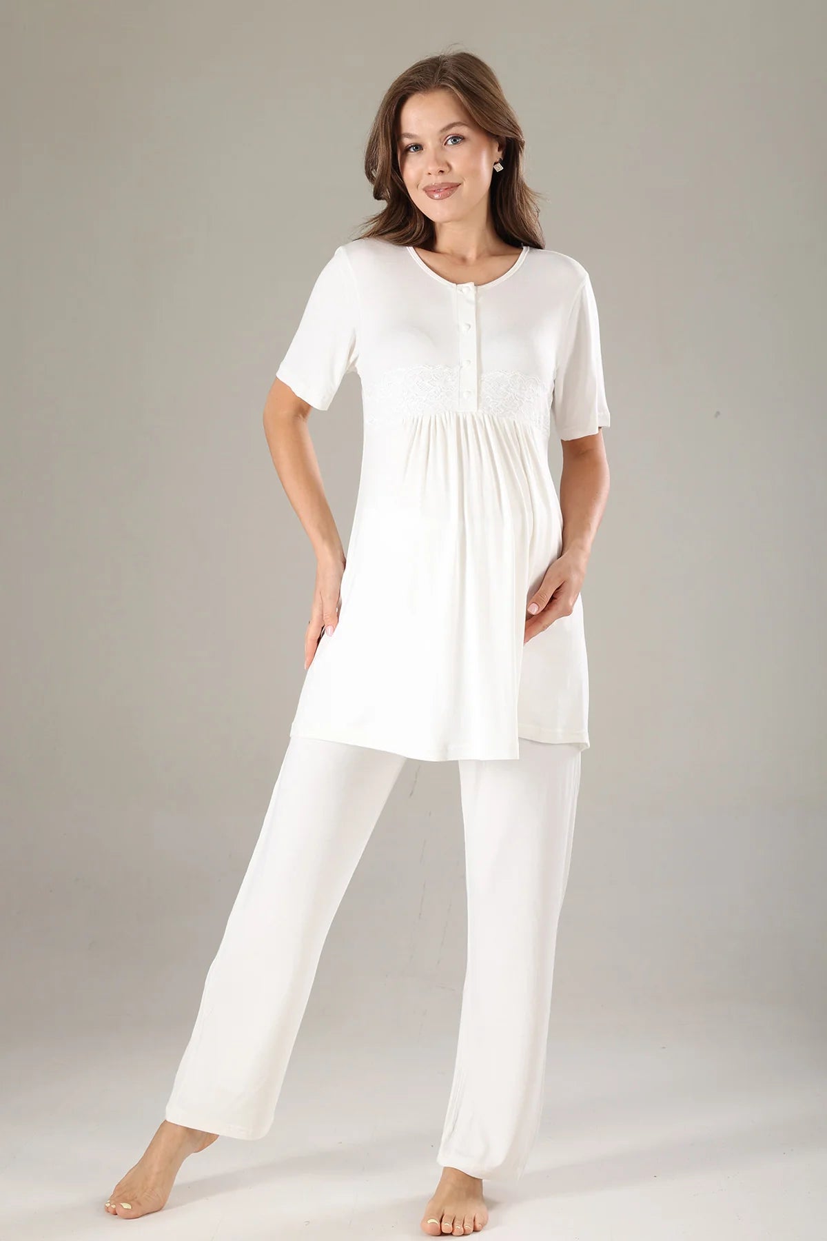 Lohusa pijama takımı, doğum sonrası ihtiyaçlar düşünülerek tasarlandı. Emzirmeye uygun önden düğmeli üst kısmı, kullanım kolaylığı sağlar.Yumuşak ve nefes alabilen kumaşı ile hassas cildinize gün boyu konfor sunar. Sabahlığın kuşaklı ve düğmeli tasarımı sayesinde hem evde hem hastanede rahatça kullanılabilir. Alt pijama kısmı ise esnek bel yapısıyla doğum sonrası beden değişimine kolayca uyum sağlar.