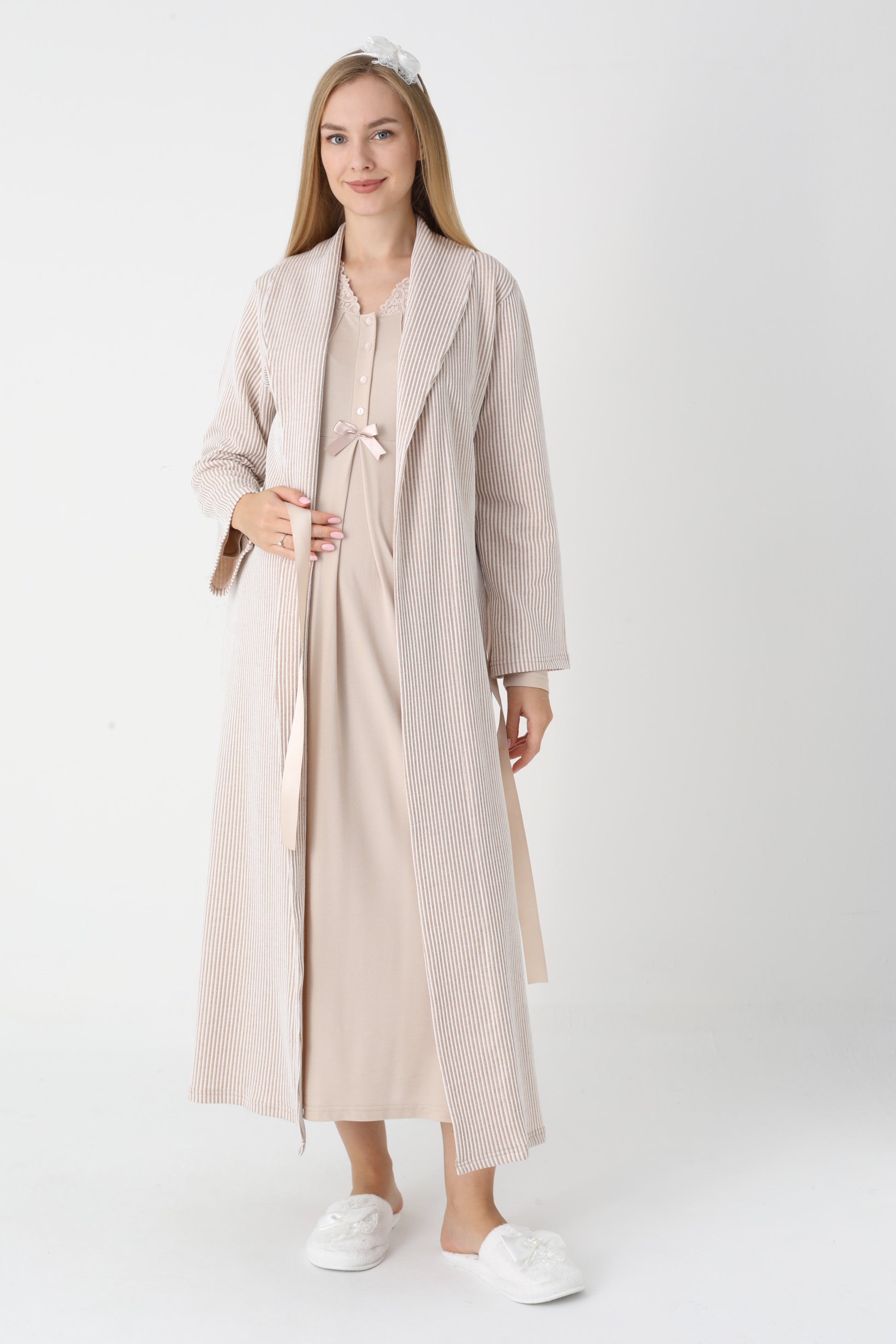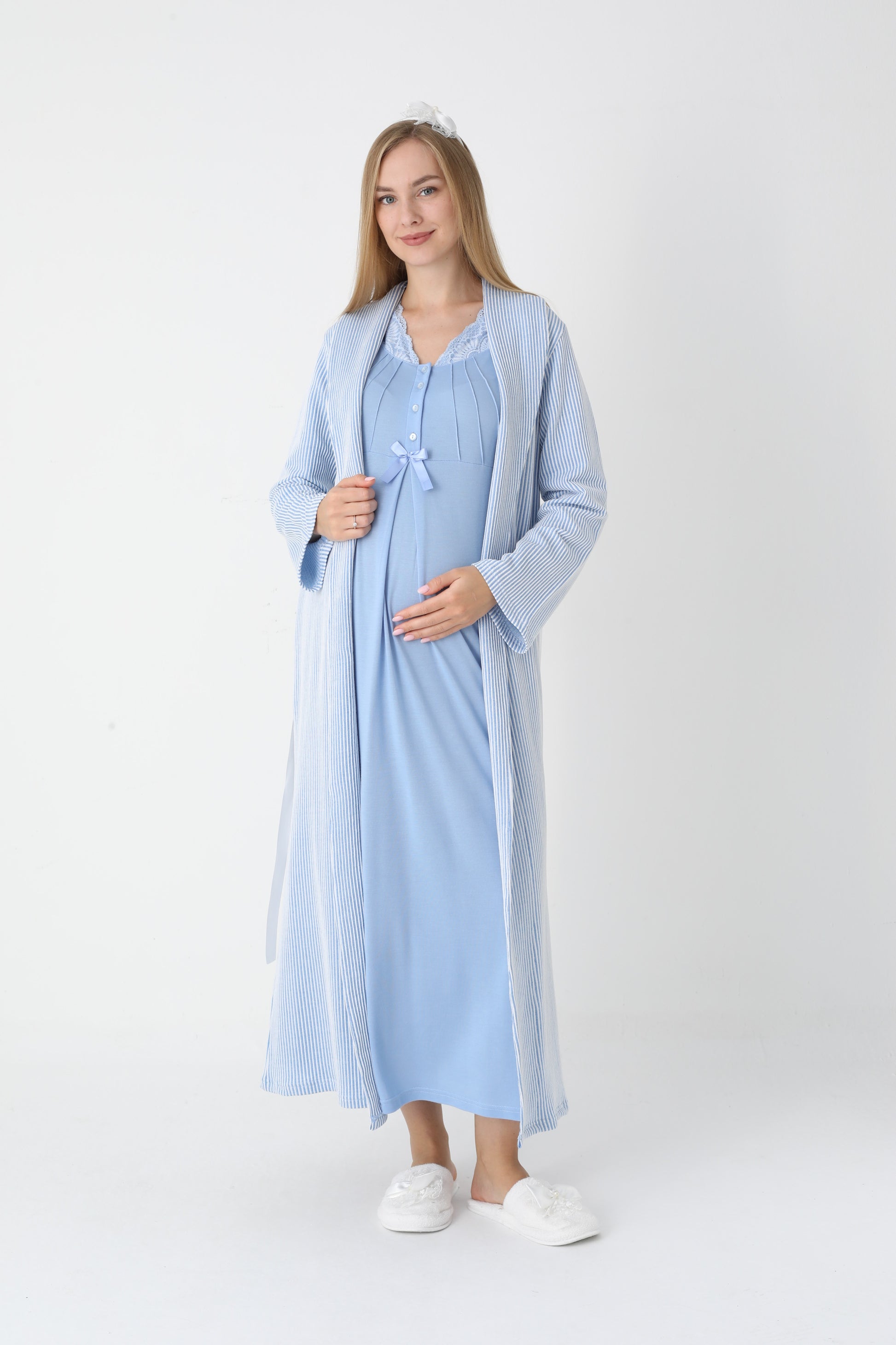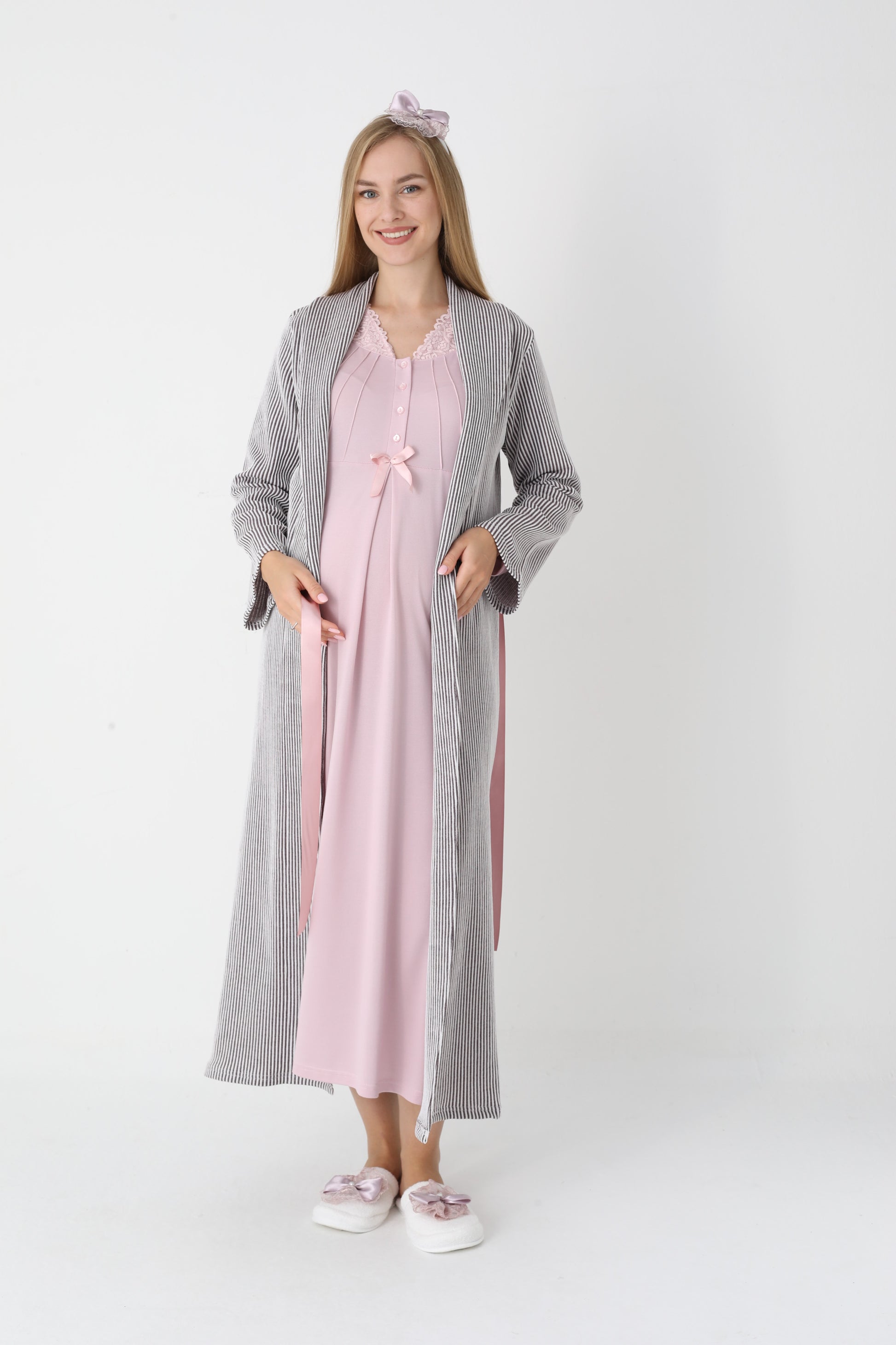 Dantel Yakalı Çizgili Sabahlıklı Lohusa Gecelik Takımı - 2305