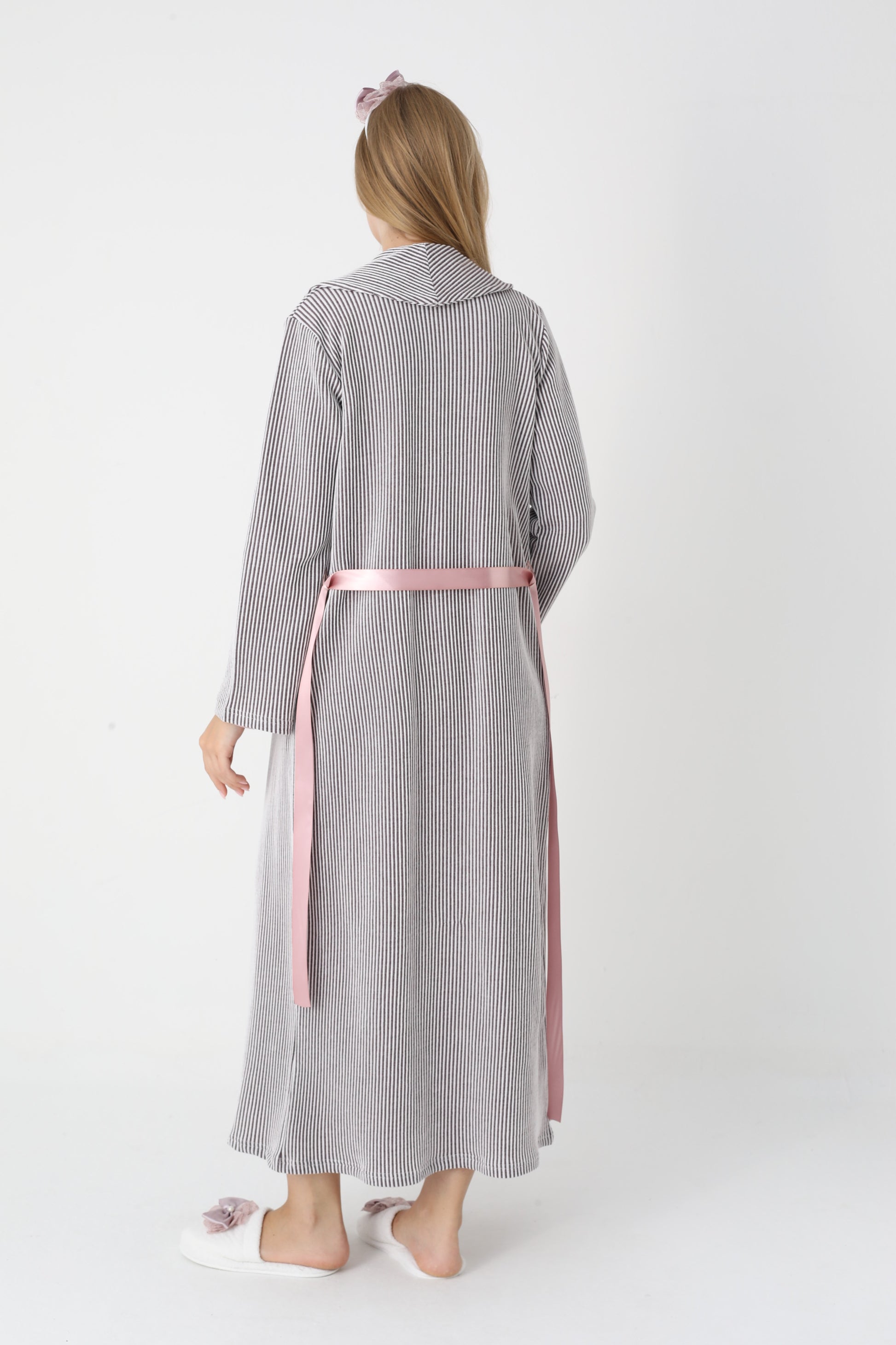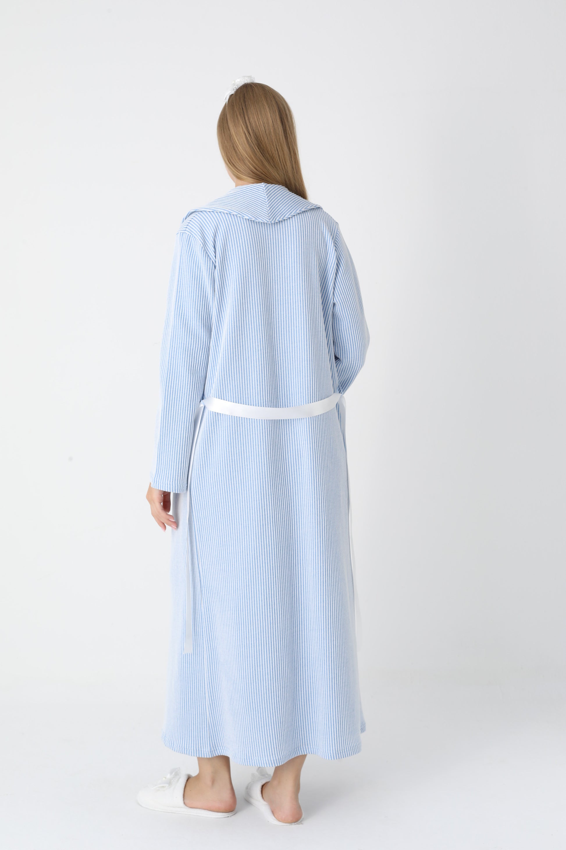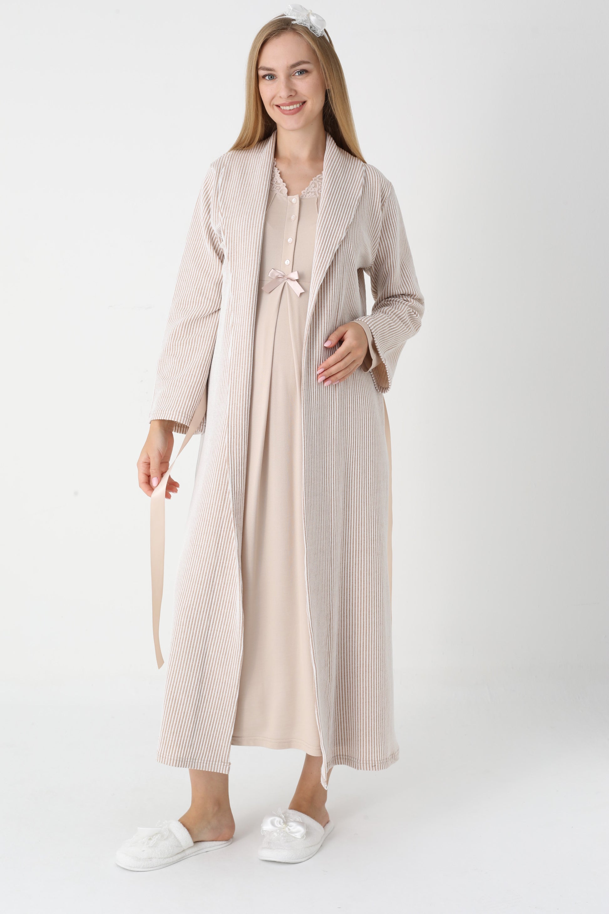 Dantel Yakalı Çizgili Sabahlıklı Lohusa Gecelik Takımı - 2305