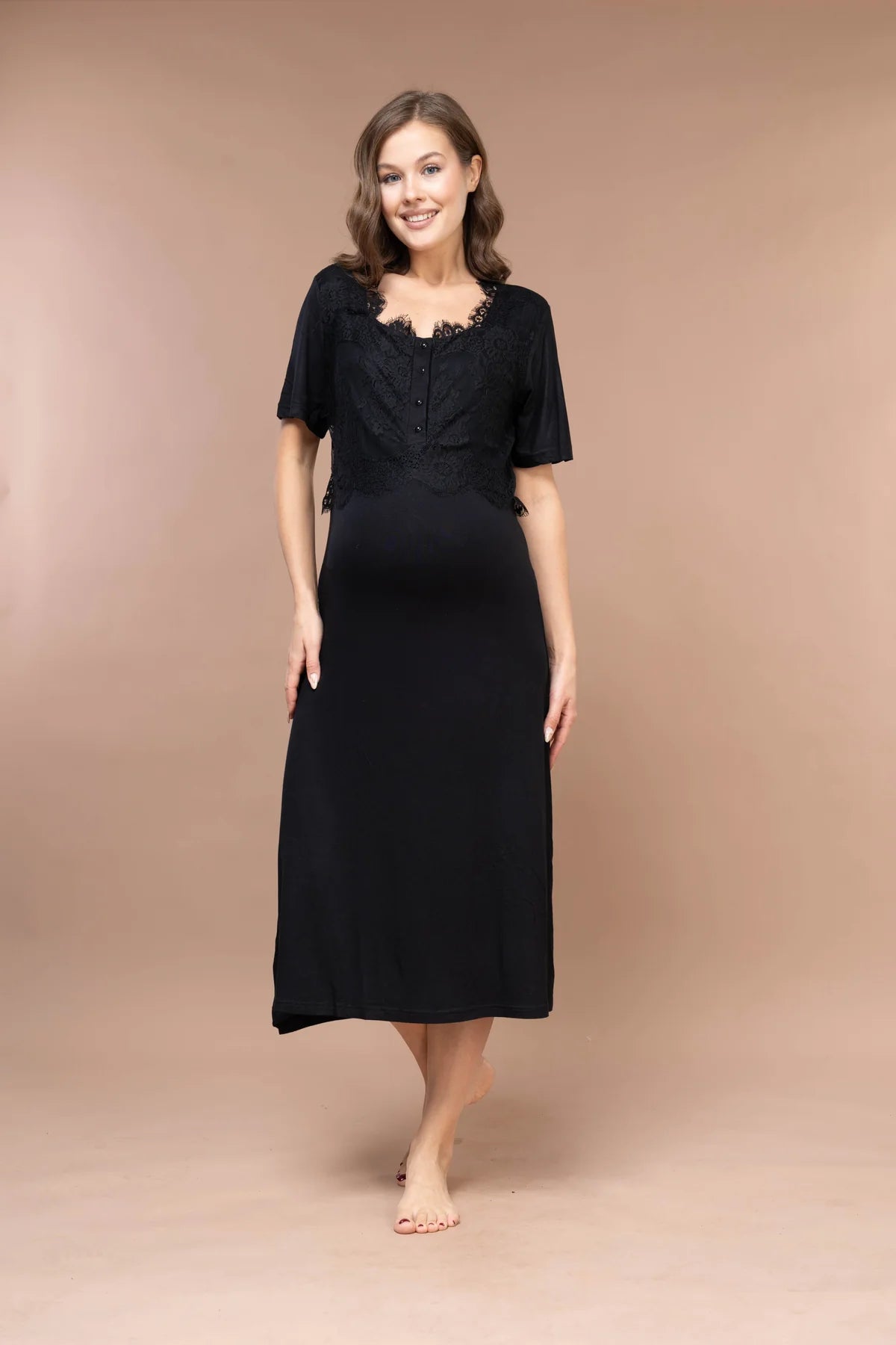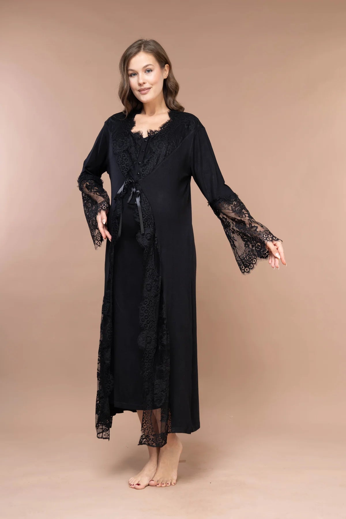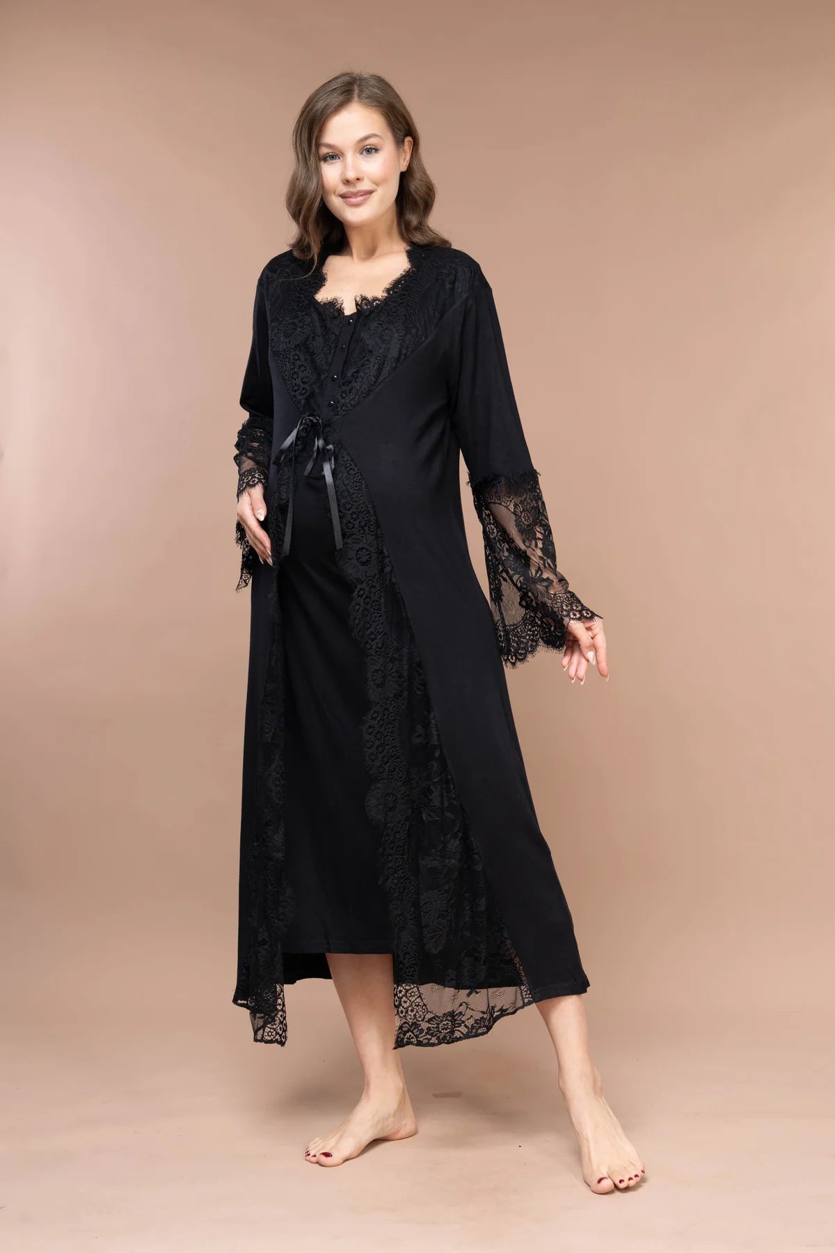 Dantelli Kol Sabahlıklı Dantelli Lohusa Hamile Gecelik Takımı Siyah - 2395