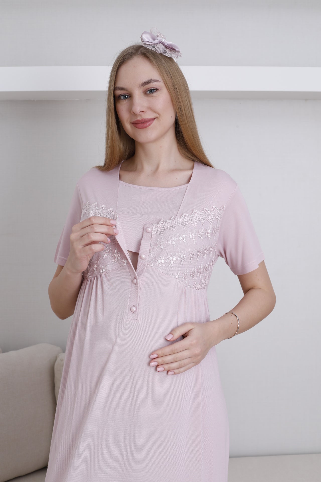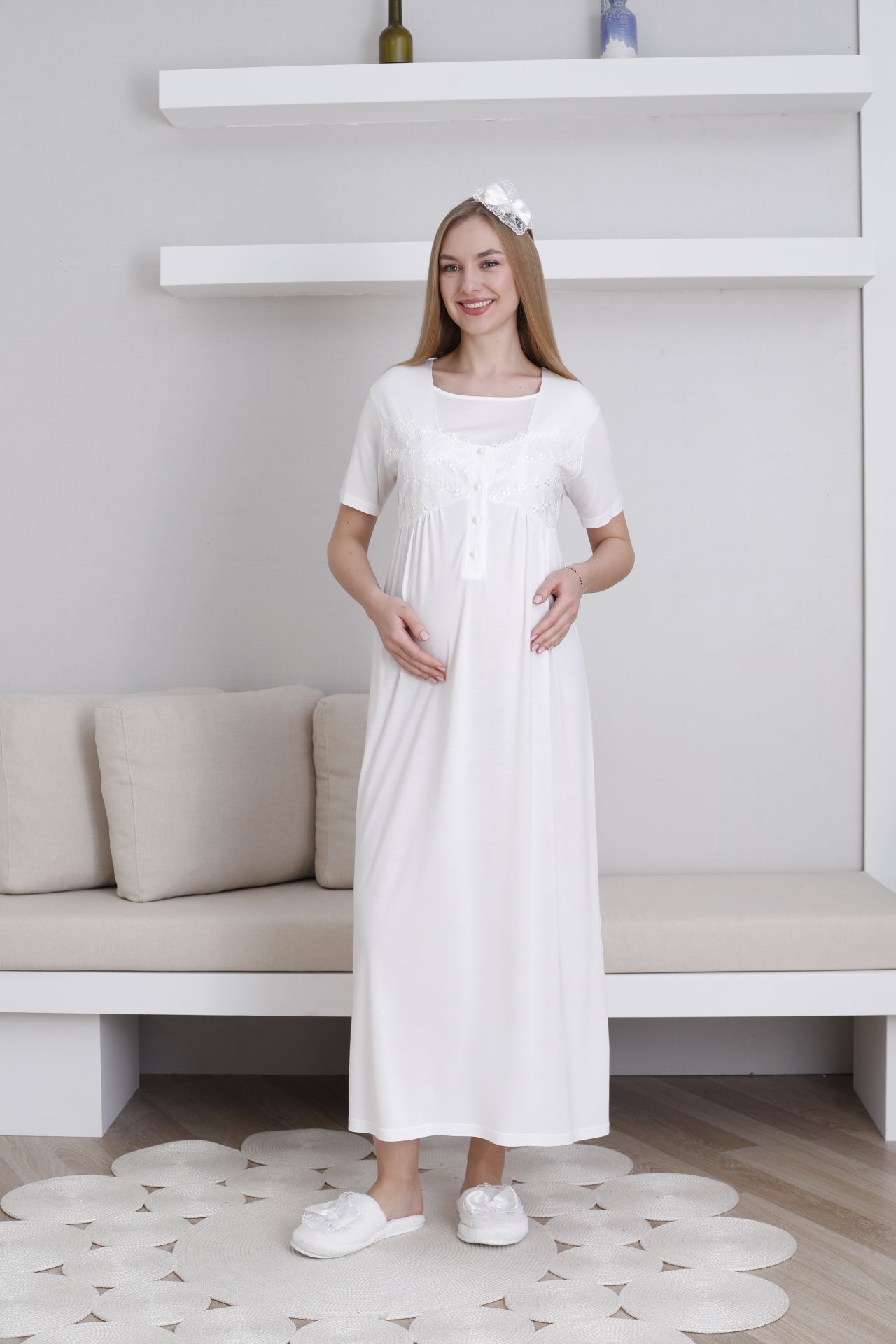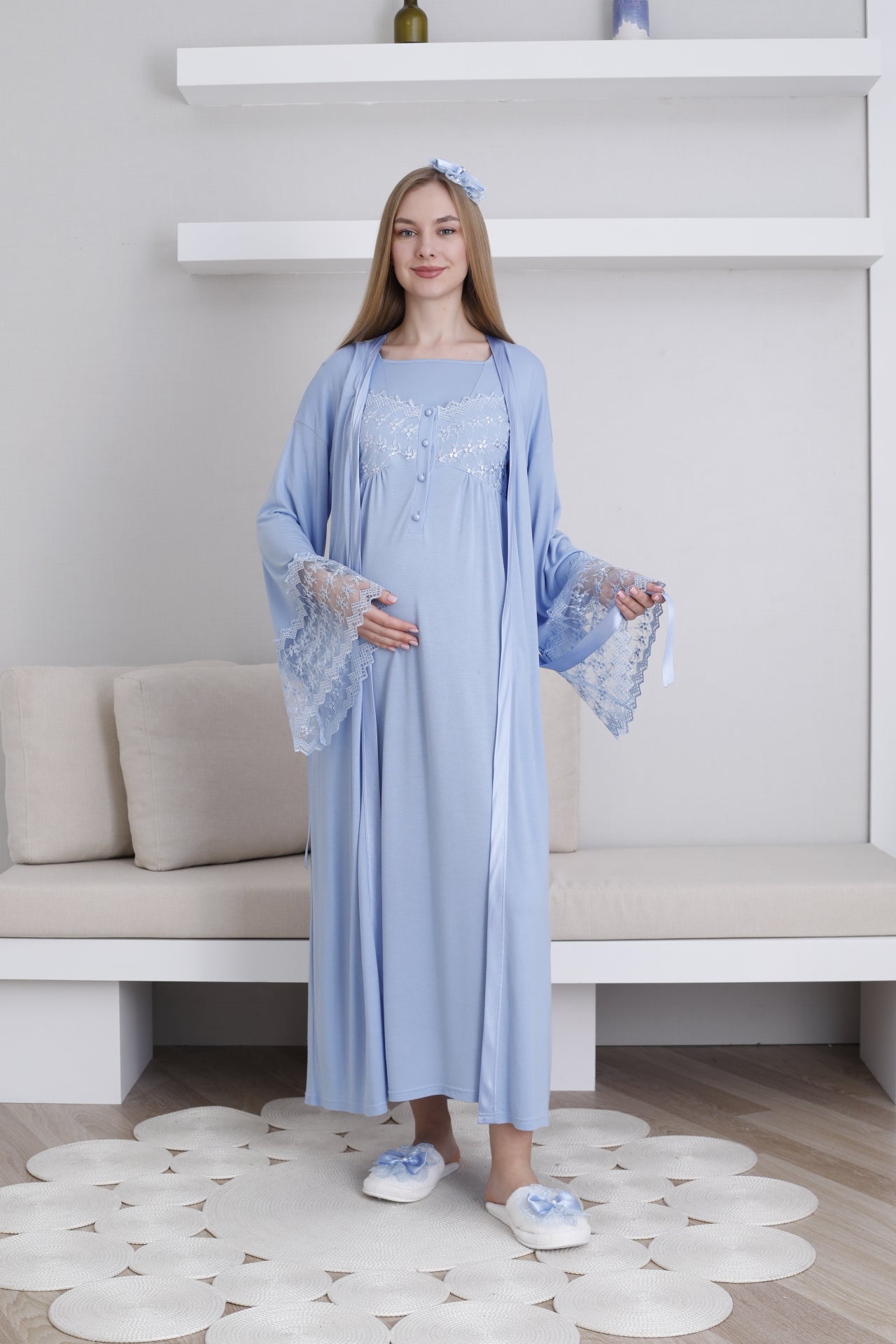Dantelli Kol Sabahlıklı Lohusa Gecelik Takımı - 2295