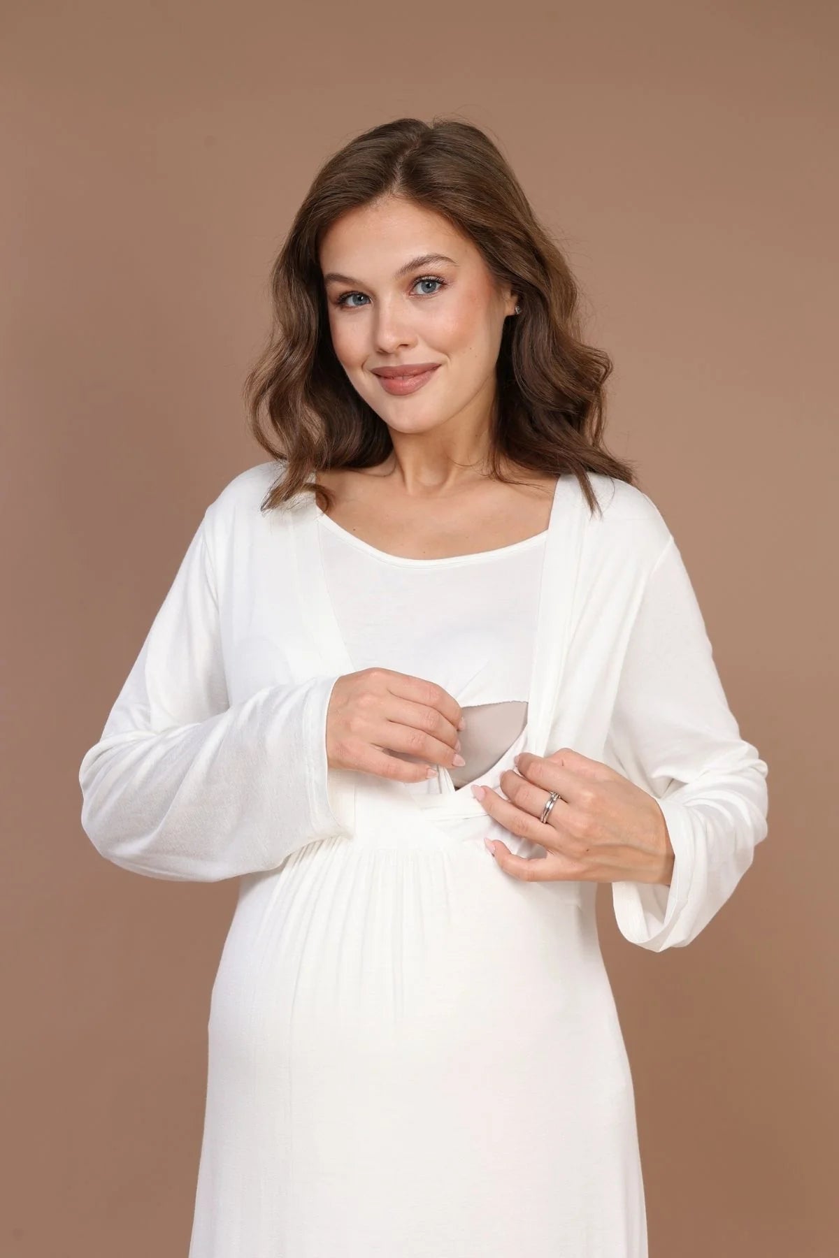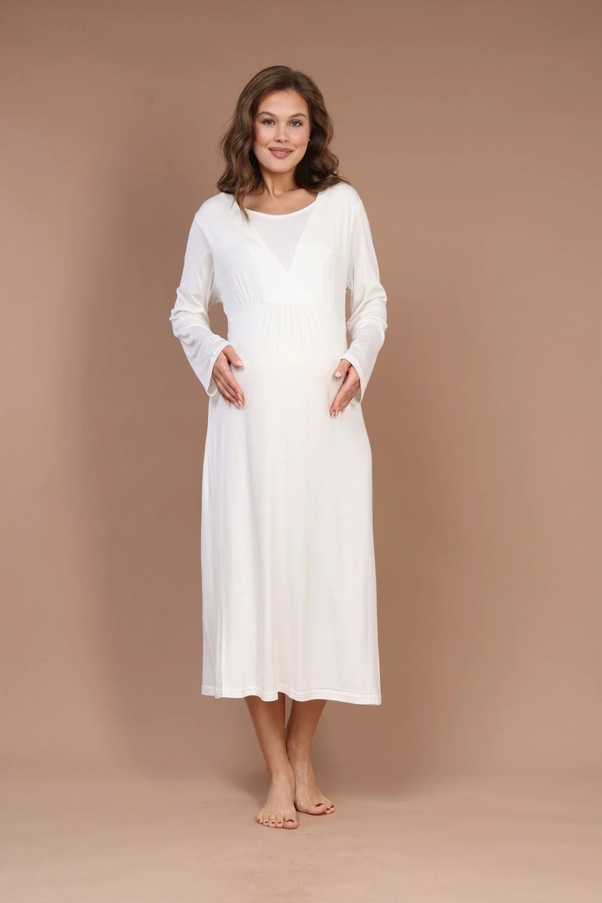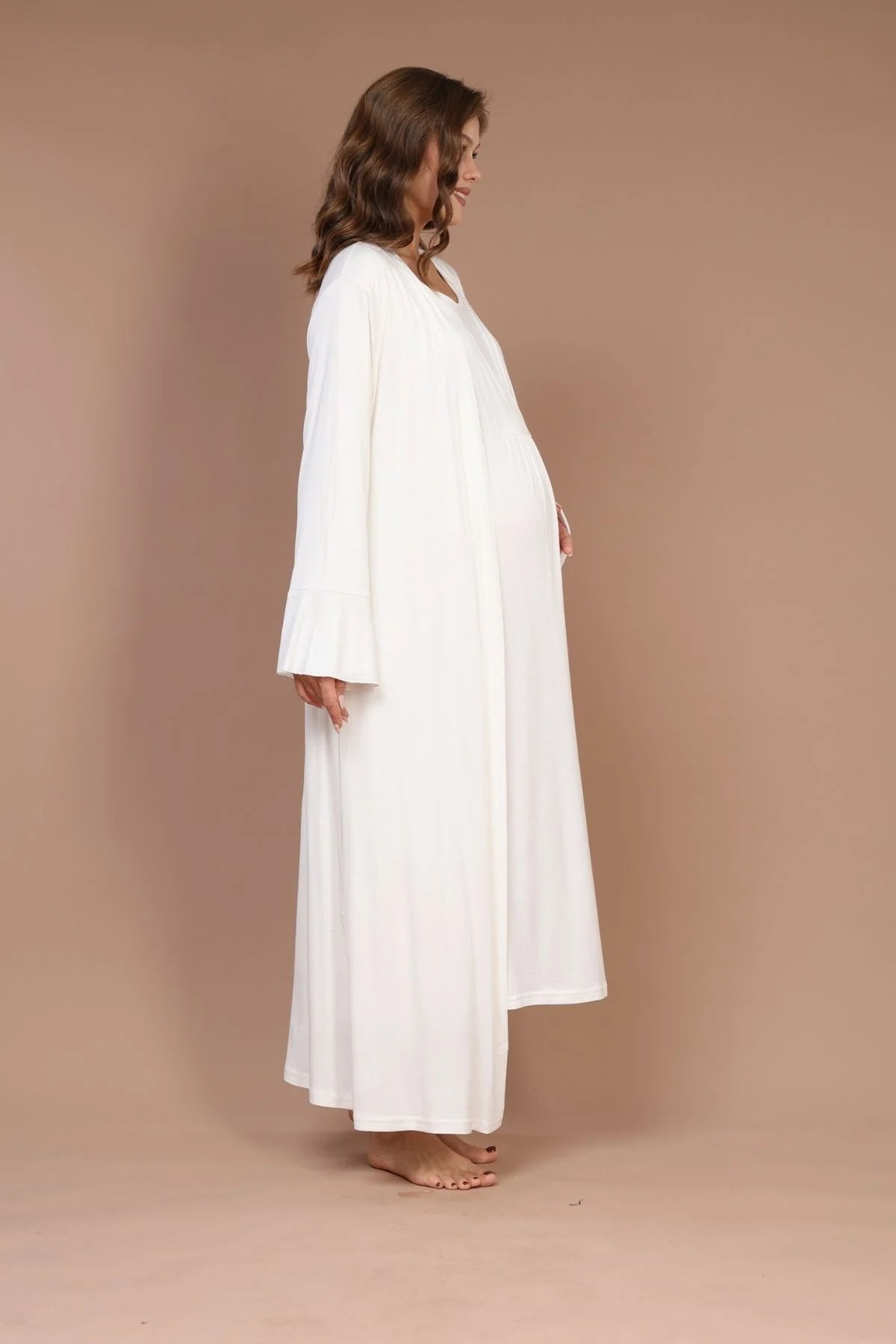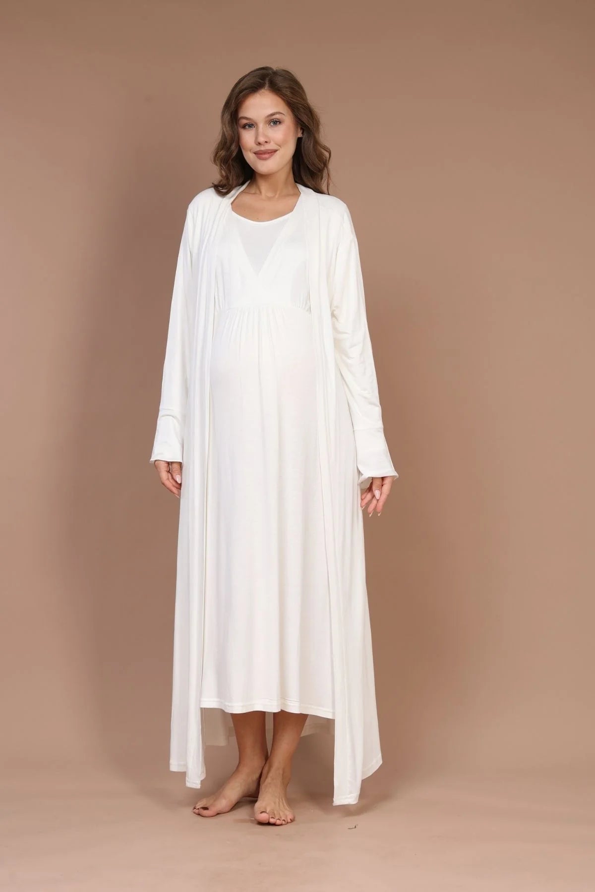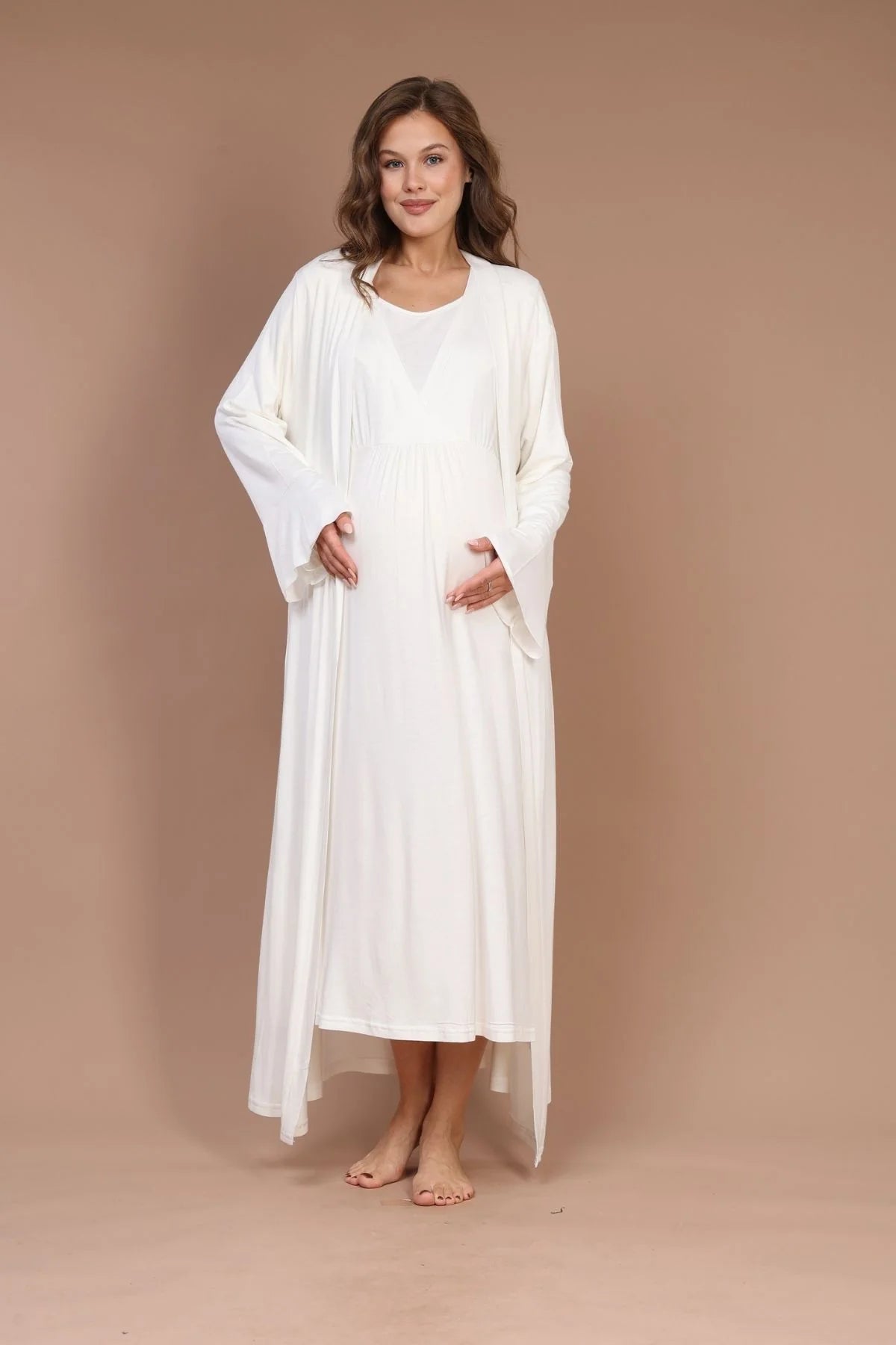 Emzirme Özellikli Sabahlıklı Lohusa Hamile Gecelik Takımı Ekru - 621