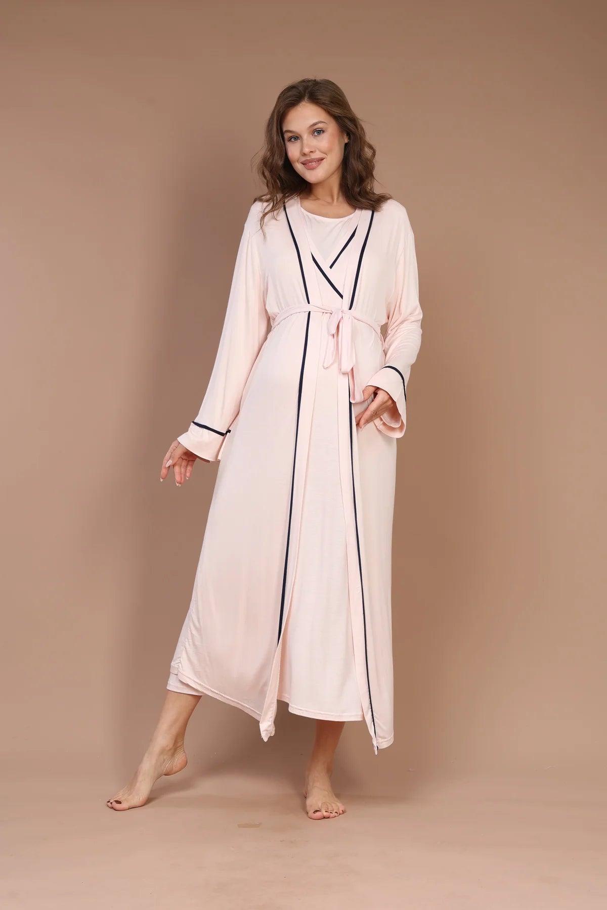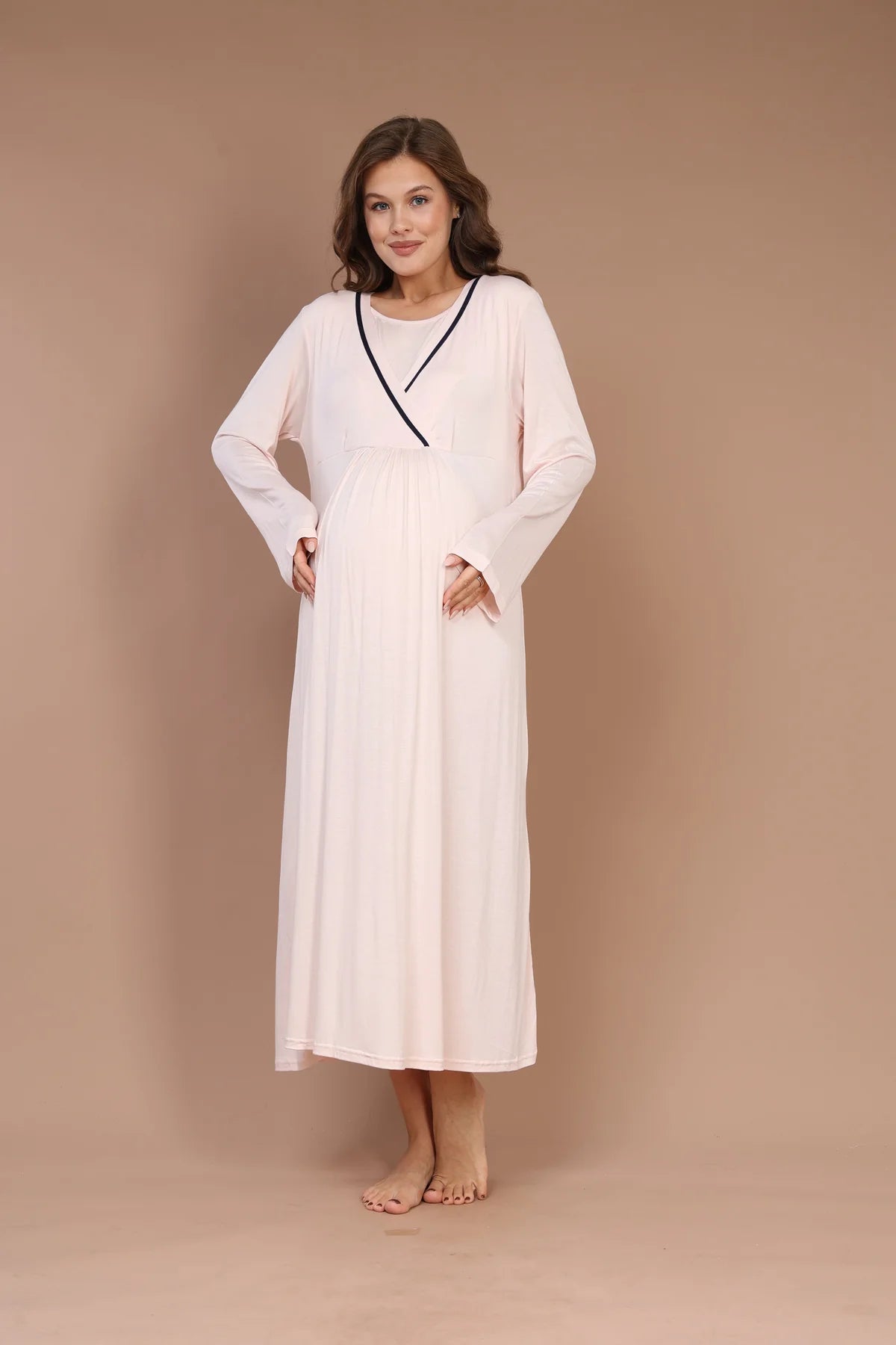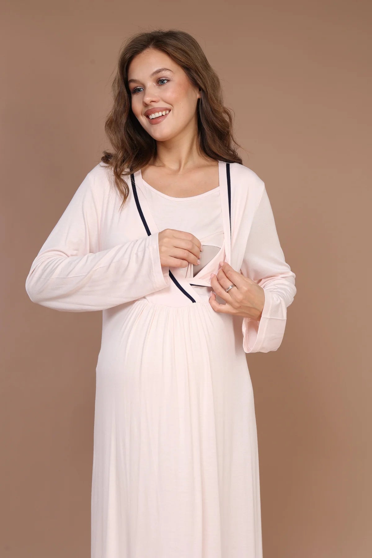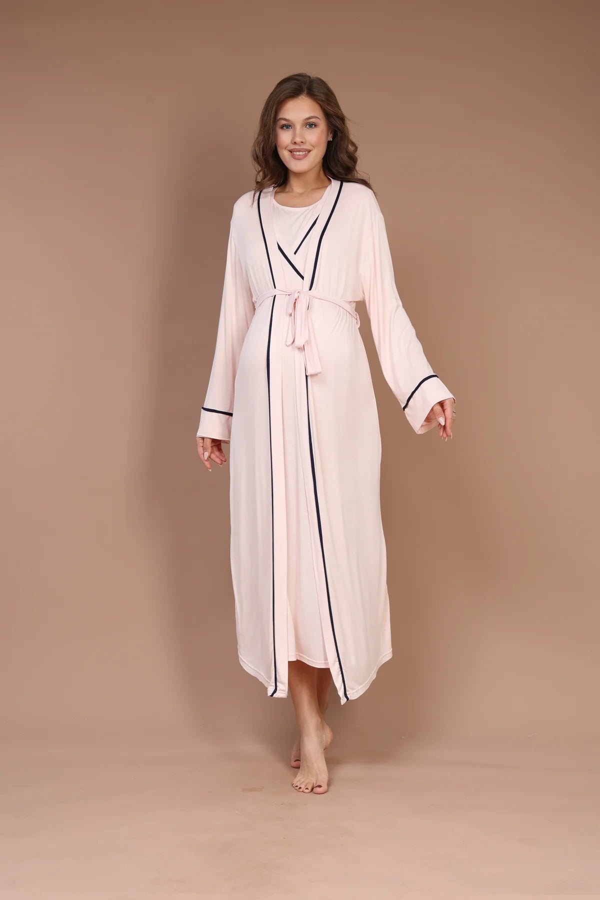 Doğum öncesi ve sonrası kullanım için ideal, konforlu ve şık sabahlıklı lohusa gecelik takımı. Emzirme kolaylığı sunan pratik yapısı ve yumuşak dokusuyla hem hastane çıkışı hem evde kullanım için uygundur.