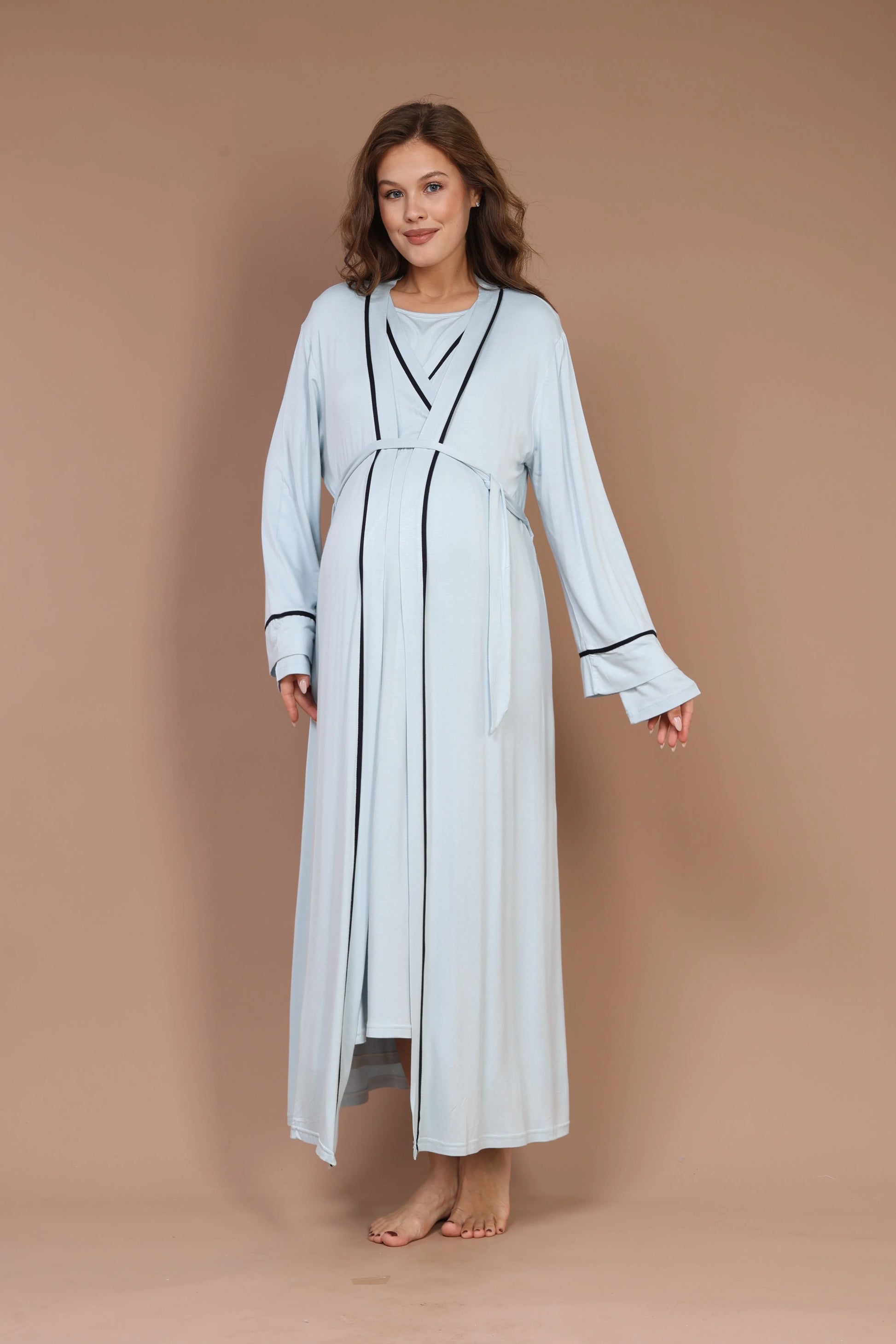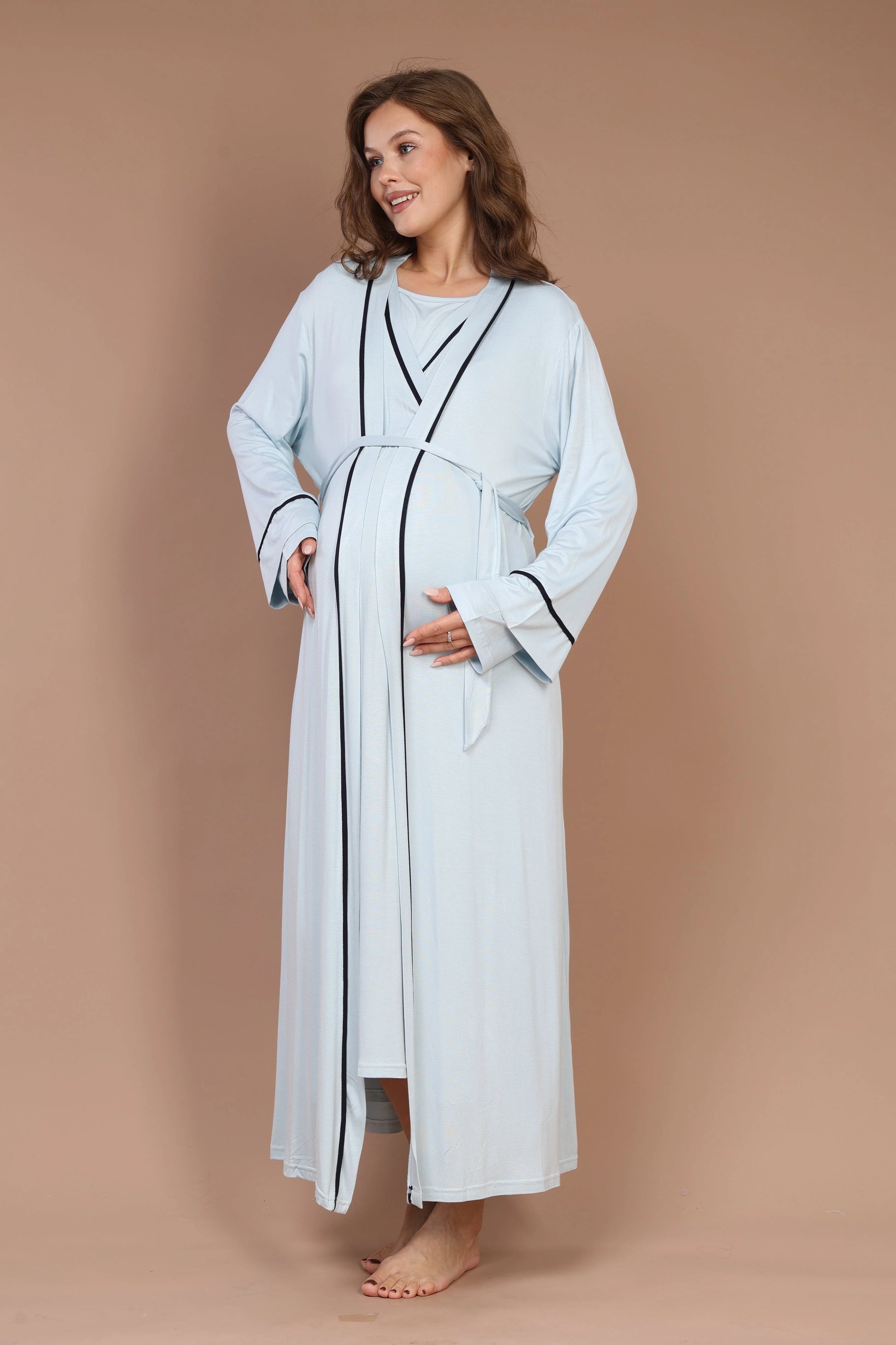 Doğum öncesi ve sonrası kullanım için ideal, konforlu ve şık sabahlıklı lohusa gecelik takımı. Emzirme kolaylığı sunan pratik yapısı ve yumuşak dokusuyla hem hastane çıkışı hem evde kullanım için uygundur.