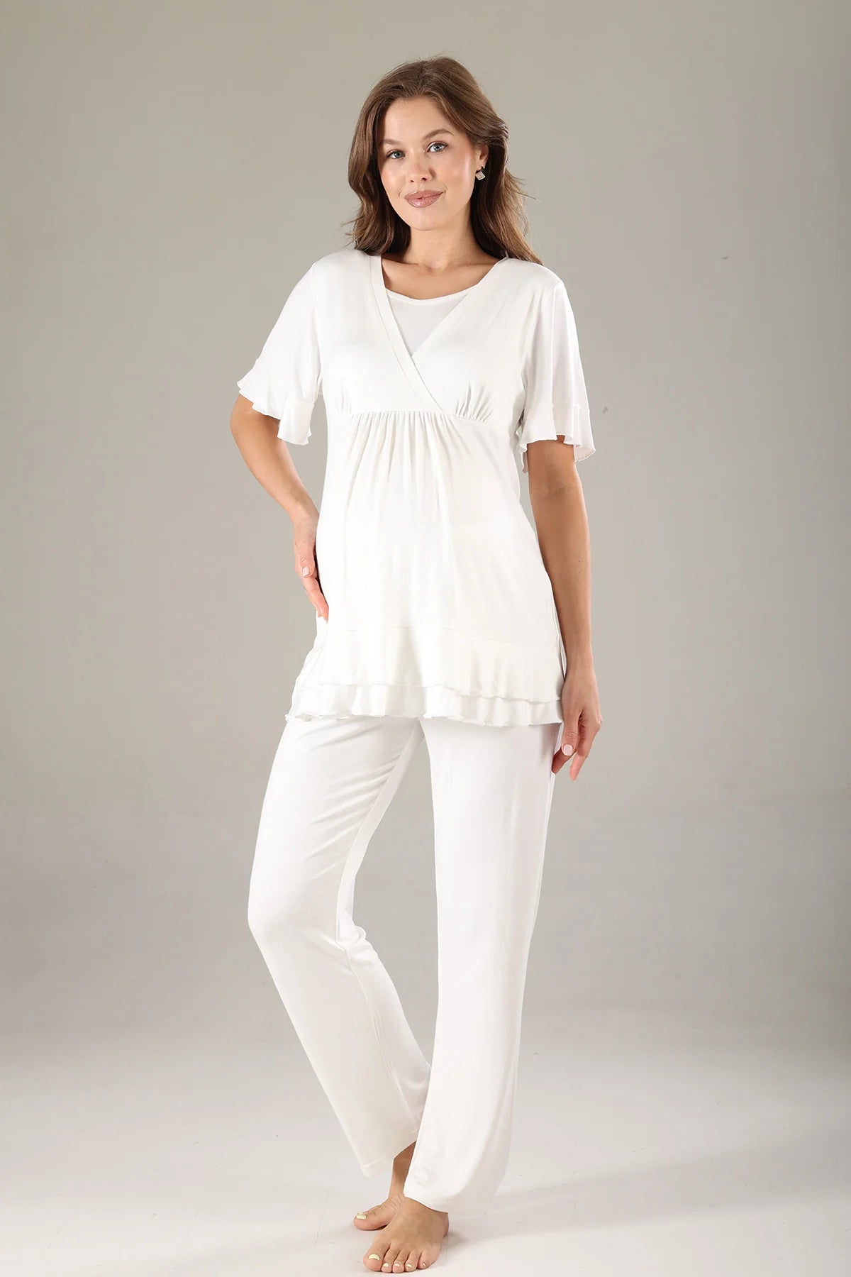 Lohusa pijama takımı, doğum sonrası ihtiyaçlar düşünülerek tasarlandı. Emzirmeye uygun önden düğmeli üst kısmı, kullanım kolaylığı sağlar.Yumuşak ve nefes alabilen kumaşı ile hassas cildinize gün boyu konfor sunar. Sabahlığın kuşaklı ve düğmeli tasarımı sayesinde hem evde hem hastanede rahatça kullanılabilir. Alt pijama kısmı ise esnek bel yapısıyla doğum sonrası beden değişimine kolayca uyum sağlar.
