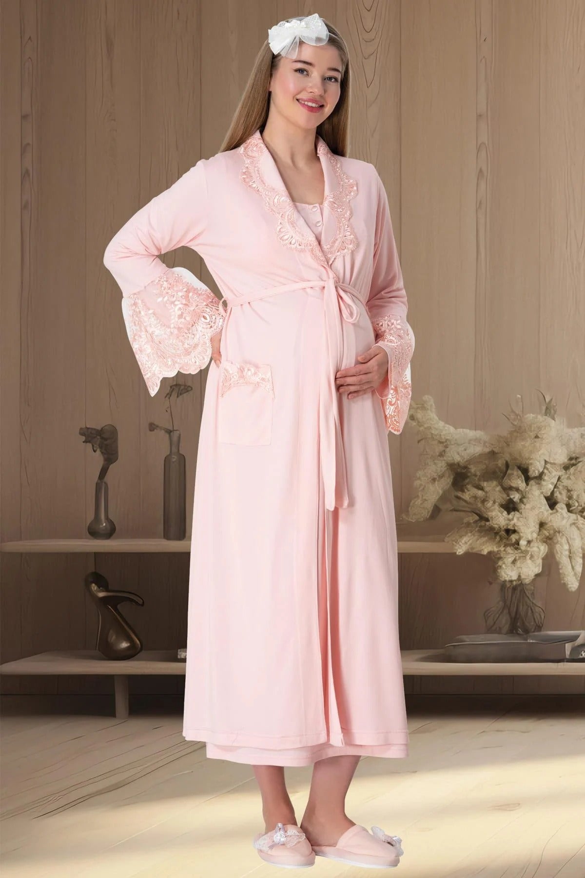 Dantelli Önden Düğmeli Lohusa Hamile Sabahlıklı Gecelik Takım – Pudra ile kendinizi her an özel hissedin.