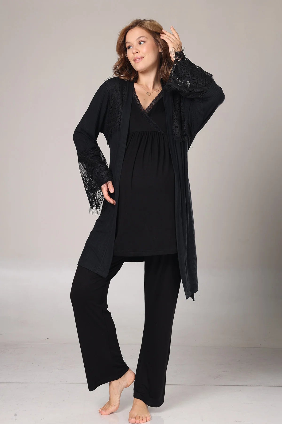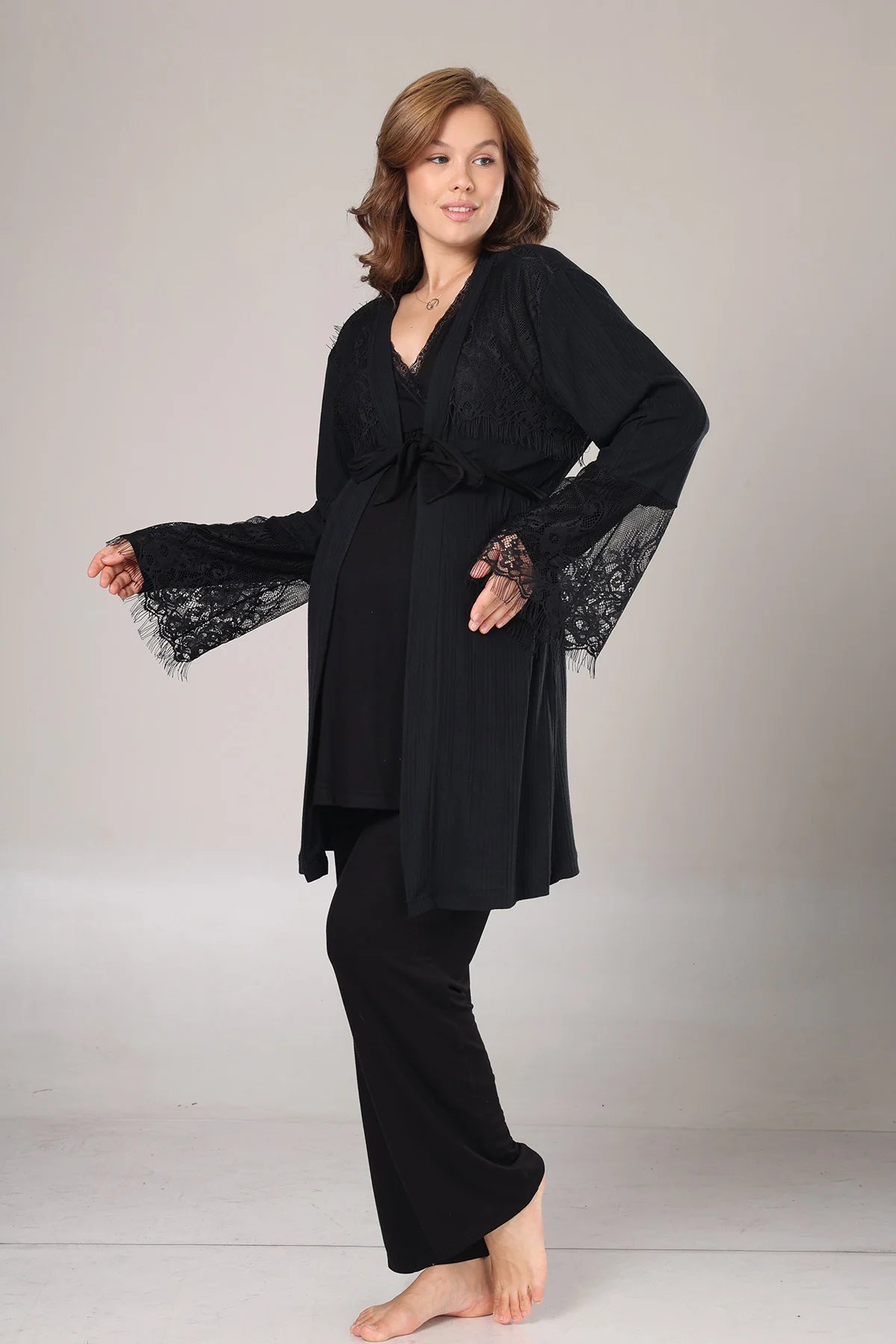 Kışlık Fitilli Dantel Detaylı Sabahlıklı Lohusa Hamile Pijama Takımı Siyah -1022