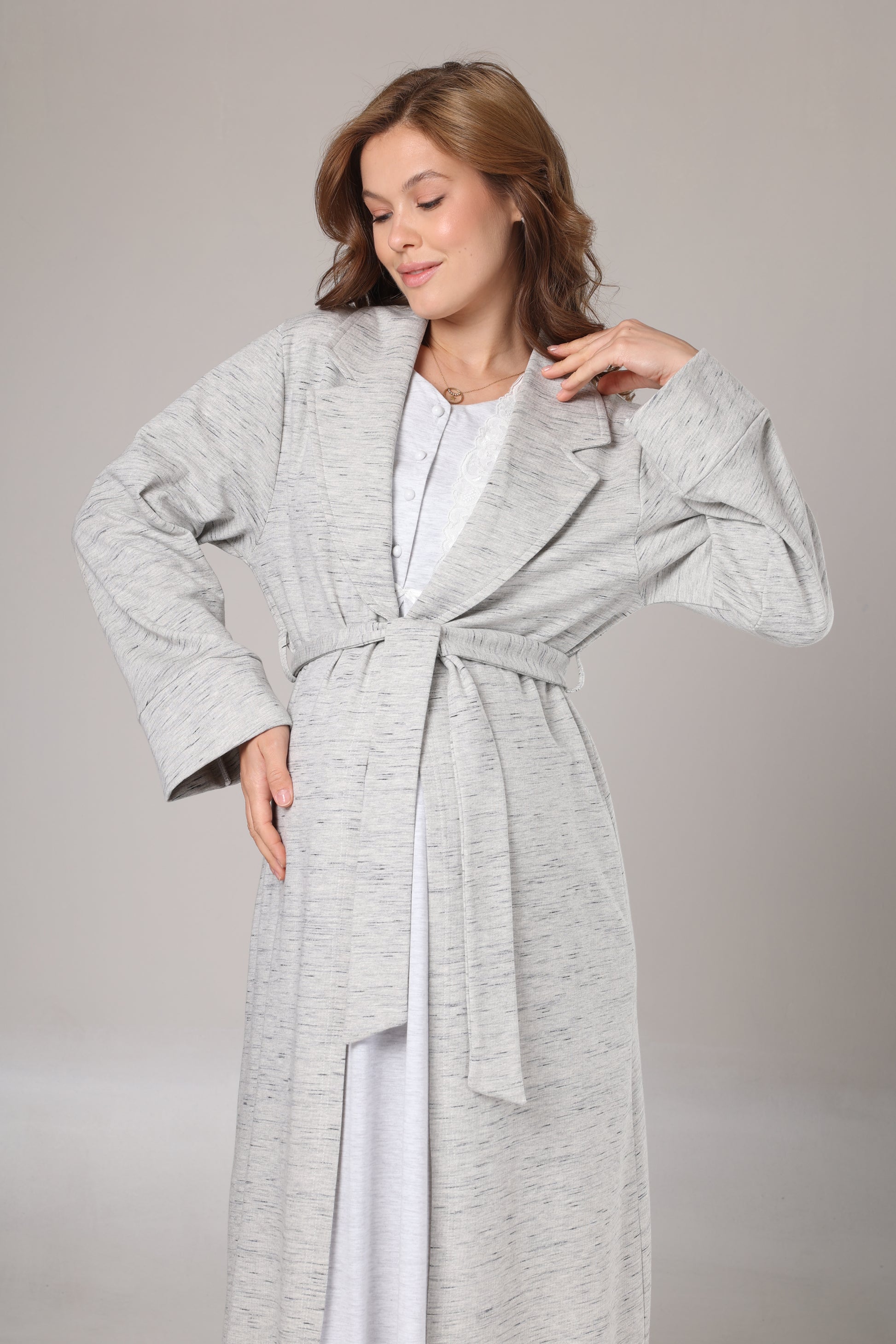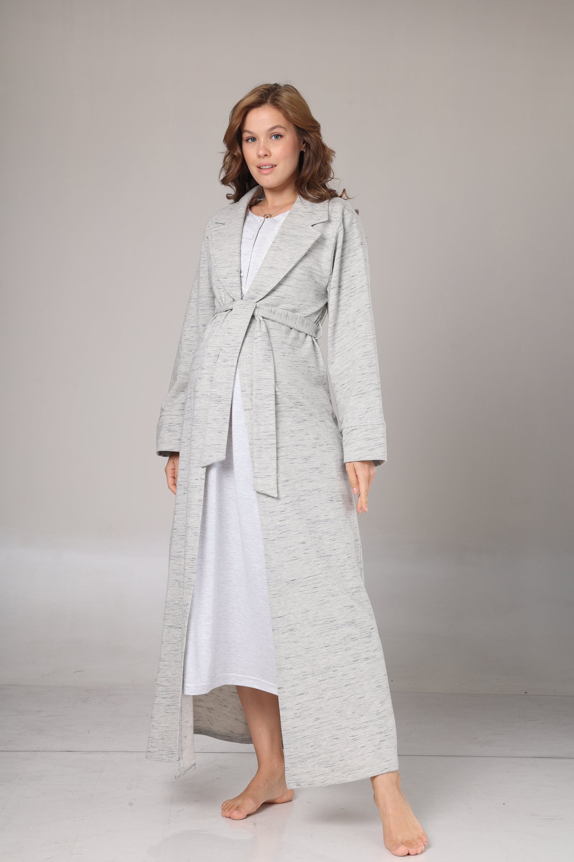 Kışlık Triko Sabahlıklı Emzirme Bölmeli Gecelik Takımı Gri - 1021
