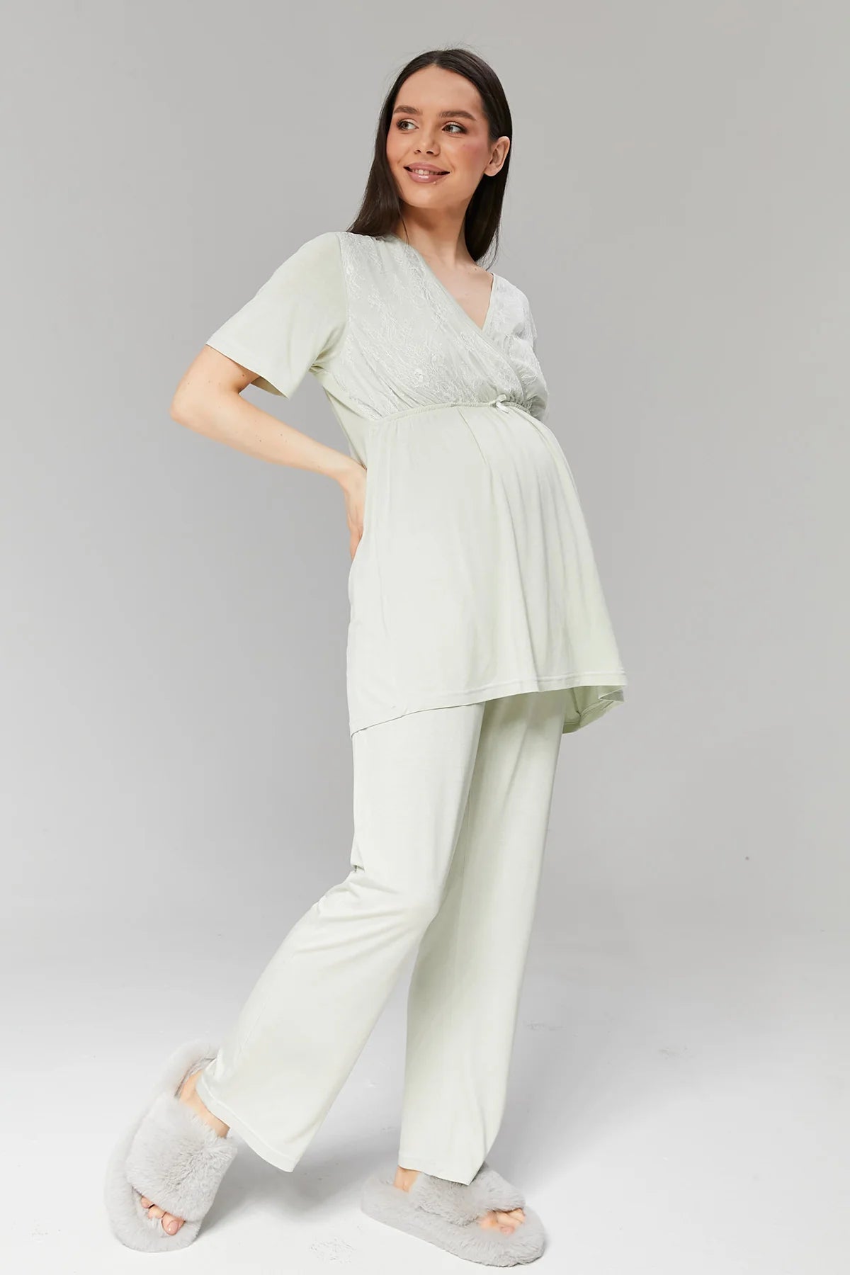 Kruvaze Fakir Kol Sabahlıklı Lohusa Hamile Pijama Takımı Mint - 502