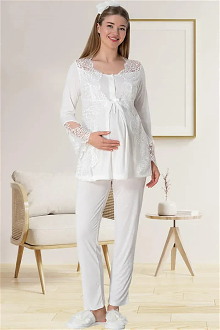 Önden Düğmeli Dantel Detaylı Lohusa Hamile Pijama Takımı – Ekru