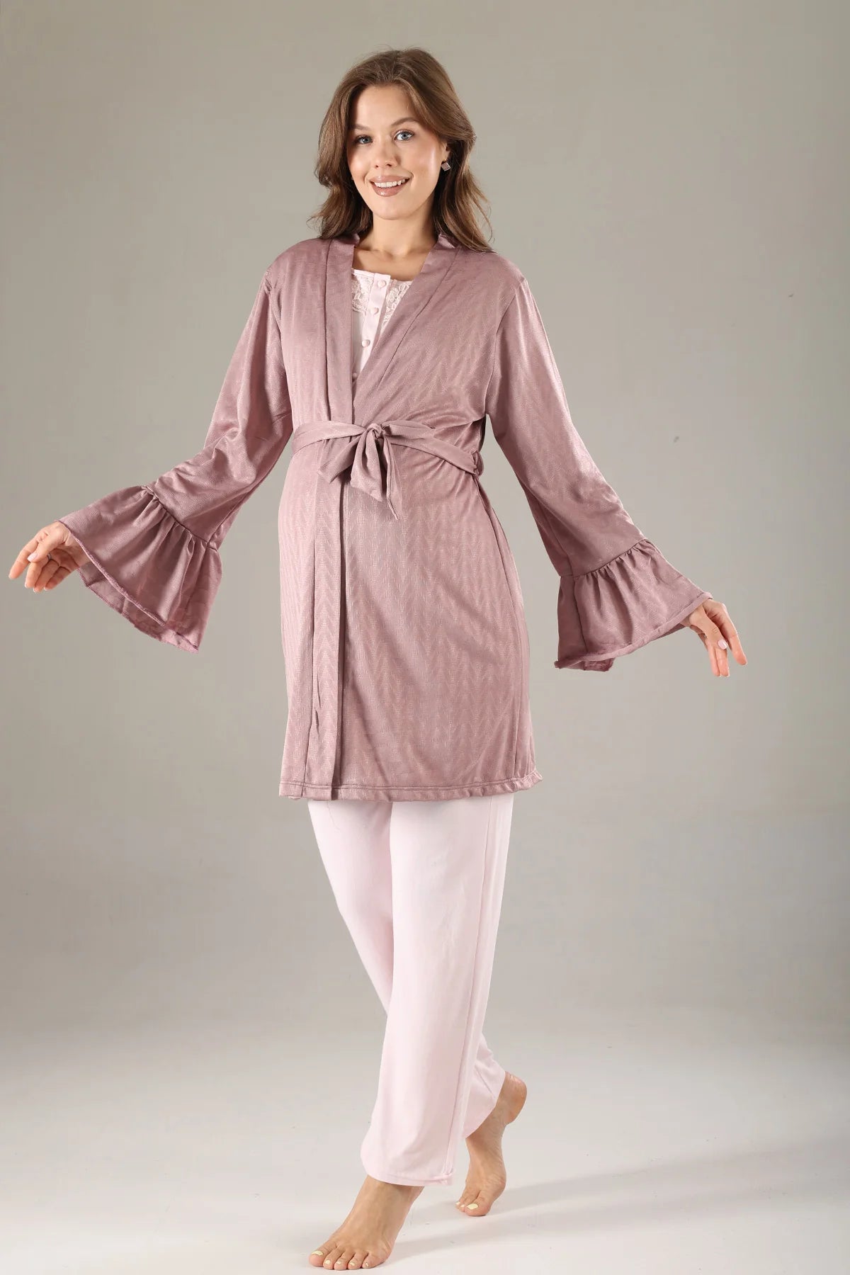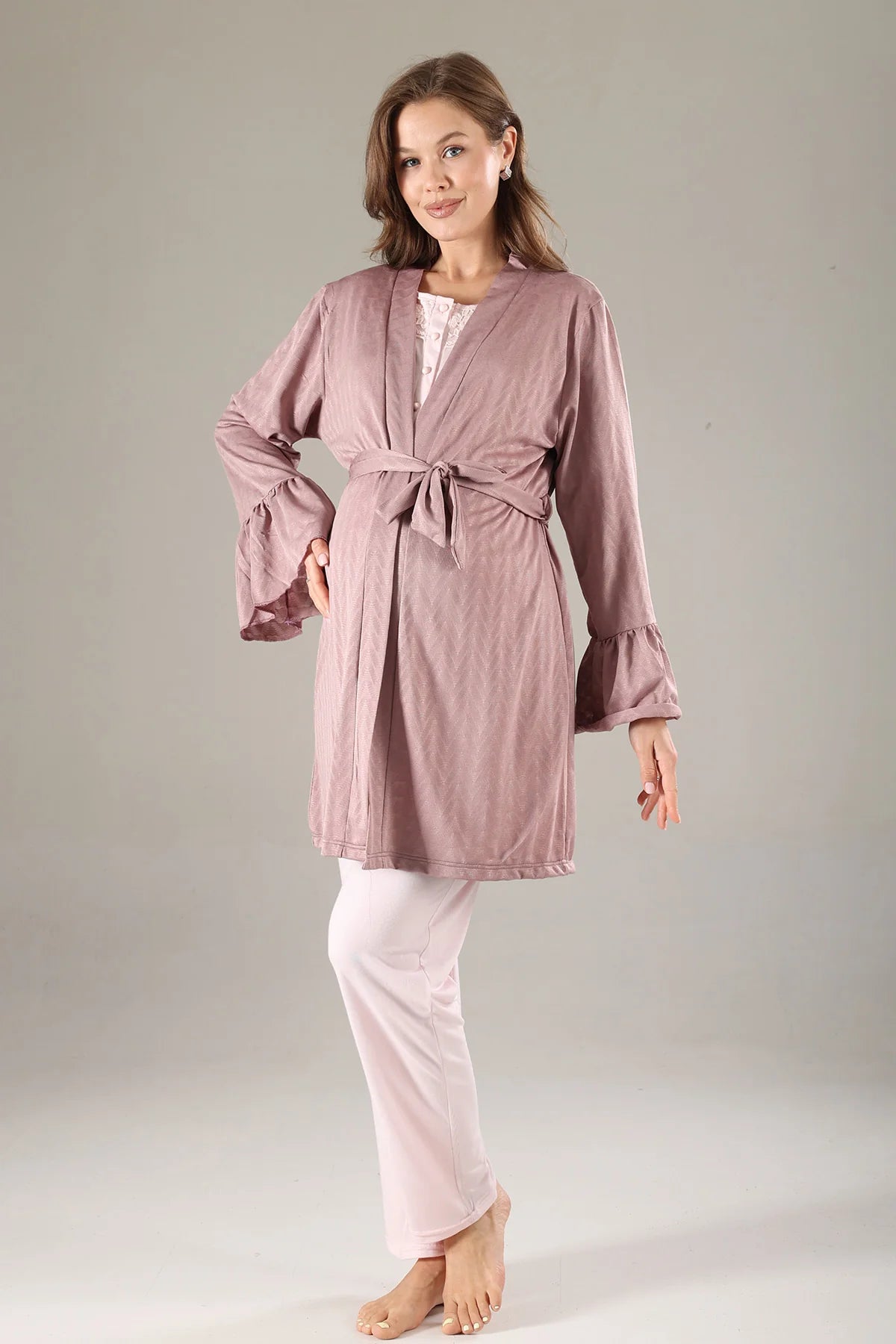 Önden Düğmeli Dantel Yaka Sabahlıklı Lohusa Hamile Pijama Takımı Gülkurusu - 817