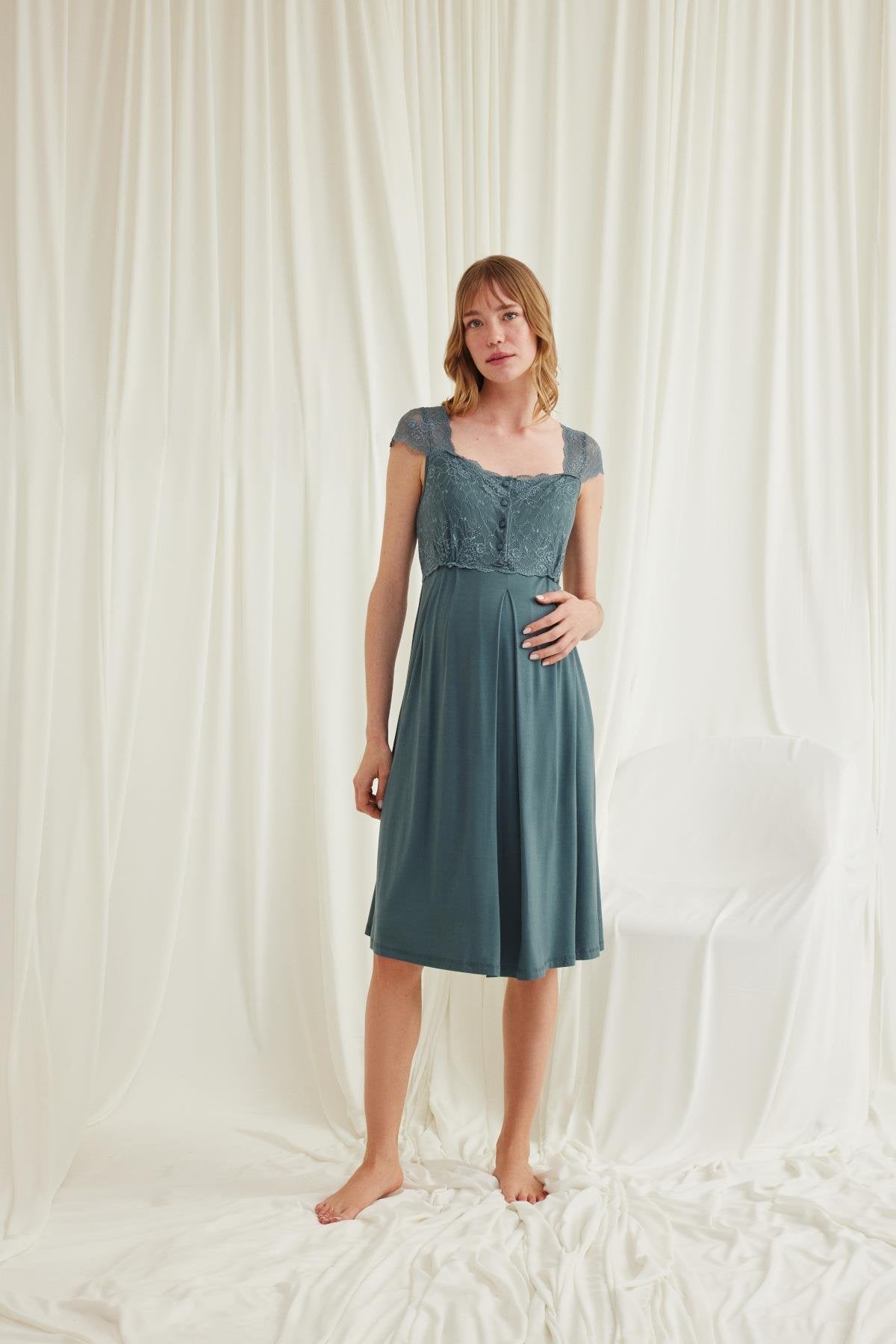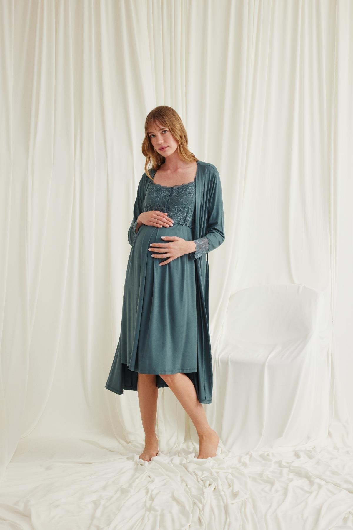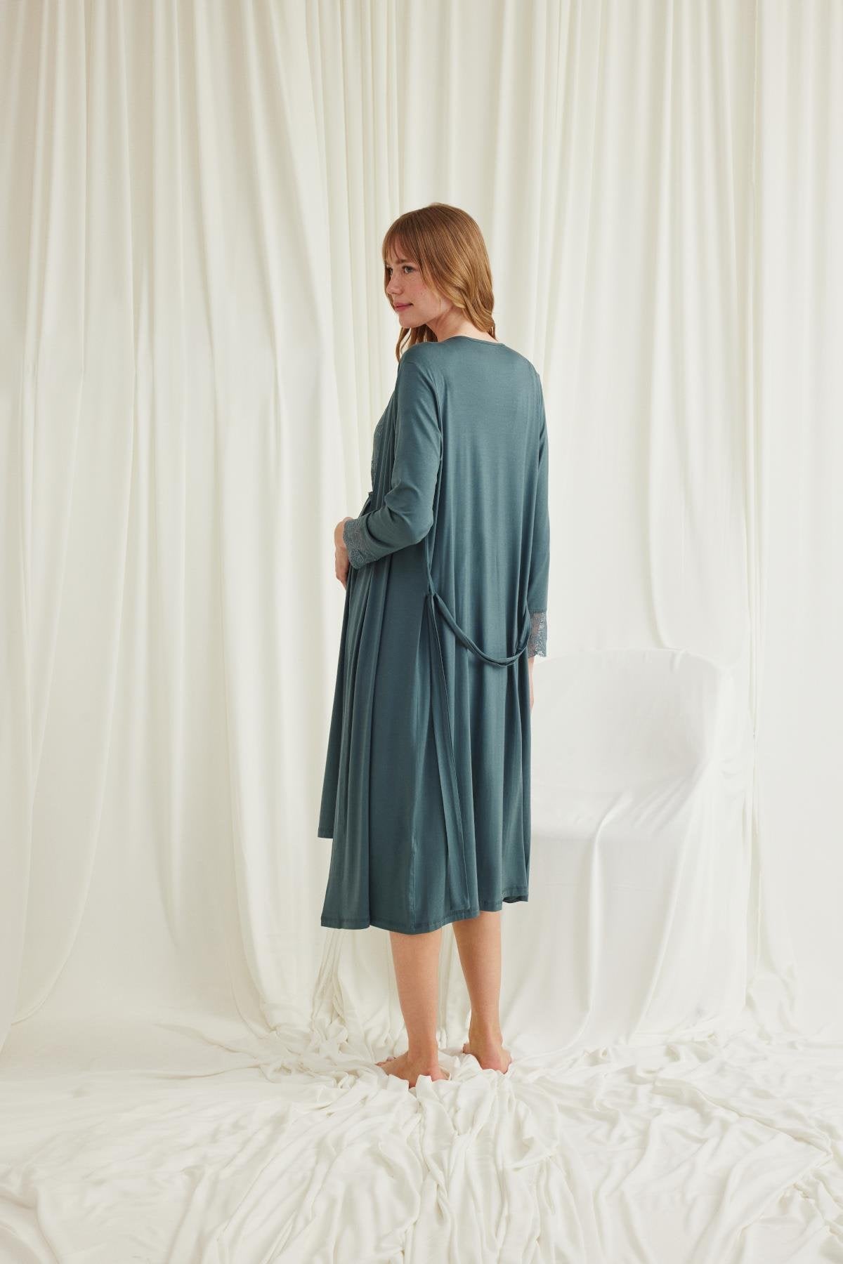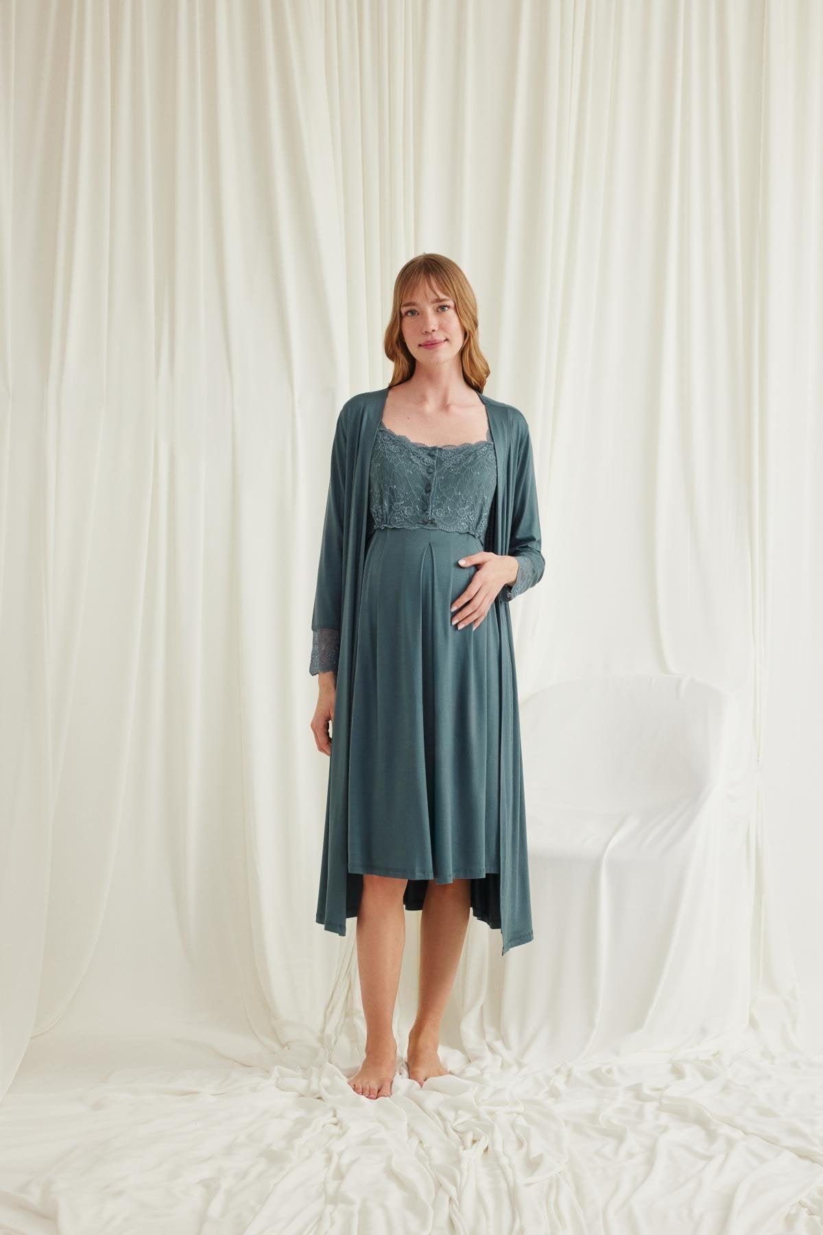 Önden Düğmeli Dantelli Sabahlıklı Lohusa Hamile Gecelik Takımı - 18534