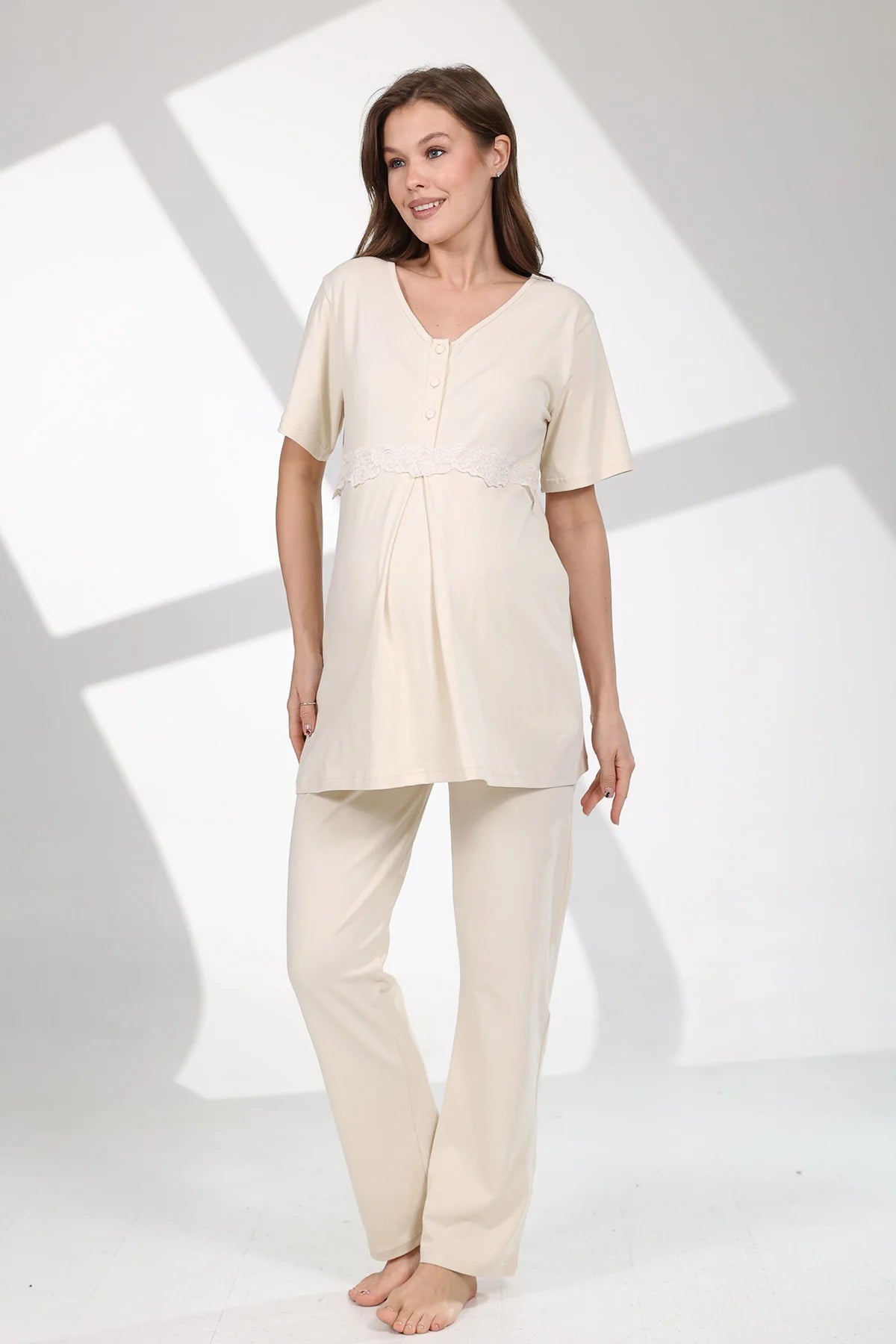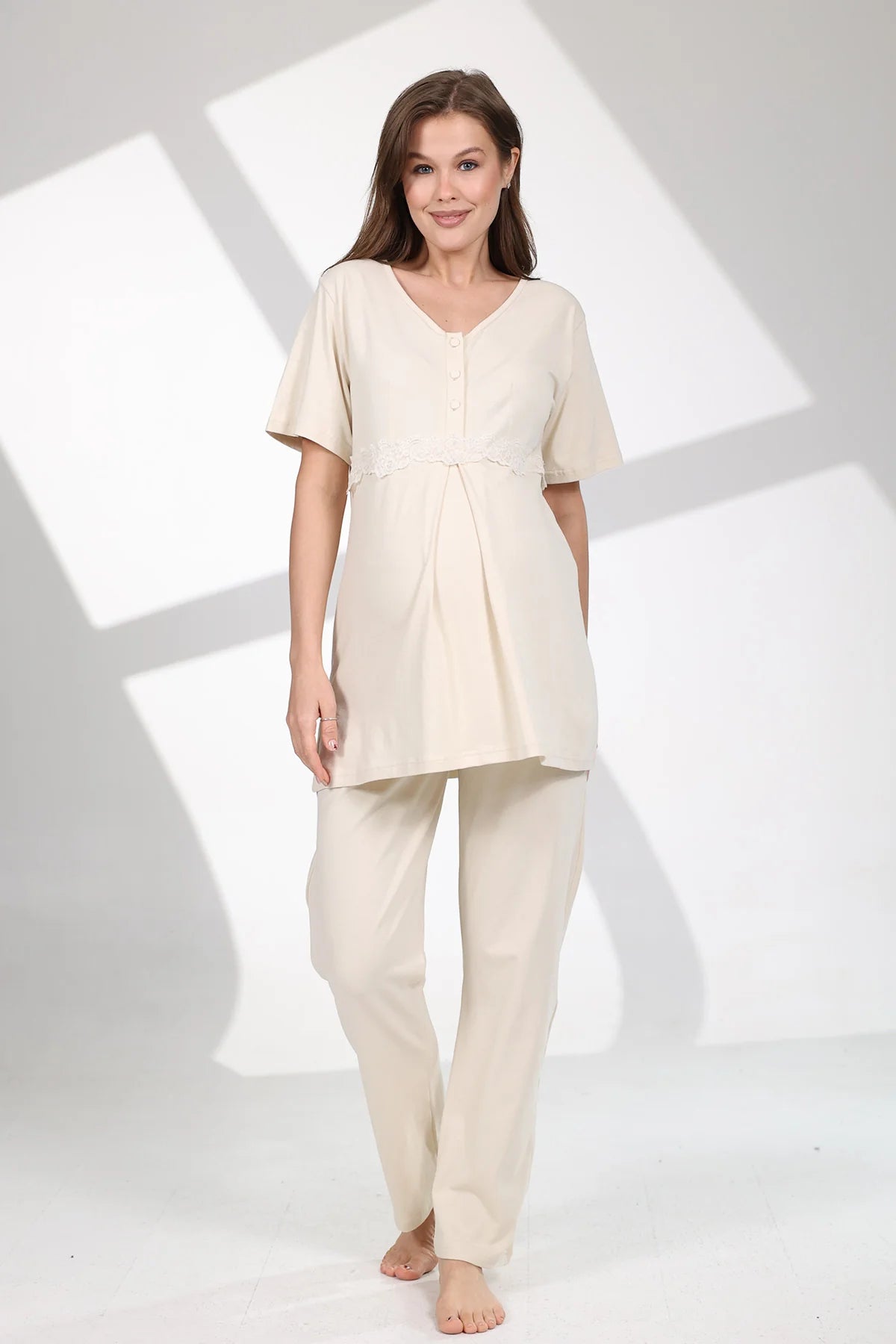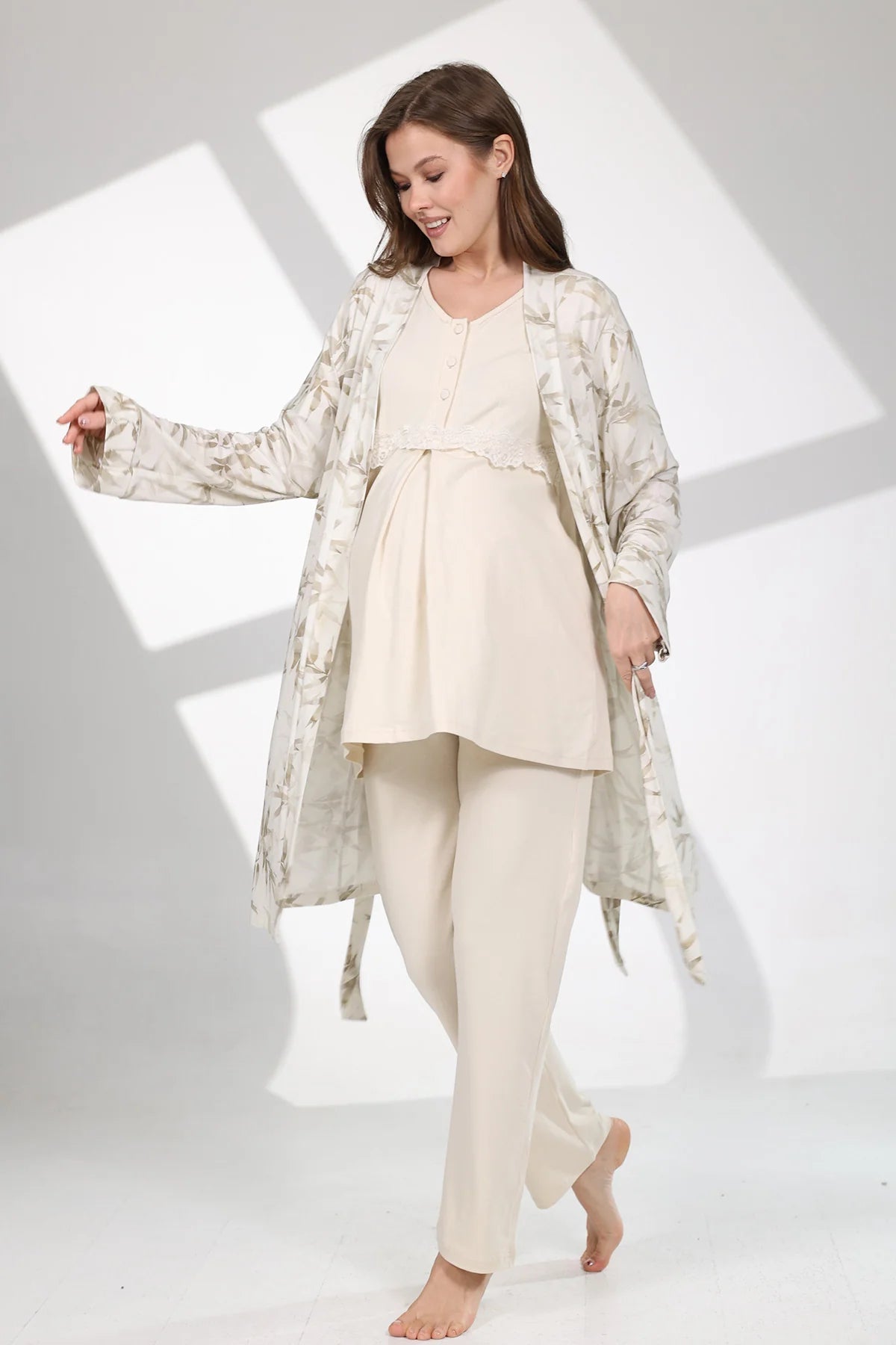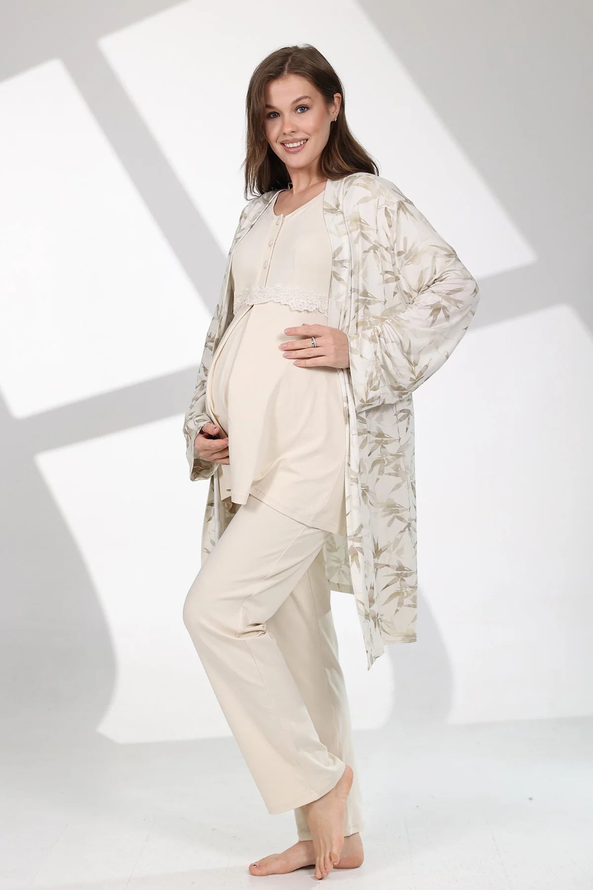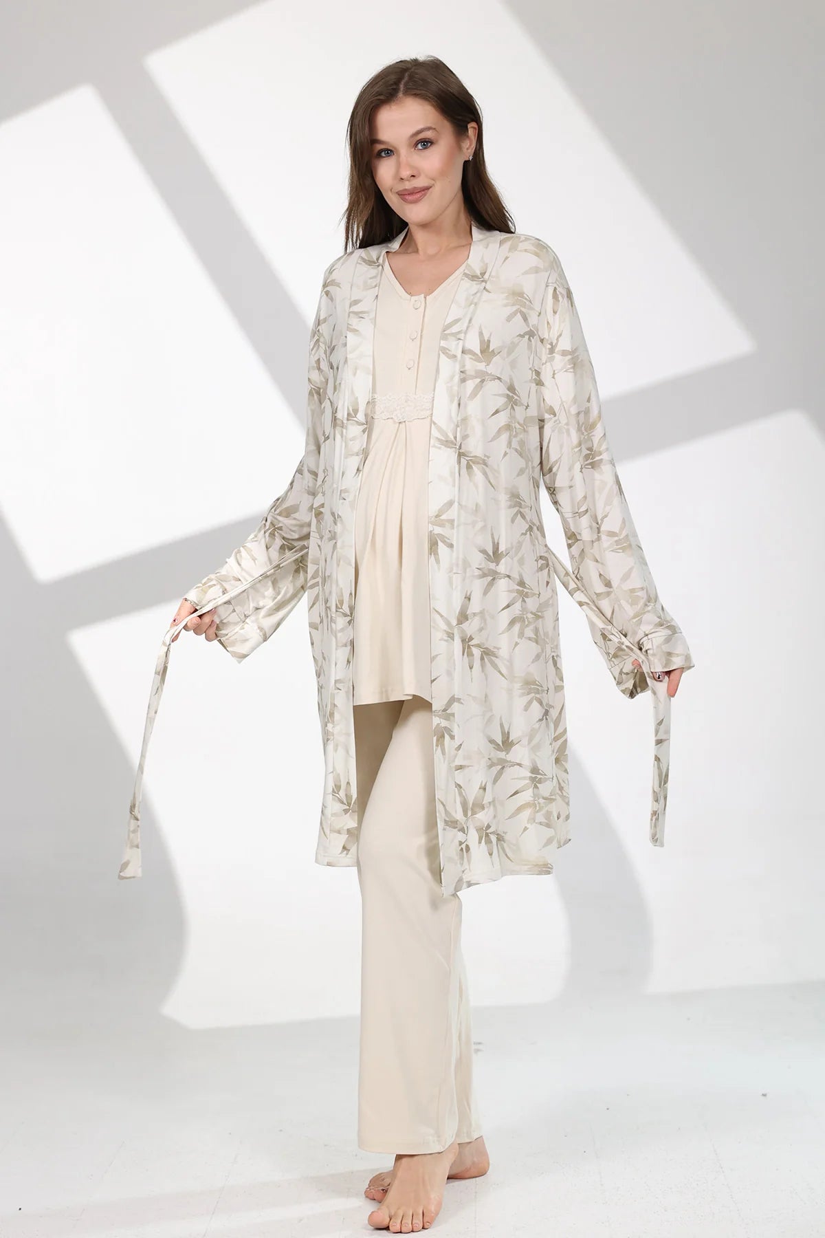 Önden Düğmeli Desenli Sabahlıklı Lohusa Hamile Pijama Takımı Bej - 711