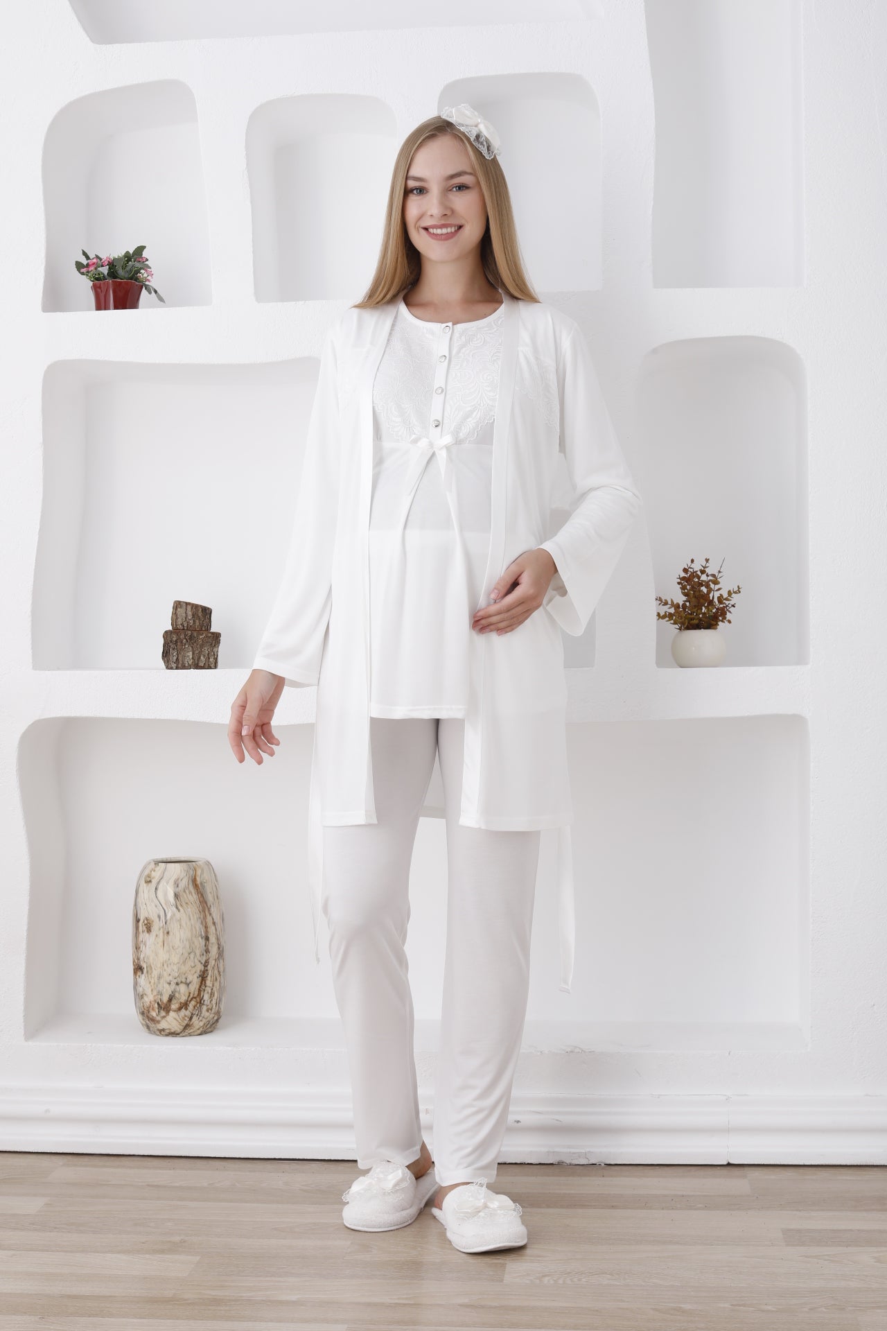 Önden Düğmeli Güpürlü Sabahlıklı Lohusa Pijama Takımı - 3425