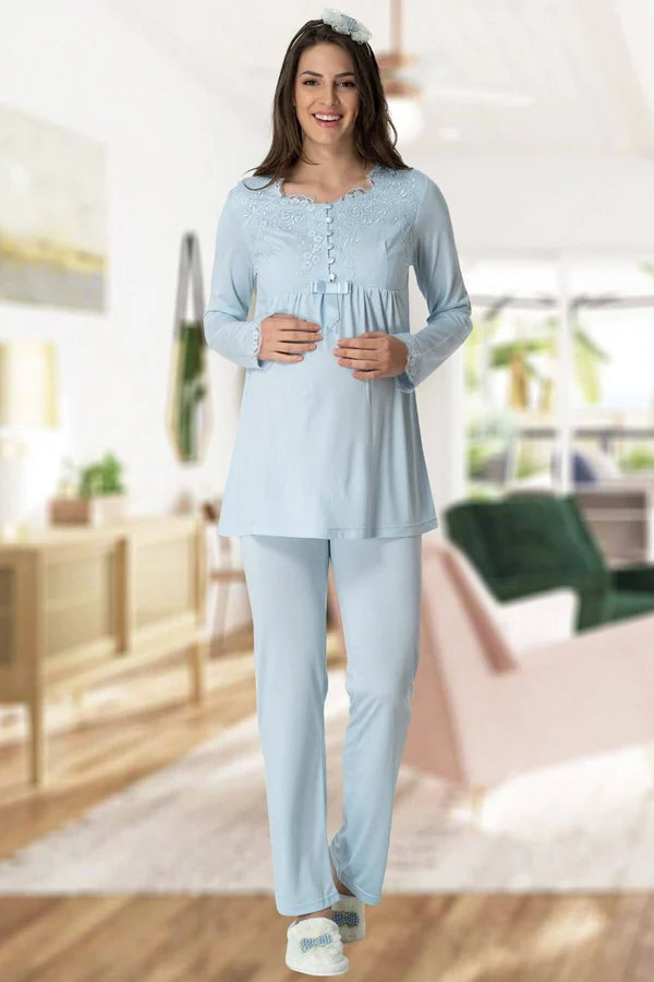 Önden Düğmeli Lohusa Hamile Pijama Takımı – Mavi ile stilinizden ödün vermeyin.