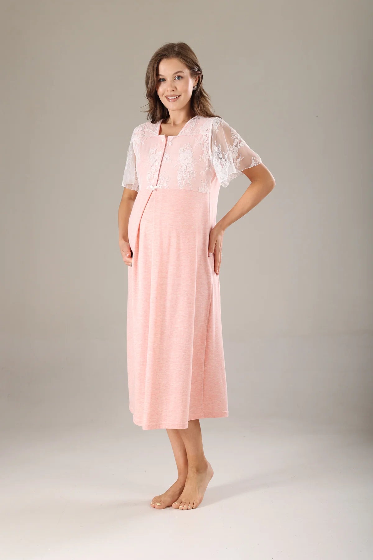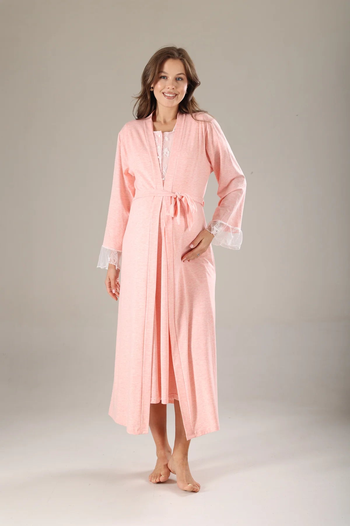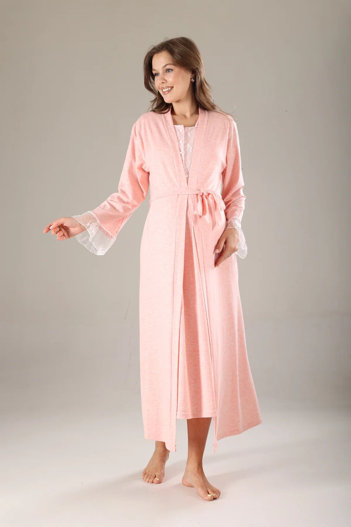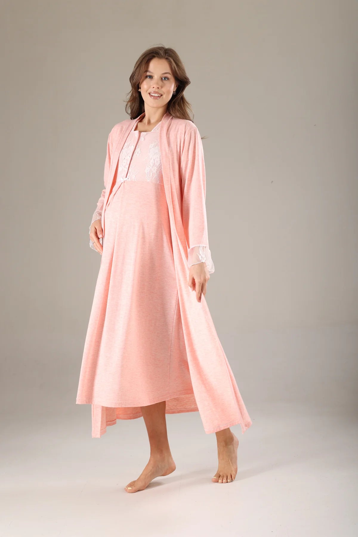 Pembe Melanj Dantel Tasarımlı Sabahlıklı Lohusa Gecelik Takımı - 803