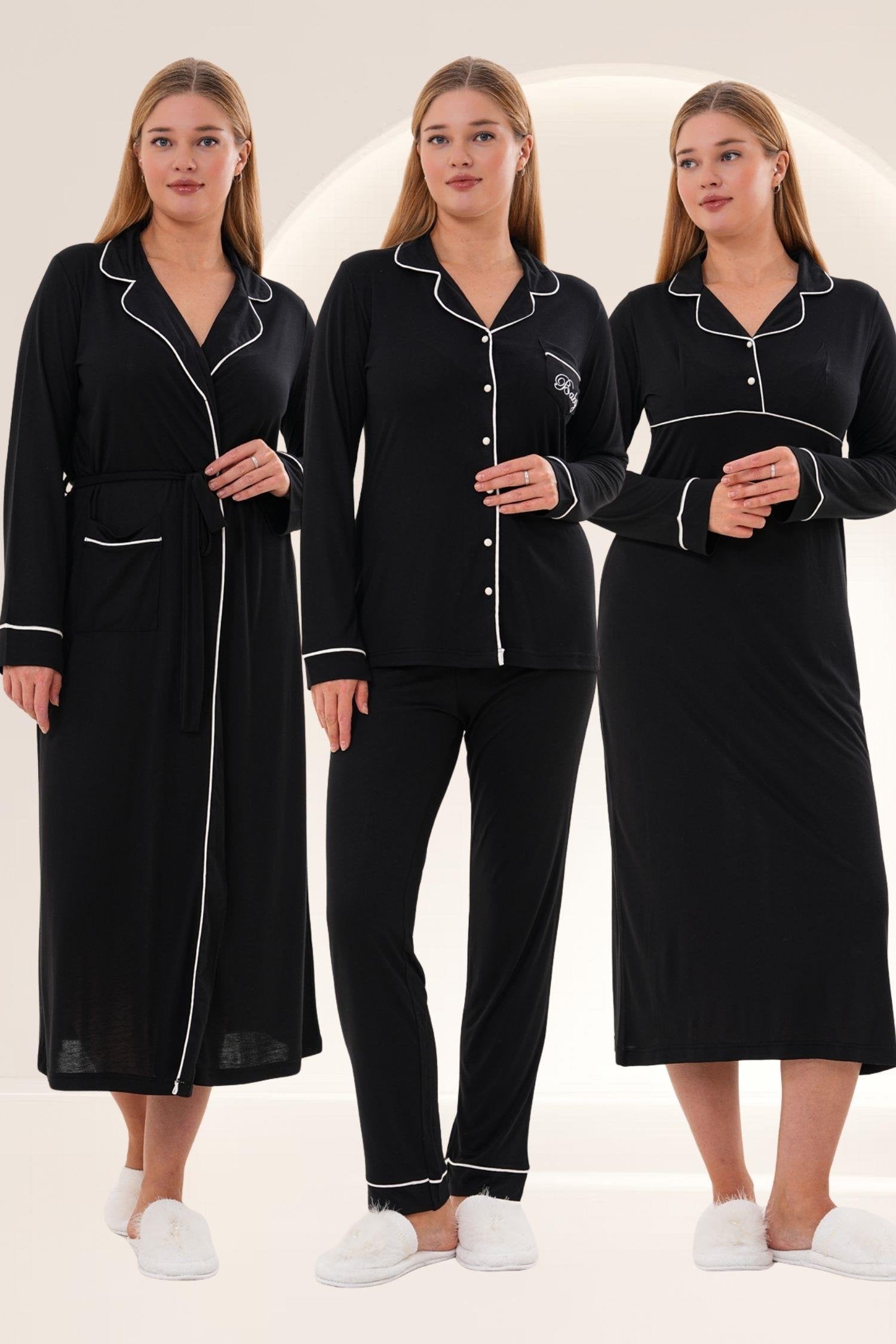 Sabahlık Gecelik Pijama 4'lü Set Siyah - 6335