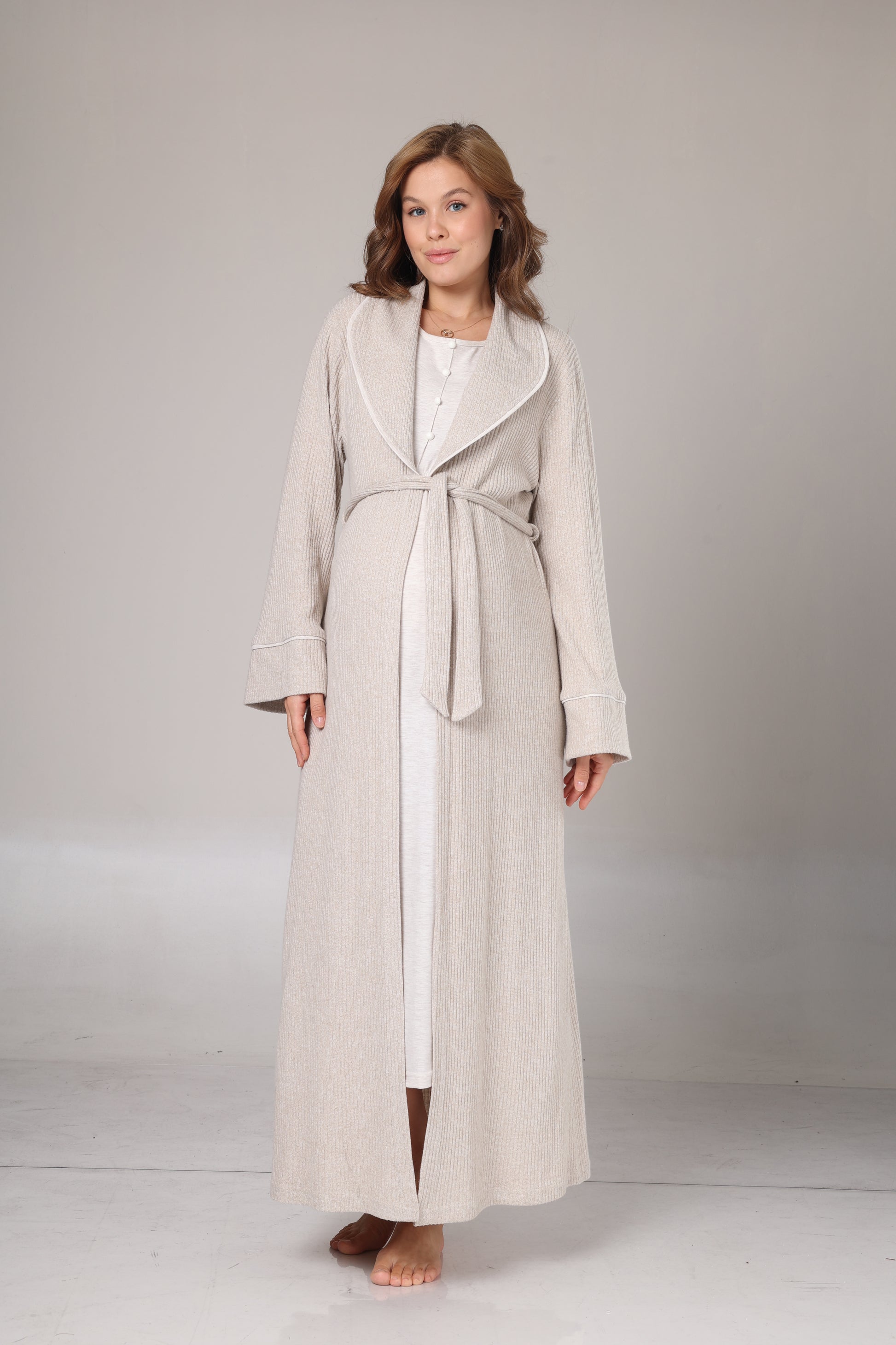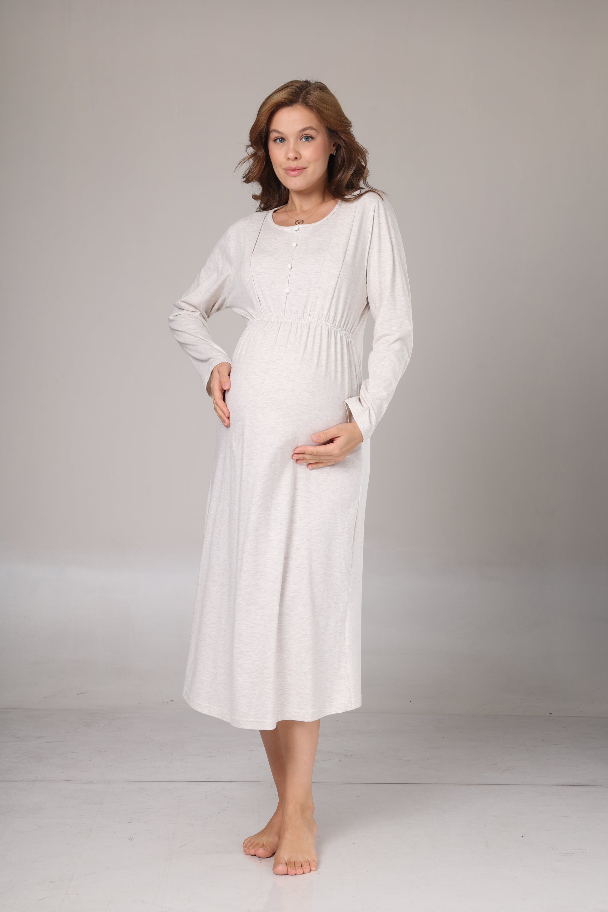 Triko Yumuşak Dokulu Sabahlıklı Emzirme Düğmeli Gecelik Takımı Bej - 1020