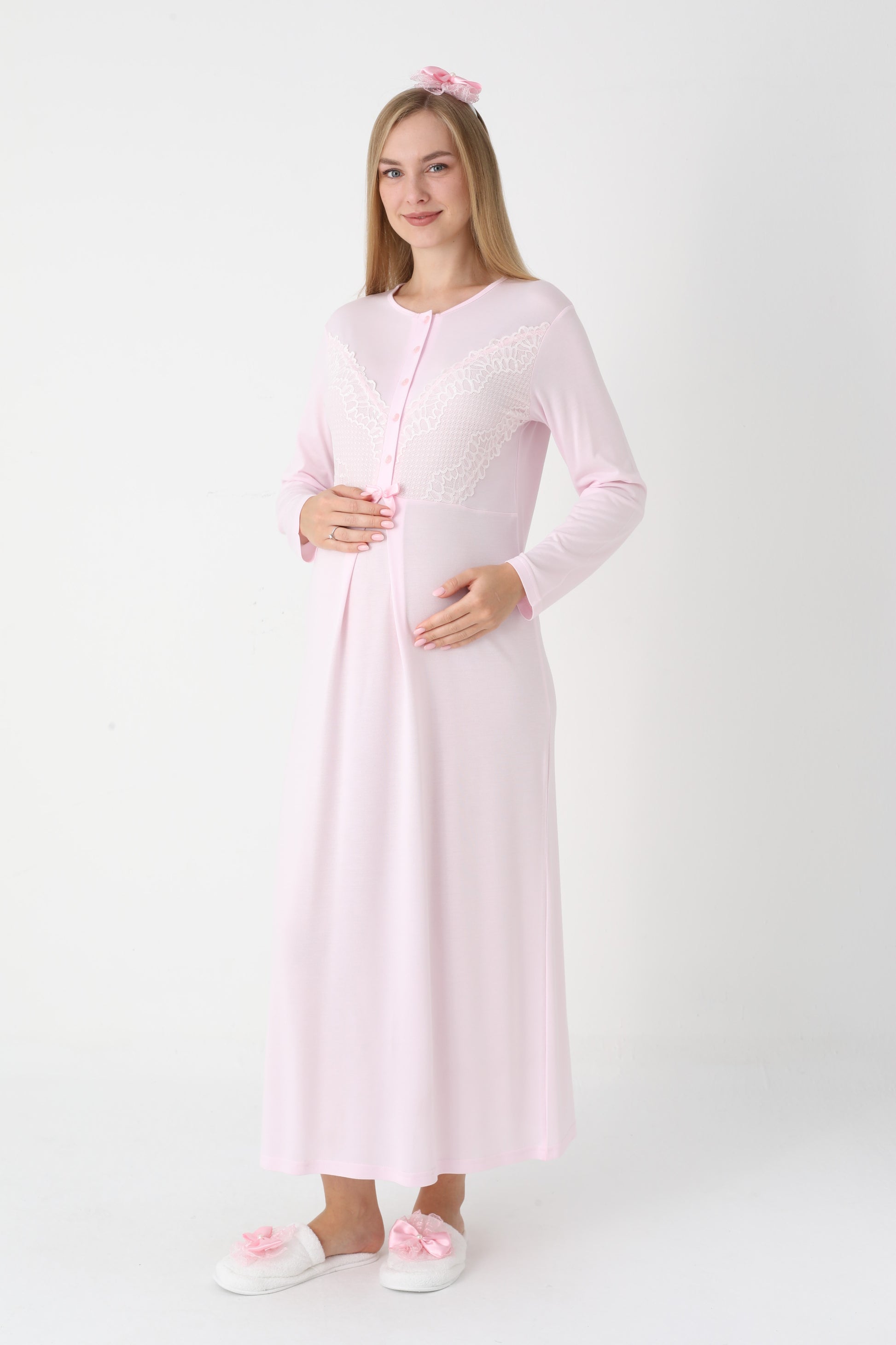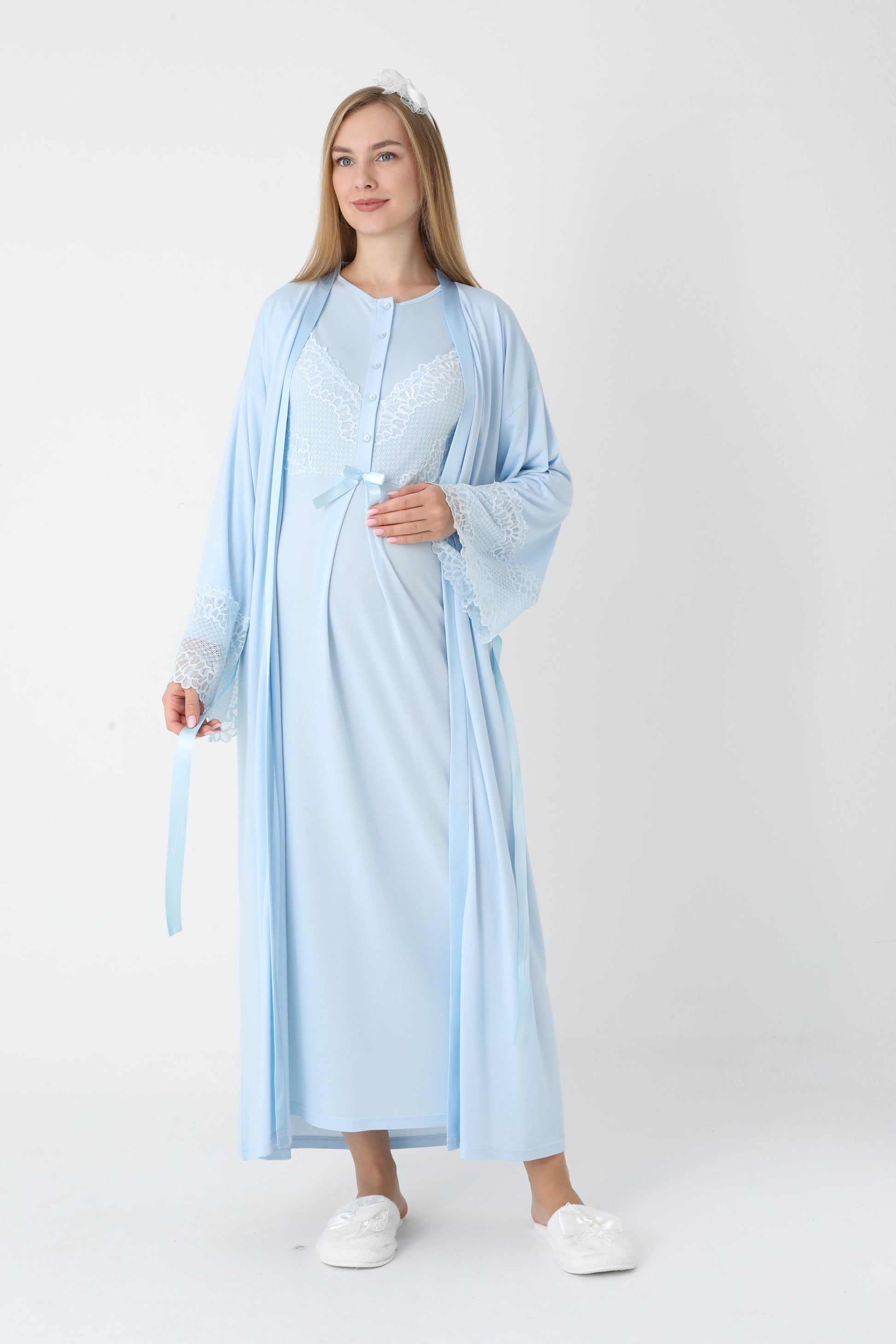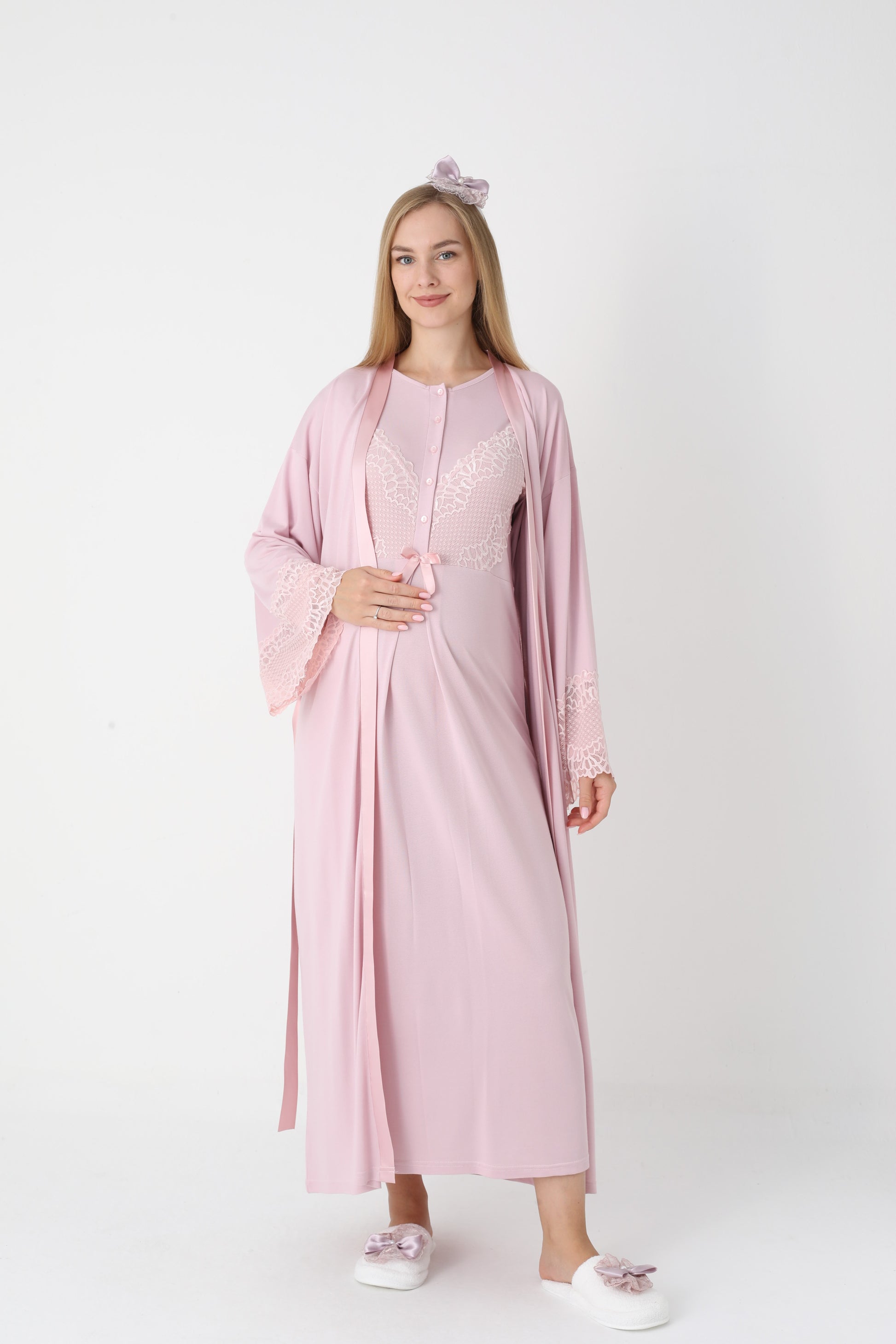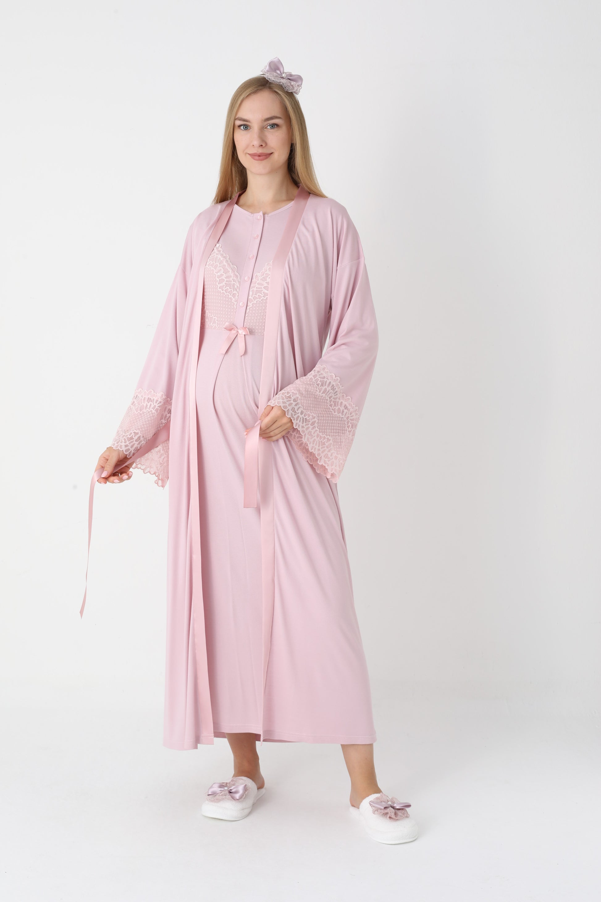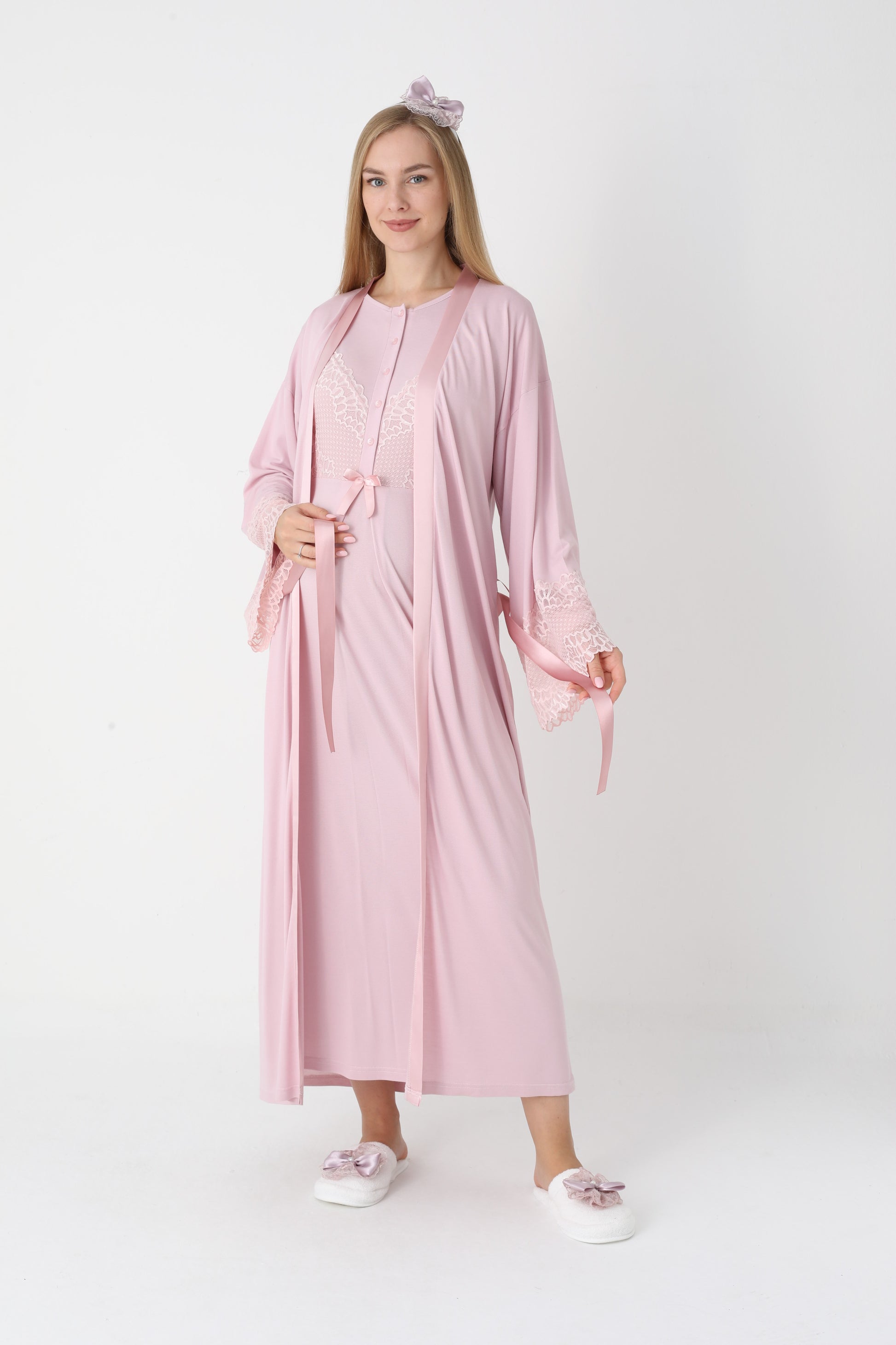 Uzun Kollu Dantel Detaylı Önden Düğmeli Sabahlıklı Lohusa Hamile Gecelik -2304