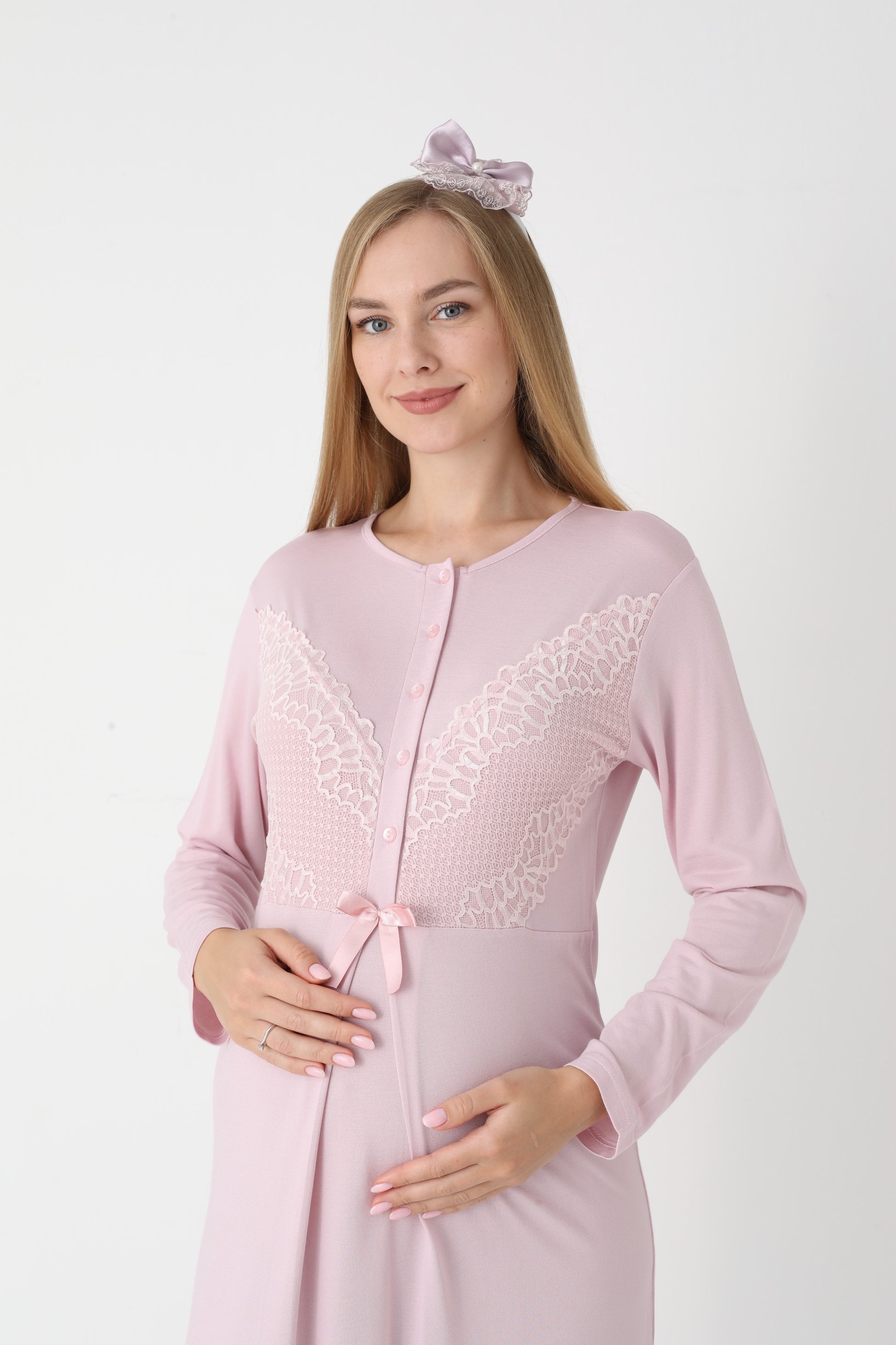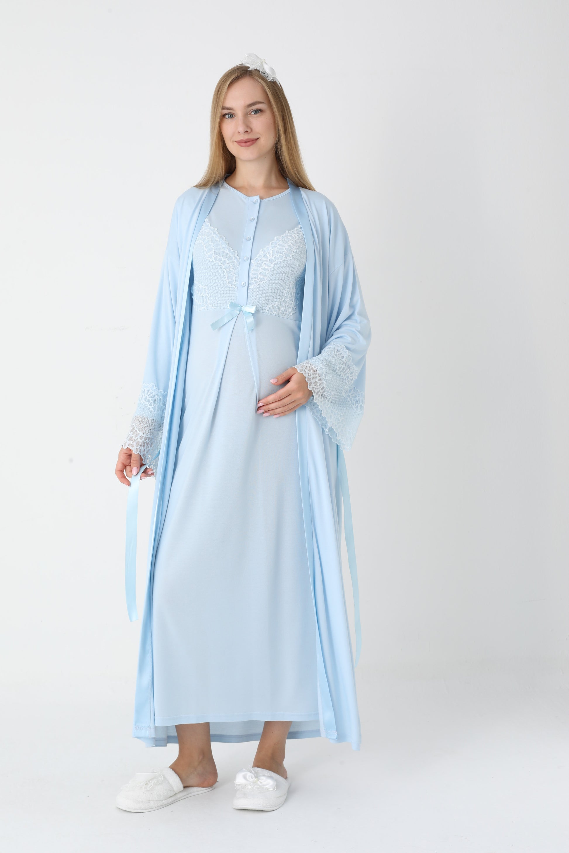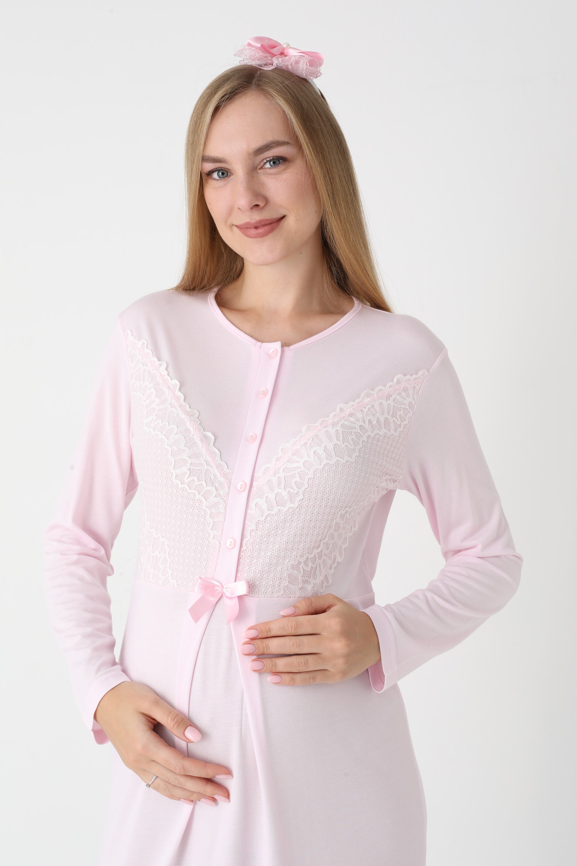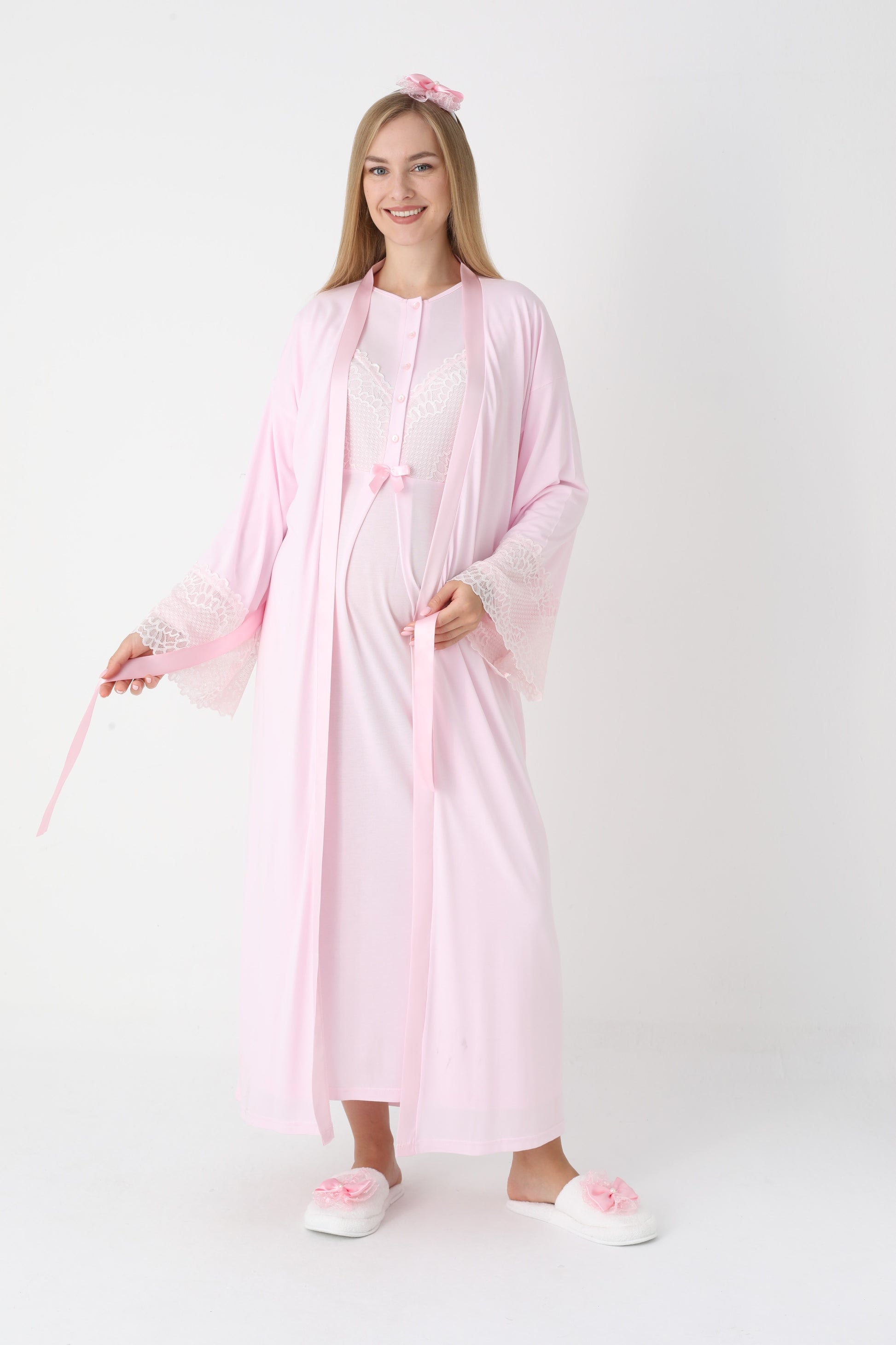 Uzun Kollu Dantel Detaylı Önden Düğmeli Sabahlıklı Lohusa Hamile Gecelik -2304