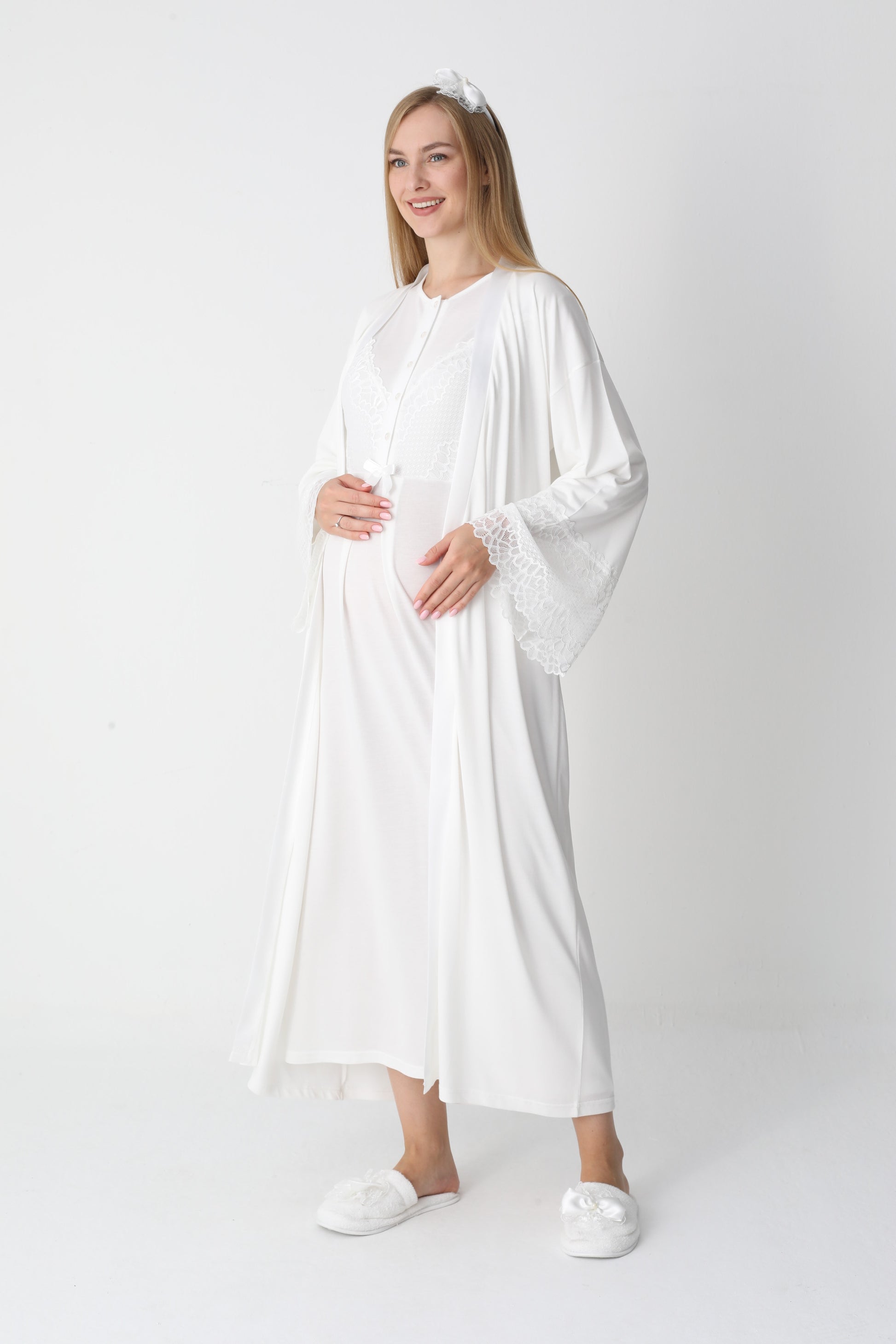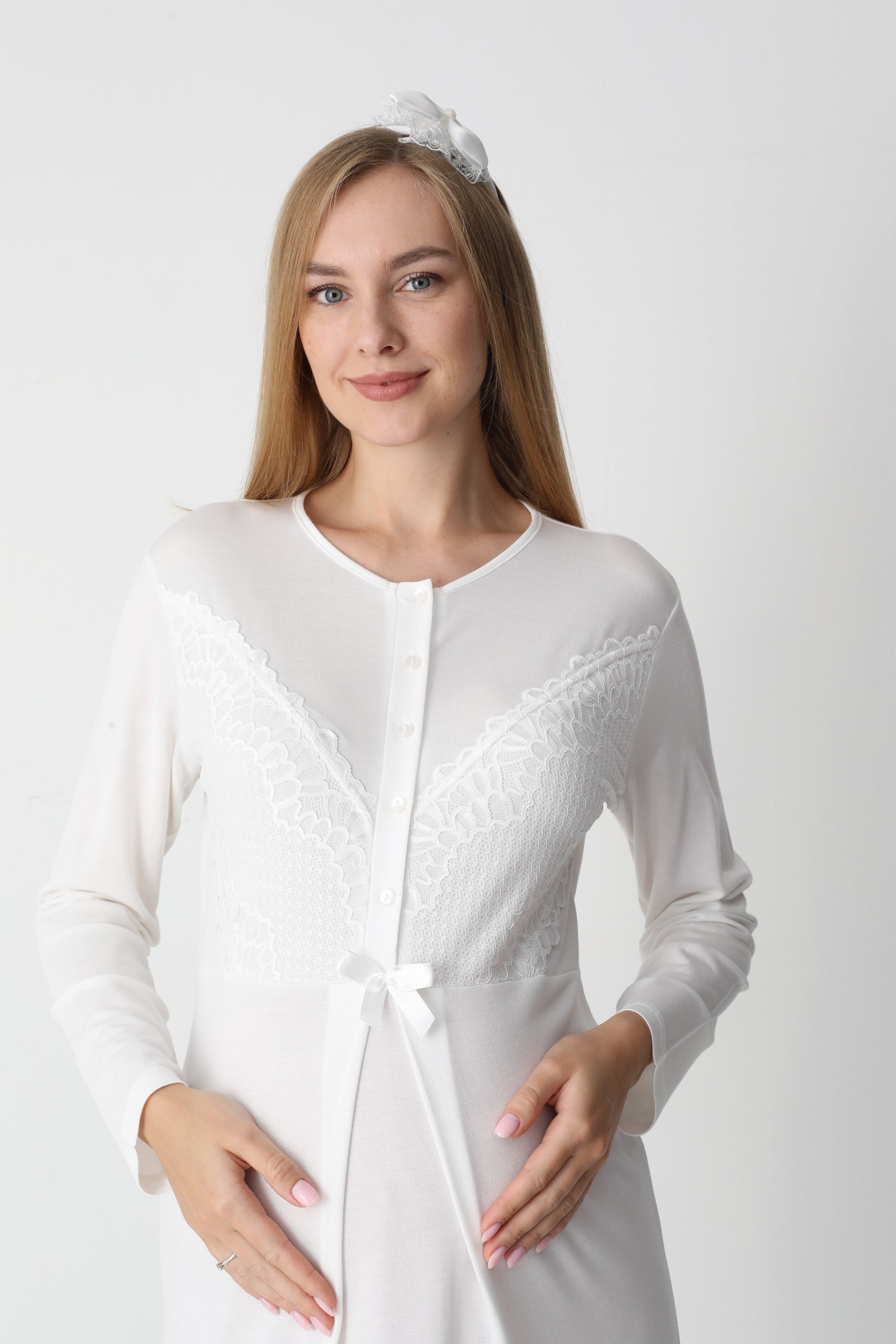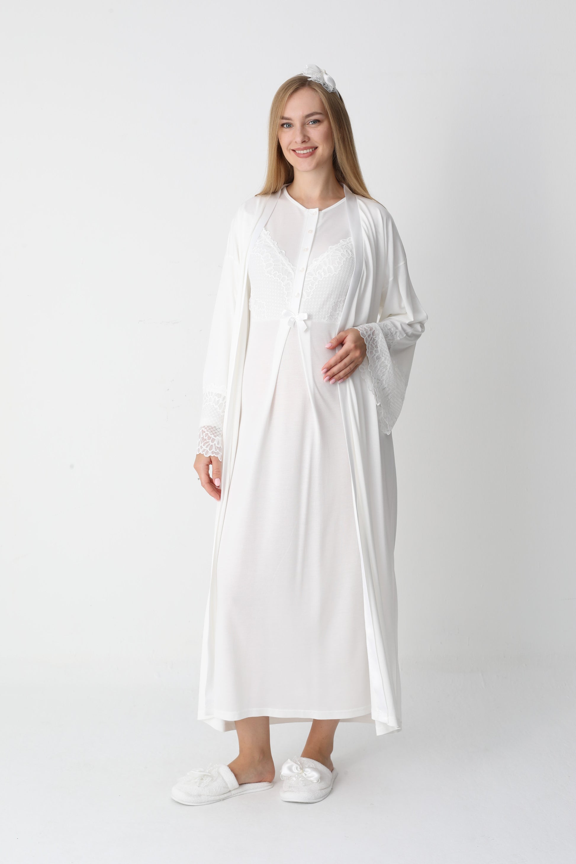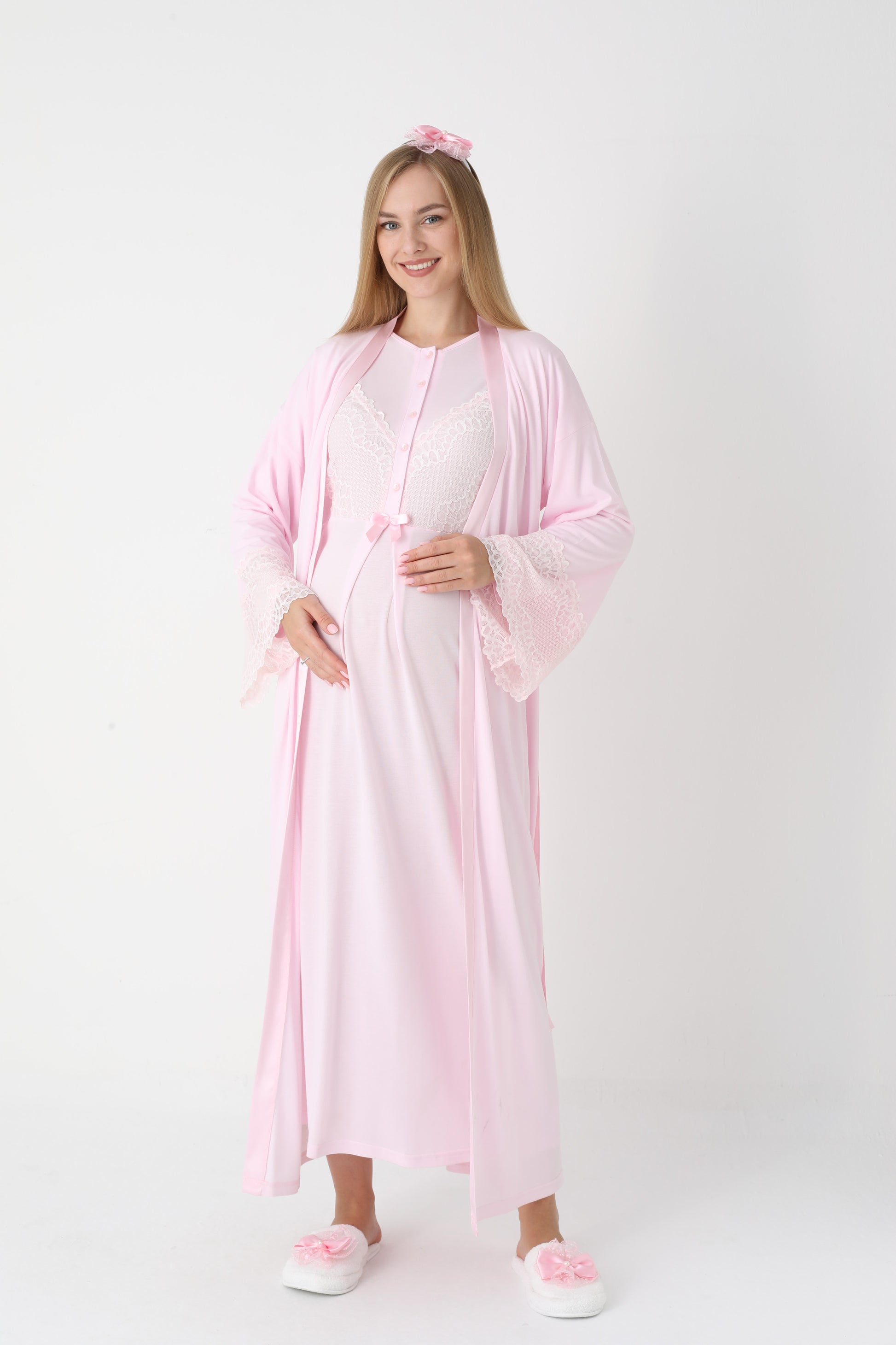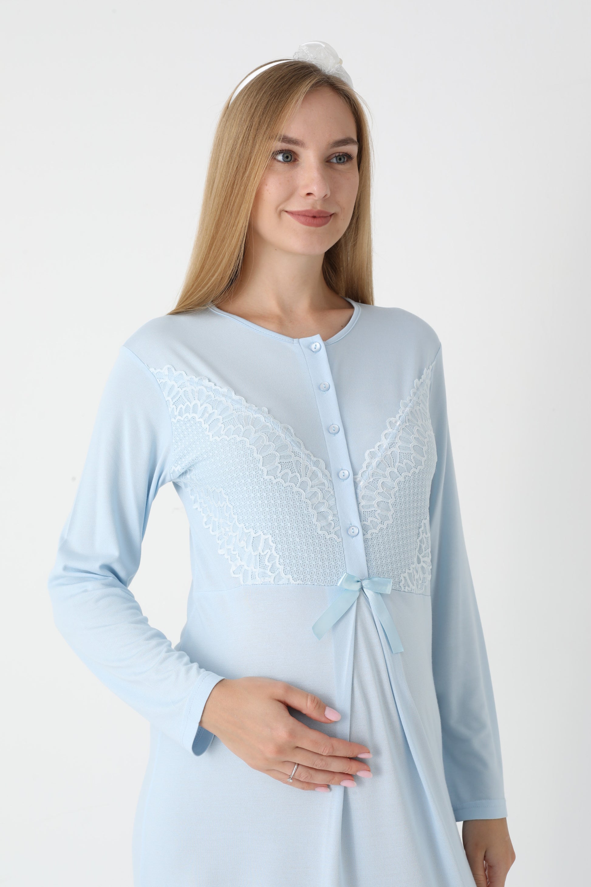 Uzun Kollu Dantel Detaylı Önden Düğmeli Sabahlıklı Lohusa Hamile Gecelik -2304