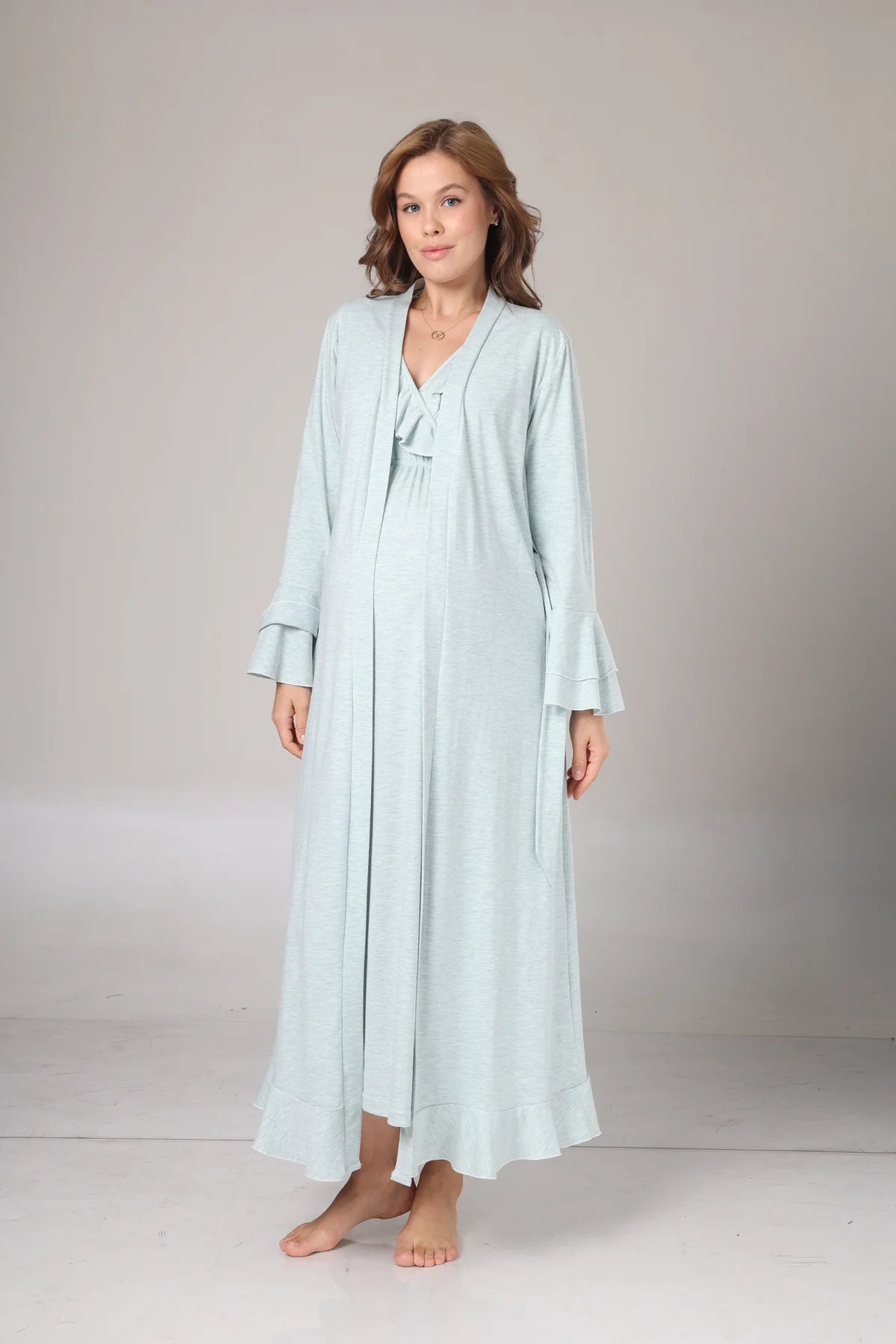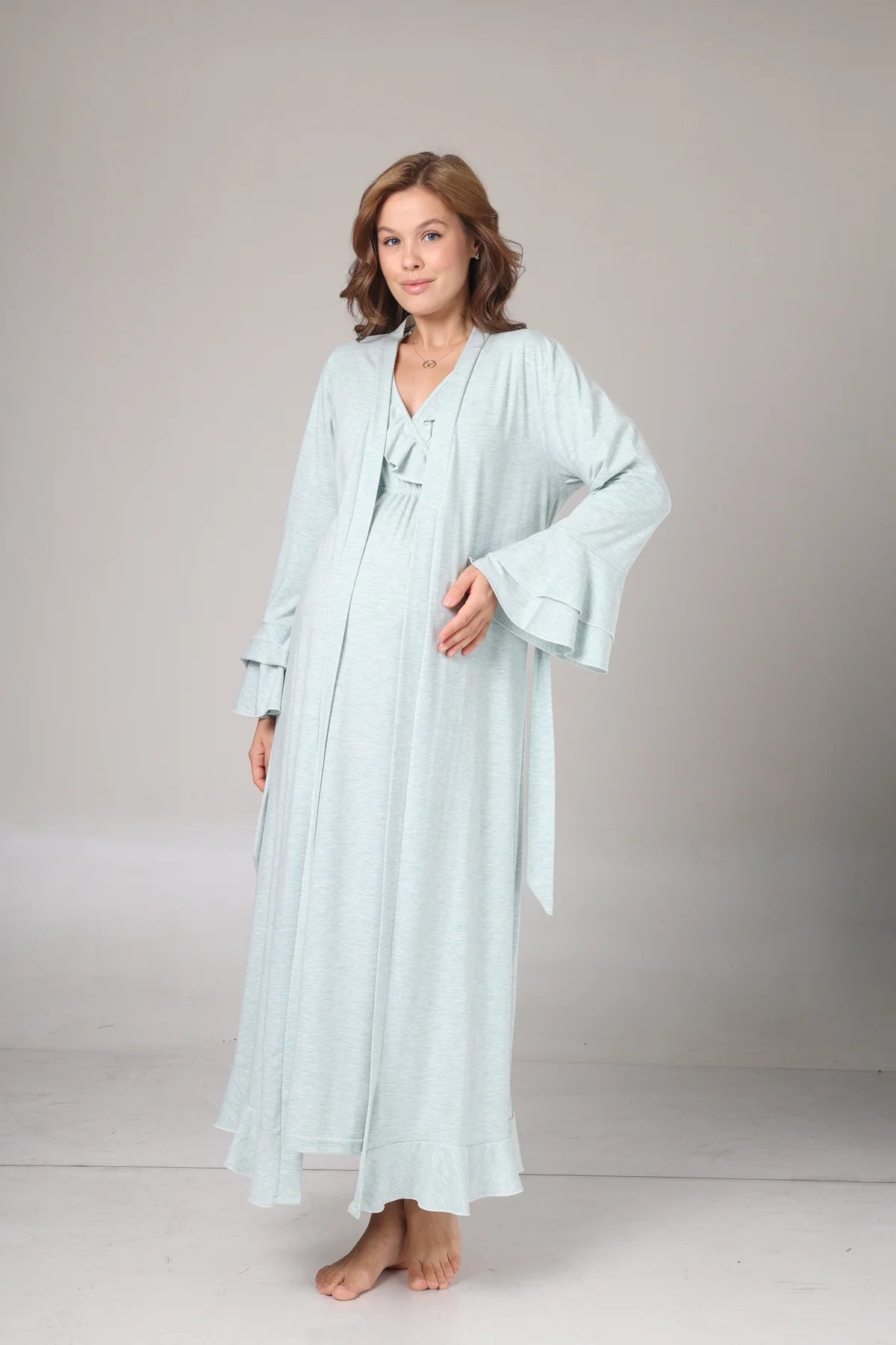 Doğum öncesi ve sonrası kullanım için ideal, konforlu ve şık sabahlıklı lohusa gecelik takımı. Emzirme kolaylığı sunan pratik yapısı ve yumuşak dokusuyla hem hastane çıkışı hem evde kullanım için uygundur.