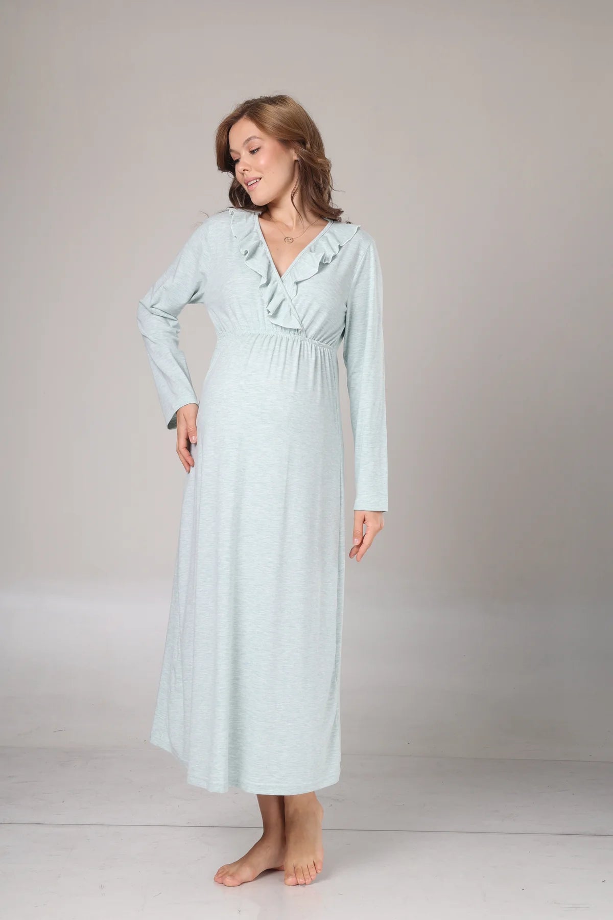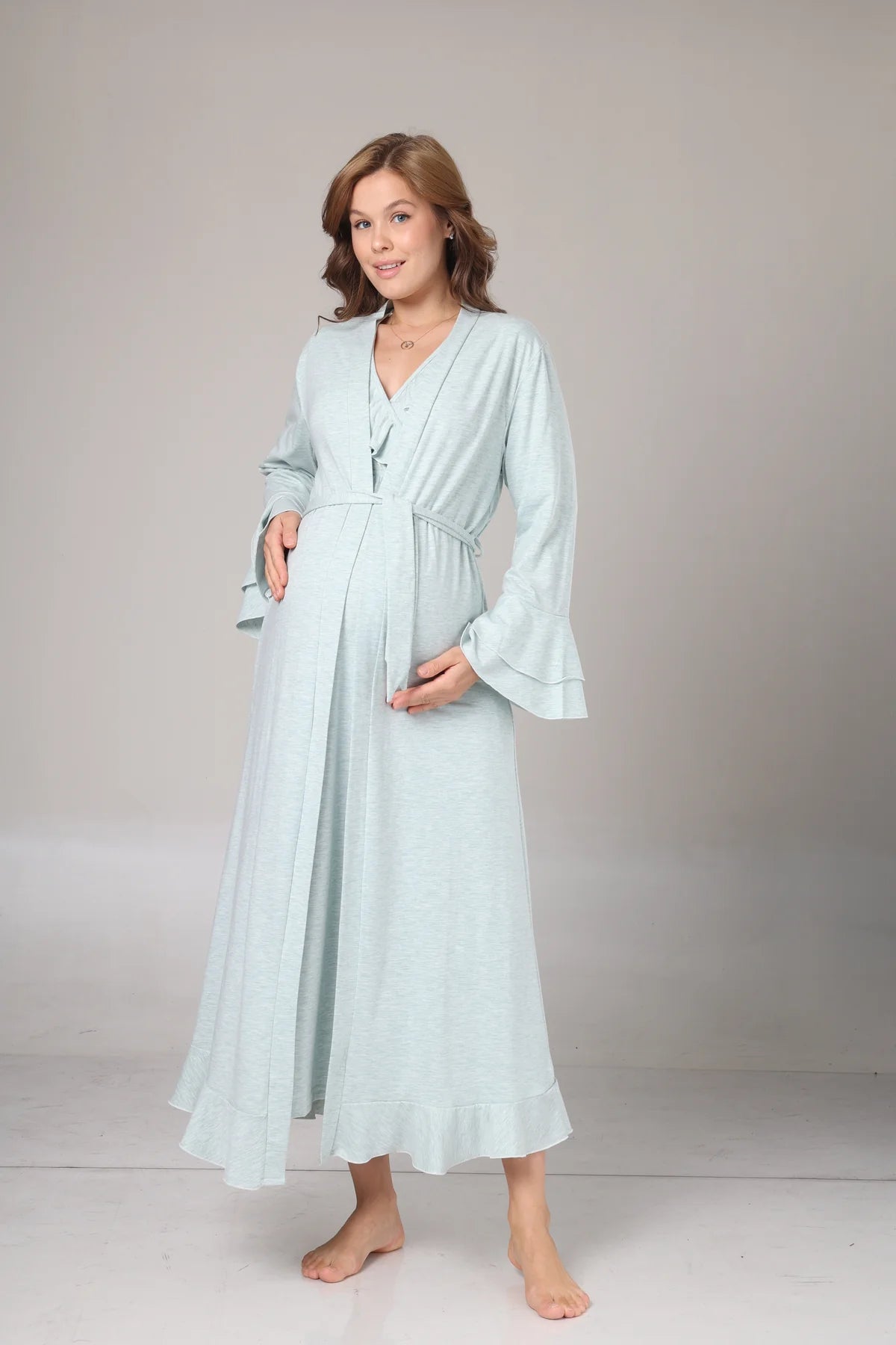 Uzun Kollu Kruvaze Sabahlıklı Lohusa Gecelik Takımı Su Yeşili -1027