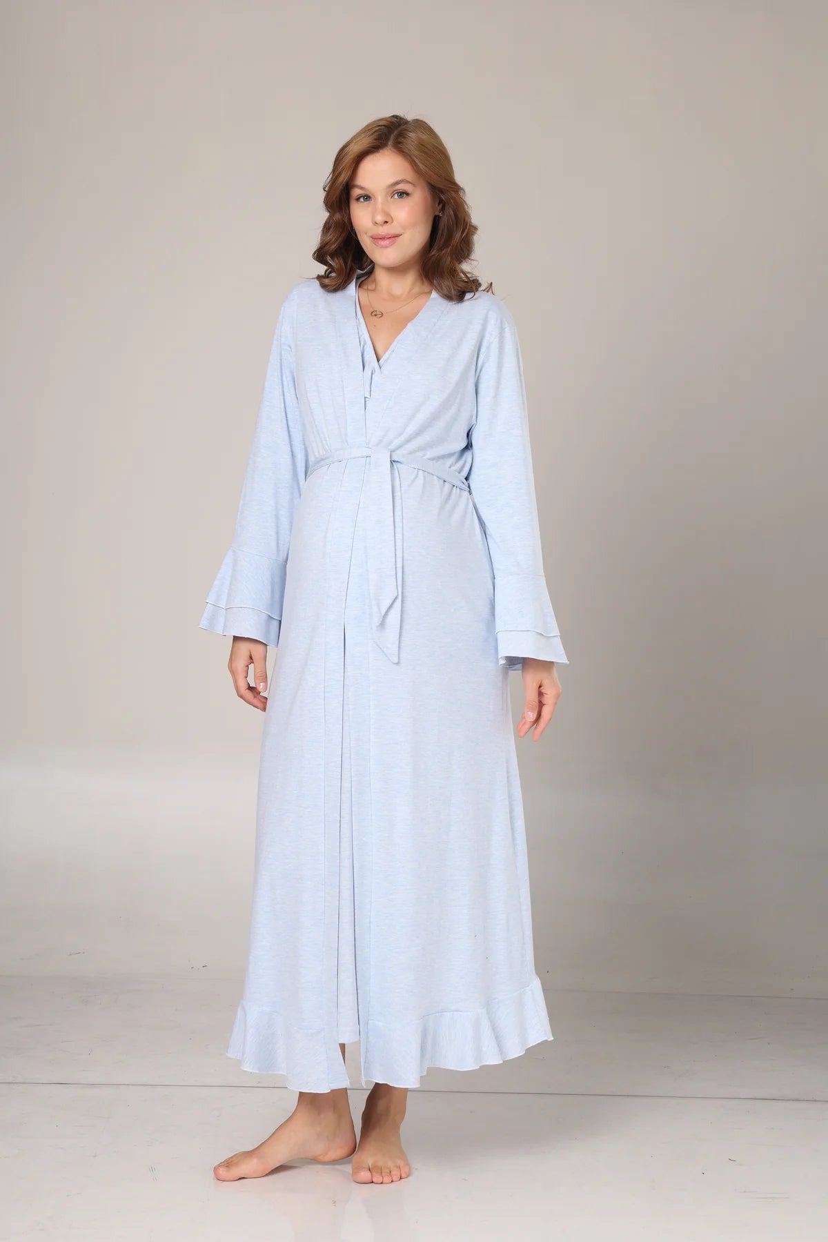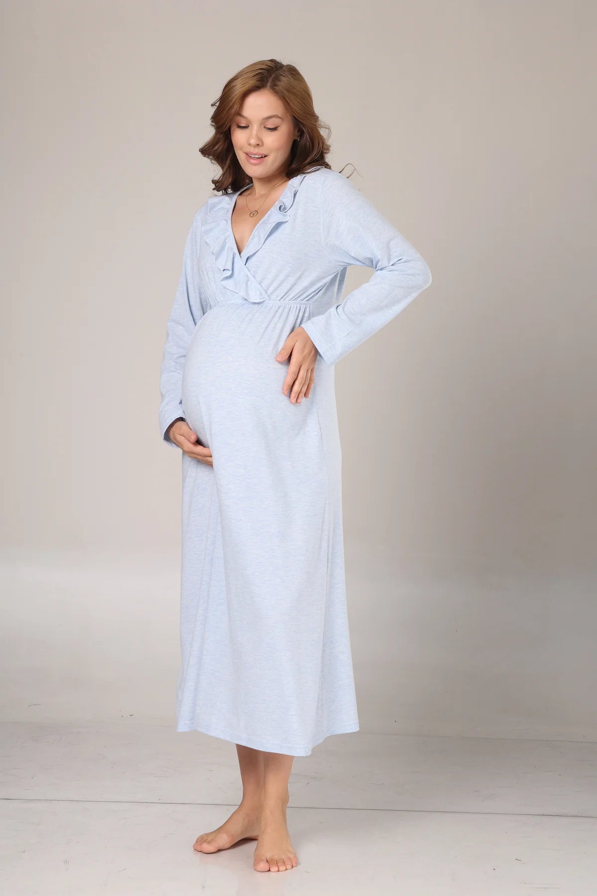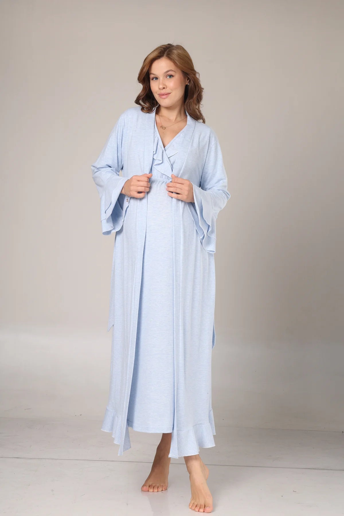 Uzun Kollu Yumuşak Dokulu Kruvaze Sabahlıklı Lohusa Gecelik Takımı Mavi -1029
