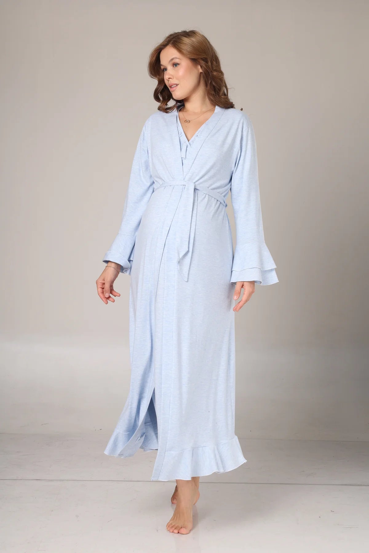 Doğum öncesi ve sonrası kullanım için ideal, konforlu ve şık sabahlıklı lohusa gecelik takımı. Emzirme kolaylığı sunan pratik yapısı ve yumuşak dokusuyla hem hastane çıkışı hem evde kullanım için uygundur.