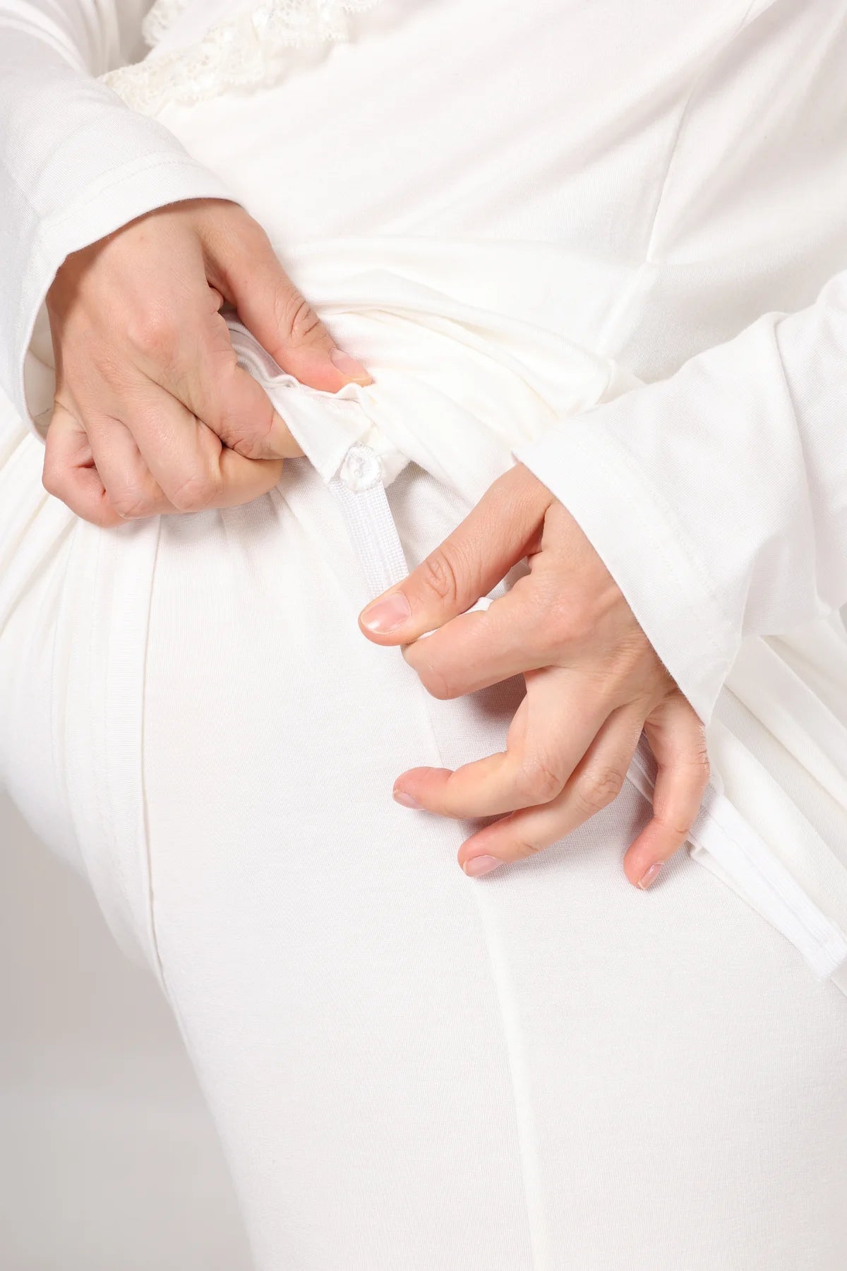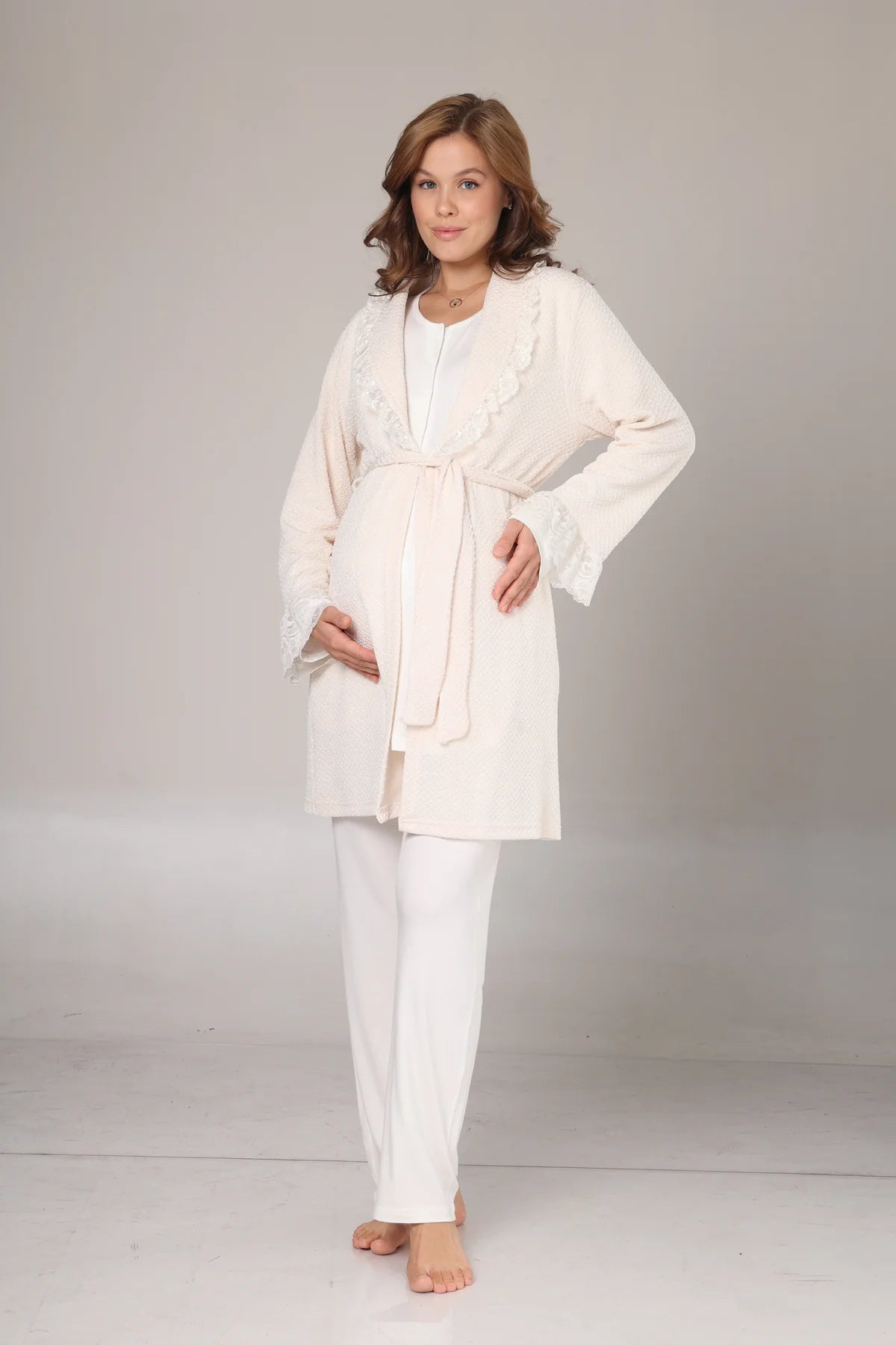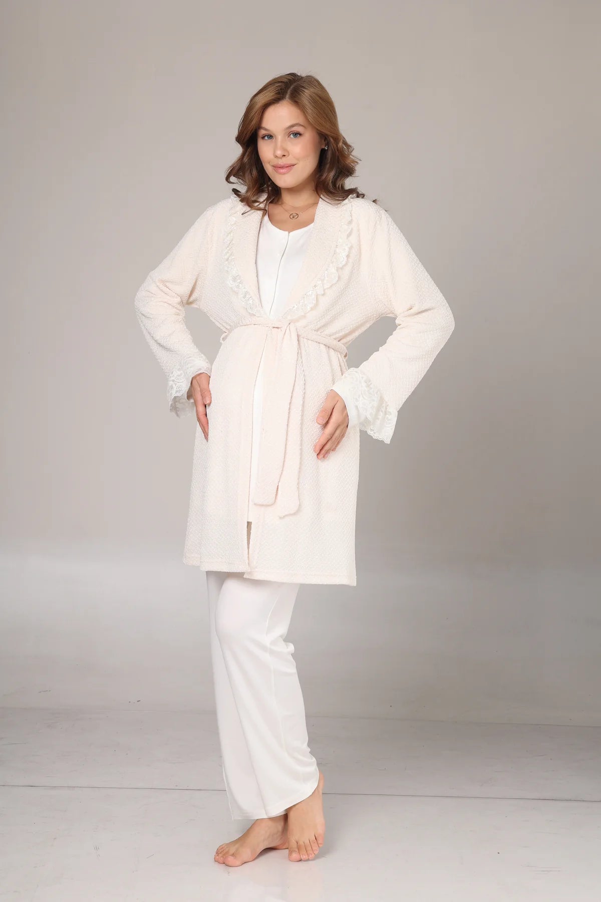 Yakası Fırfırlı Kışlık Sabahlıklı Lohusa Hamile 3'Lü Pijama Takımı Krem-1010