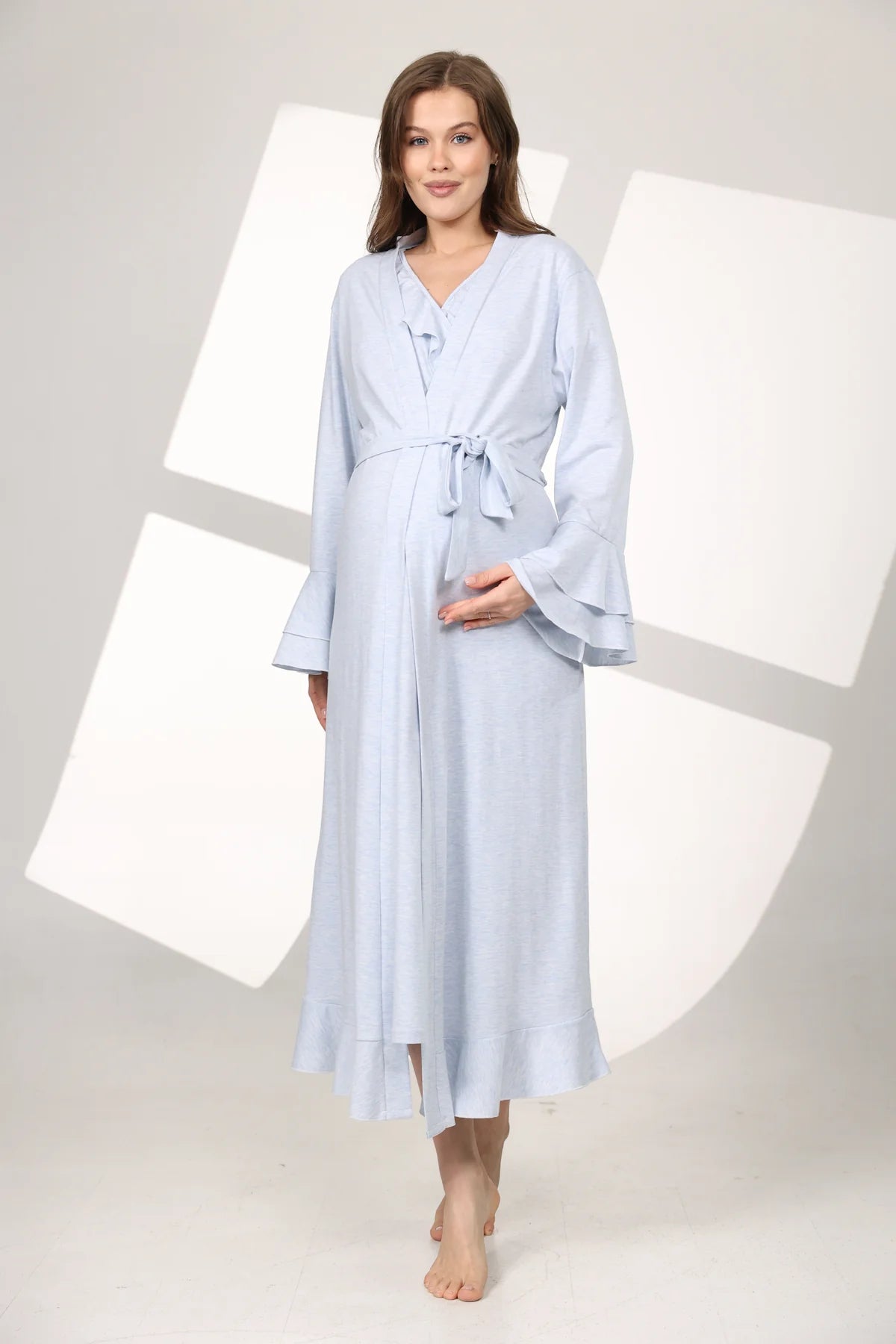 Yumuşak Dokulu Kruvaze Sabahlıklı Lohusa Hamile Gecelik Takımı Mavi - 589