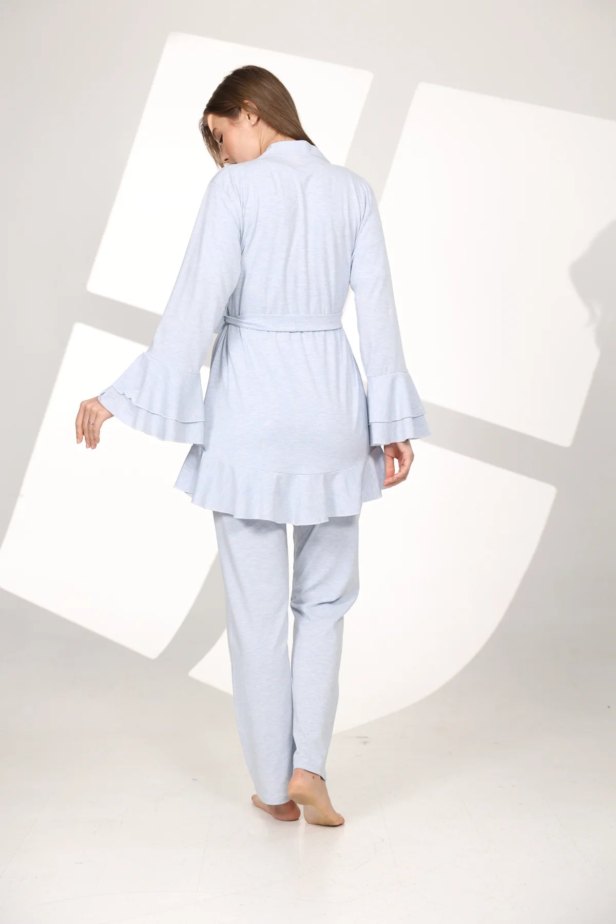 Doğum öncesi ve sonrası kullanım için ideal, konforlu ve şık sabahlıklı lohusa Pijama takımı. Emzirme kolaylığı sunan pratik yapısı ve yumuşak dokusuyla hem hastane çıkışı hem evde kullanım için uygundur.